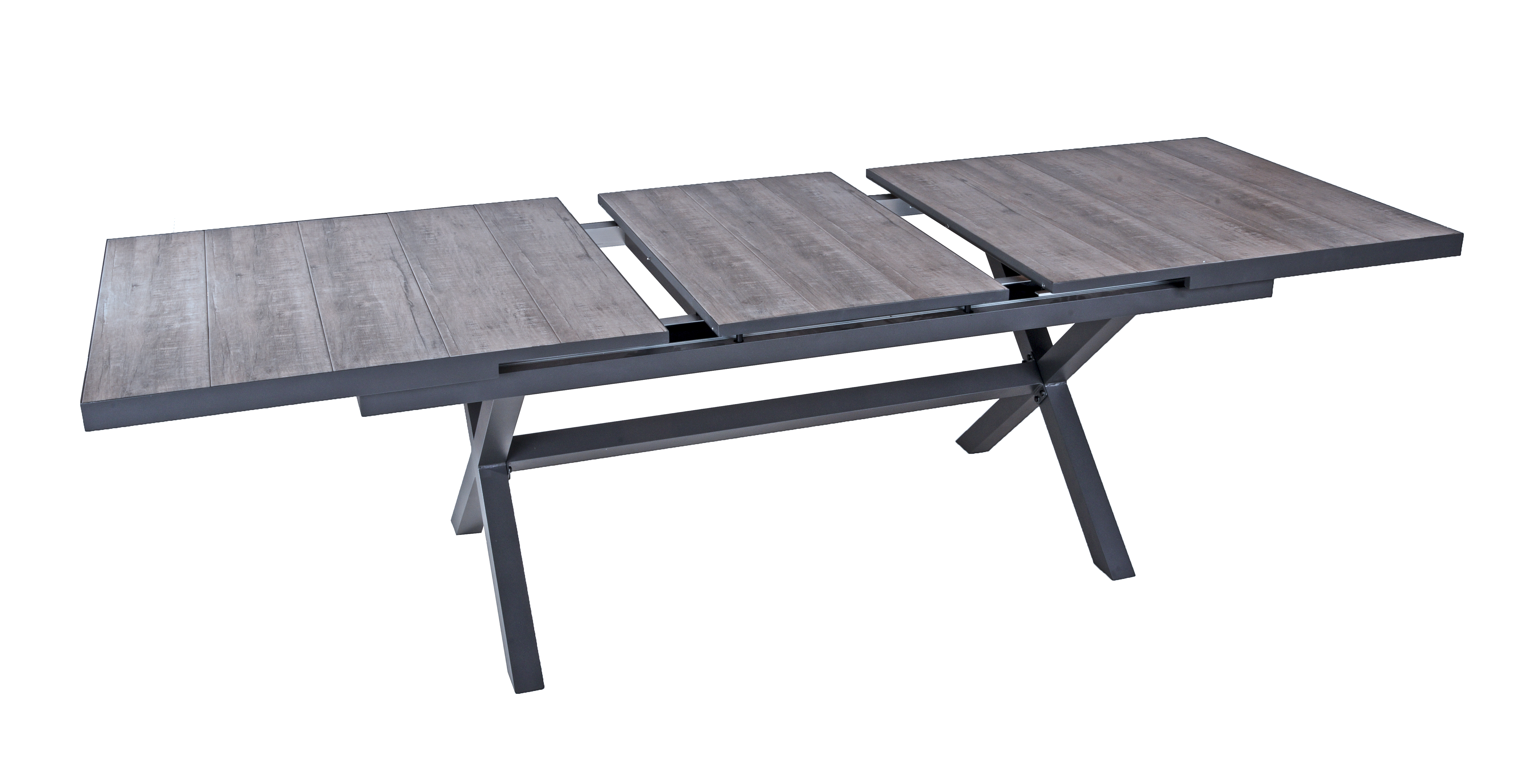 Die Tischgruppe RANA bietet eine elegante Lösung für Ihre Outdoor-Essbedürfnisse. Der Ausziehtisch RANA besteht aus robustem, dunkelgrauem Aluminium und ist mit einer strapazierfähigen Tischplatte aus Keramik in Eiche-Optik ausgestattet. Diese Kombination aus Materialien verleiht dem Tisch nicht nur ein modernes Aussehen, sondern gewährleistet auch Langlebigkeit und Wetterbeständigkeit.