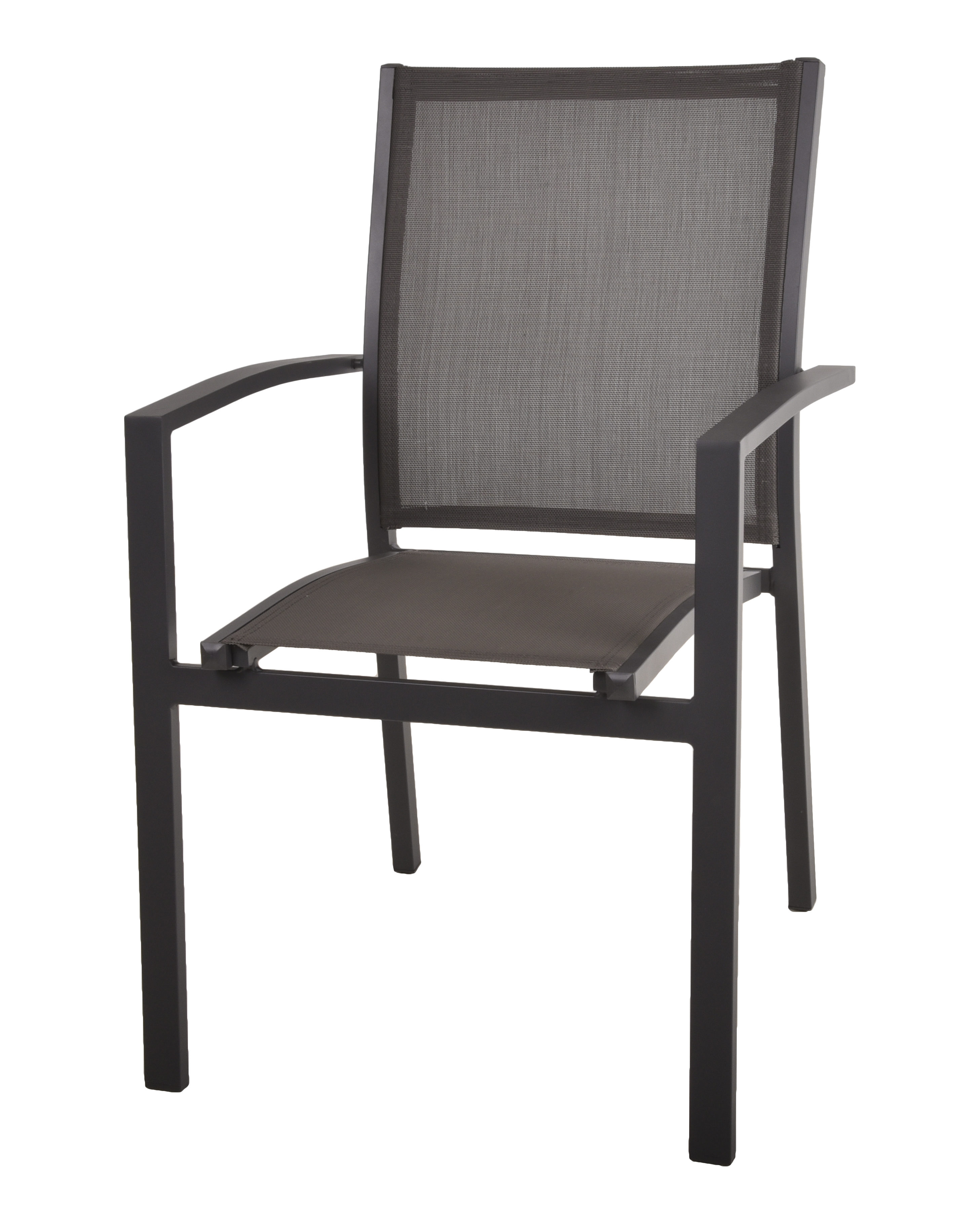 Die sechs Stapelstühle ELENA bestehen aus Aluminium und sind mit dunkelgrauem Kunststoffgewebe bezogen. Sie bieten hohen Sitzkomfort und sind leicht zu pflegen. Dank ihrer Stapelfunktion lassen sich die Stühle platzsparend aufbewahren. Dieses Set enthält einen Ausziehtisch und sechs Stühle, perfekt für gesellige Mahlzeiten und Zusammenkünfte im Freien mit Familie und Freunden.