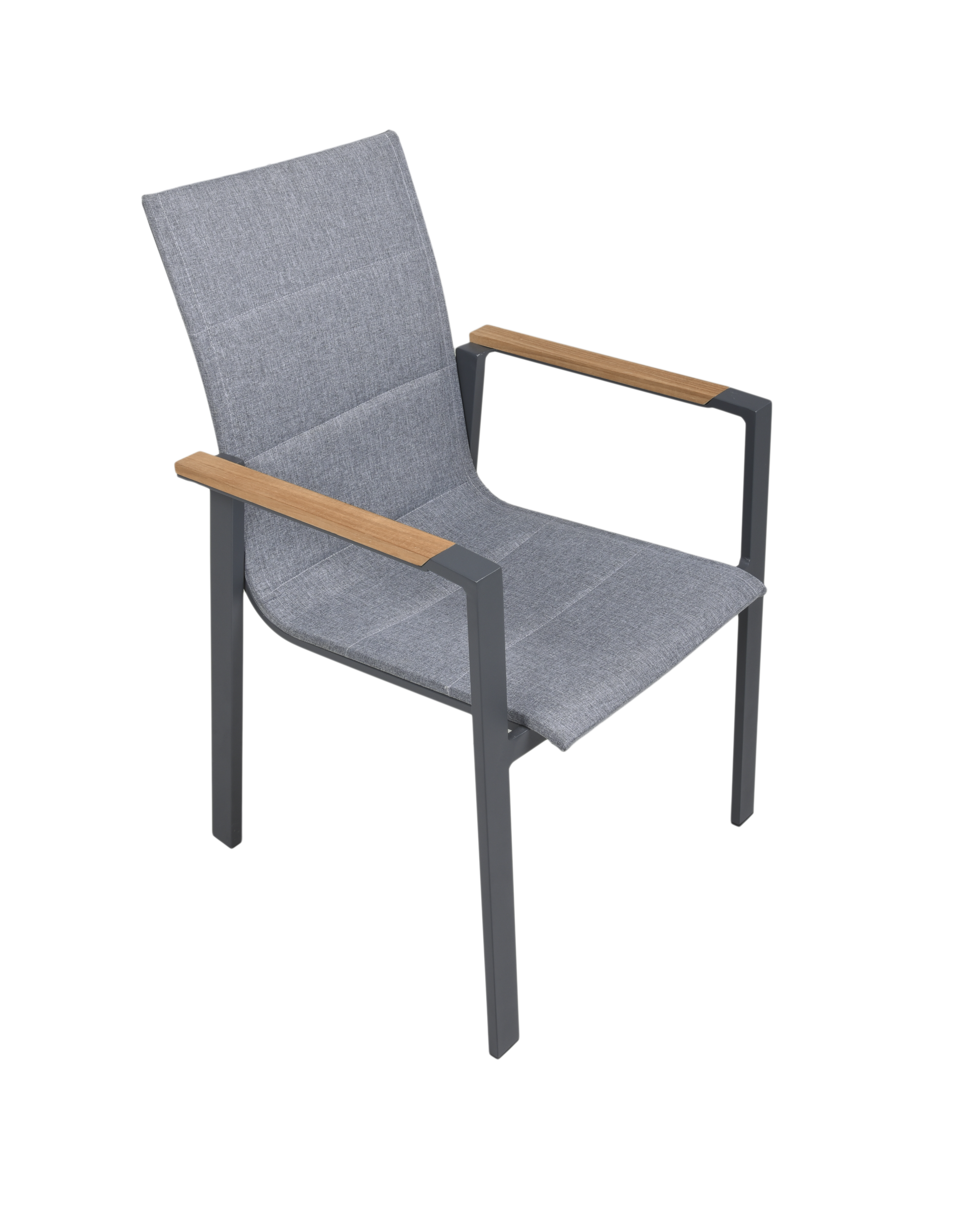 Die Stapelstühle DAVINA sind aus pulverbeschichtetem Anthrazit-Aluminium gefertigt und verfügen über Sitzflächen und Rückenlehnen aus dunkelgrauem Polyester sowie Teak-Armlehnen, die dem Set eine elegante Note verleihen.