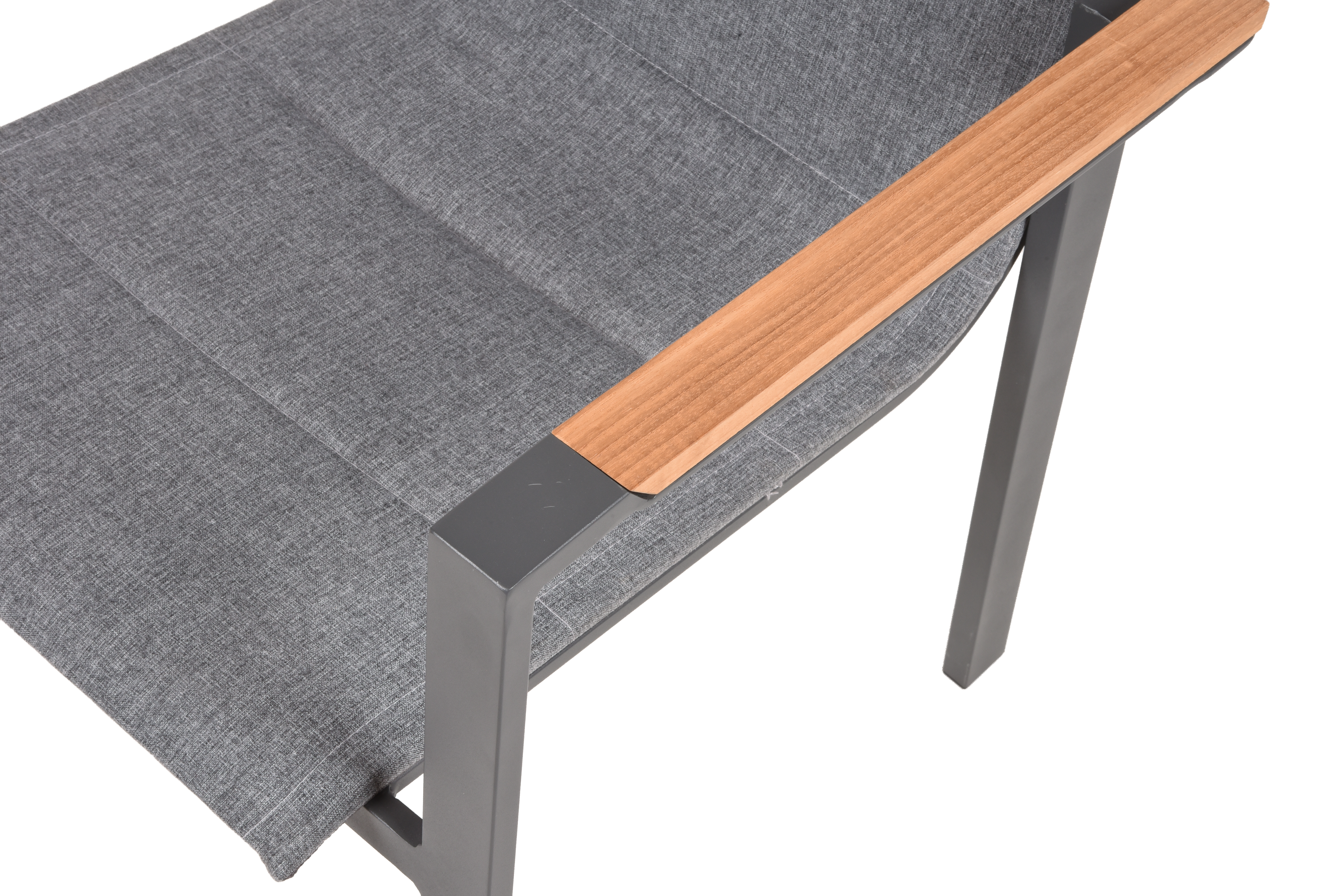 Die acht Stapelstühle DAVINA sind aus pulverbeschichtetem anthrazitfarbenem Aluminium gefertigt und mit dunkelgrauem Polyester bezogen. Die Armlehnen aus Teakholz verleihen den Stühlen einen Hauch von Luxus und zusätzlichen Komfort. Dank ihrer Stapelfunktion lassen sich die Stühle bei Bedarf platzsparend lagern. Dieses Set enthält einen Ausziehtisch und acht Stühle, perfekt für gesellige Mahlzeiten und Zusammenkünfte im Freien mit Familie und Freunden.