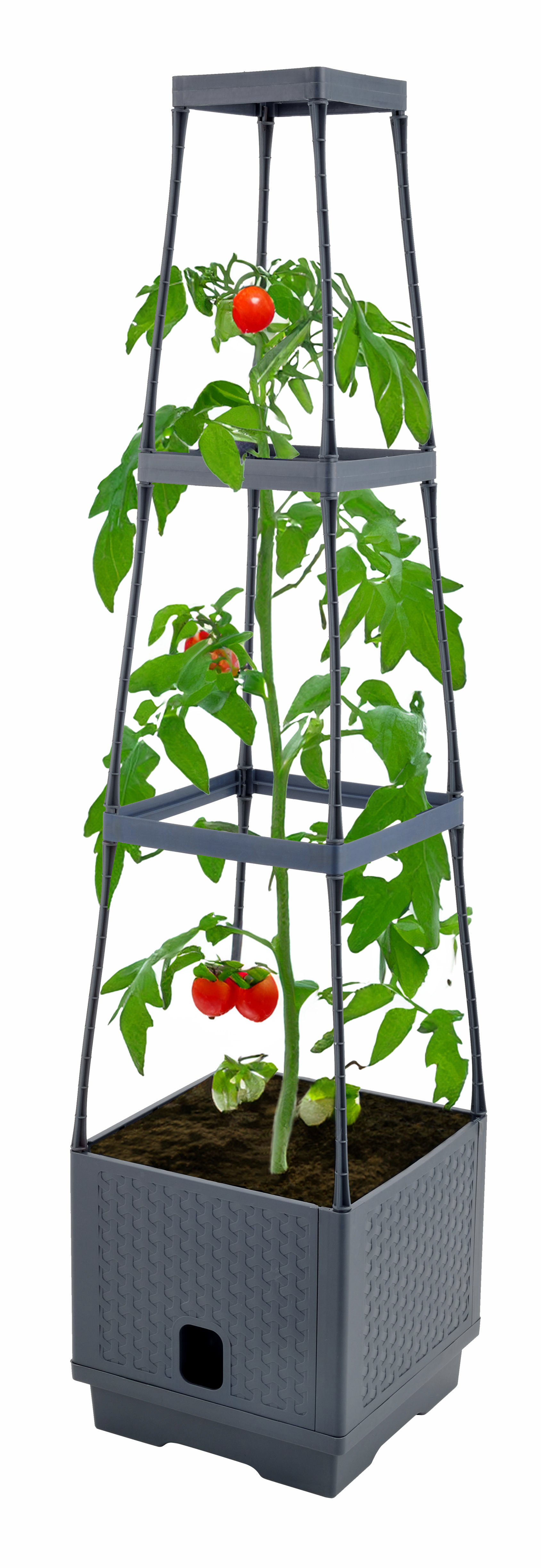 Die Tomaten-Rankhilfe im Pflanztopf ist ein praktisches Gartenwerkzeug, das speziell entwickelt wurde, um Tomatenpflanzen zu unterstützen und deren Wachstum zu fördern. Der Pflanztopf besteht aus strapazierfähigem anthrazitfarbenen  Kunststoff und ist stabil und langlebig.