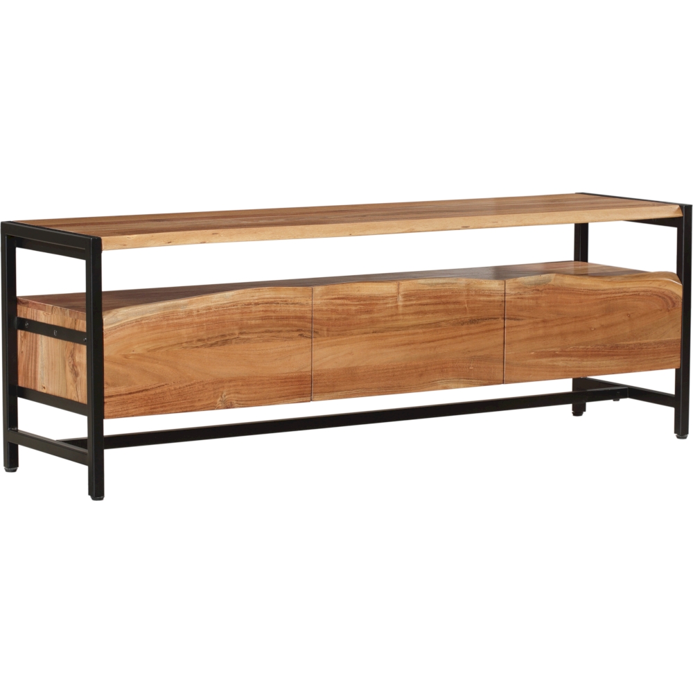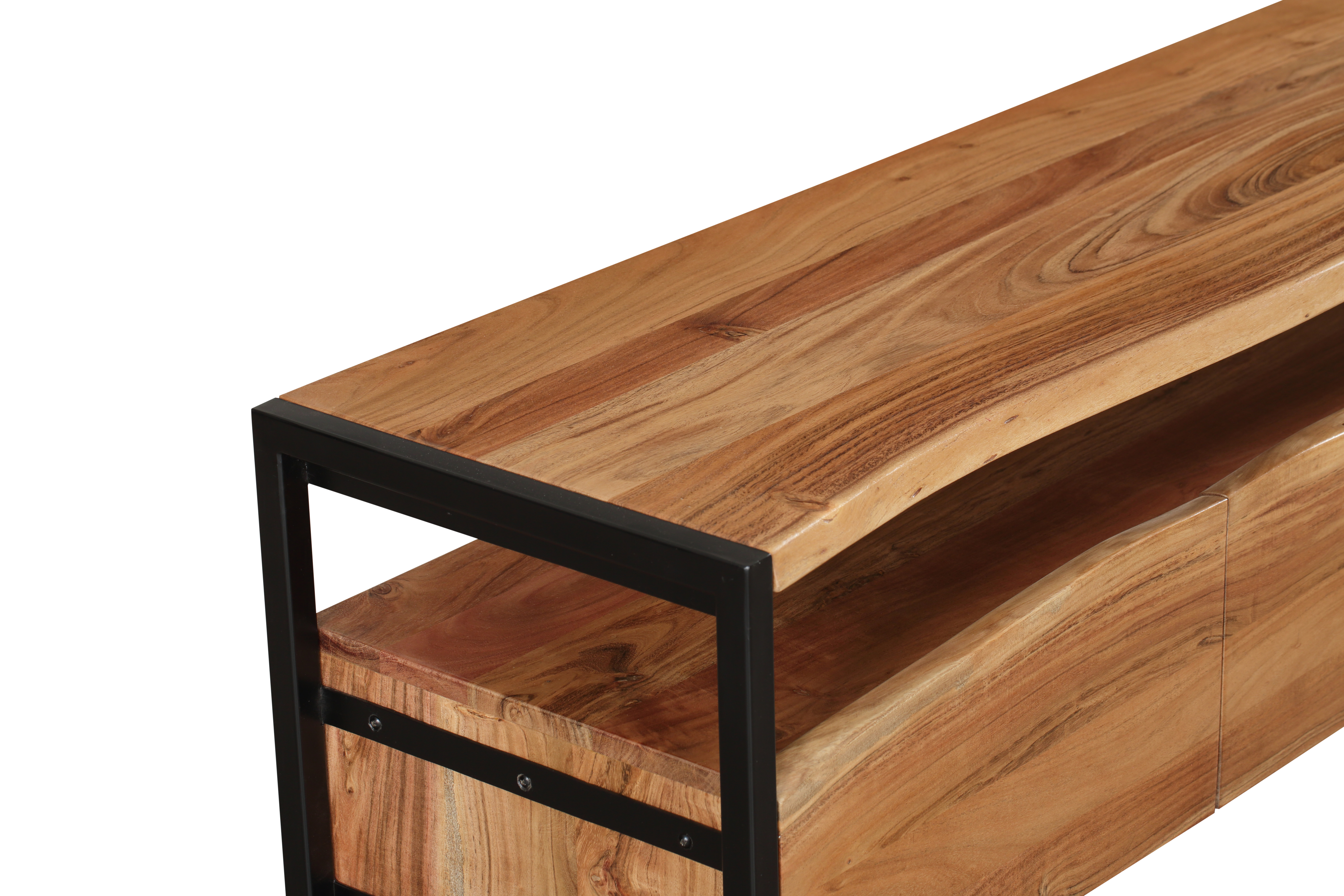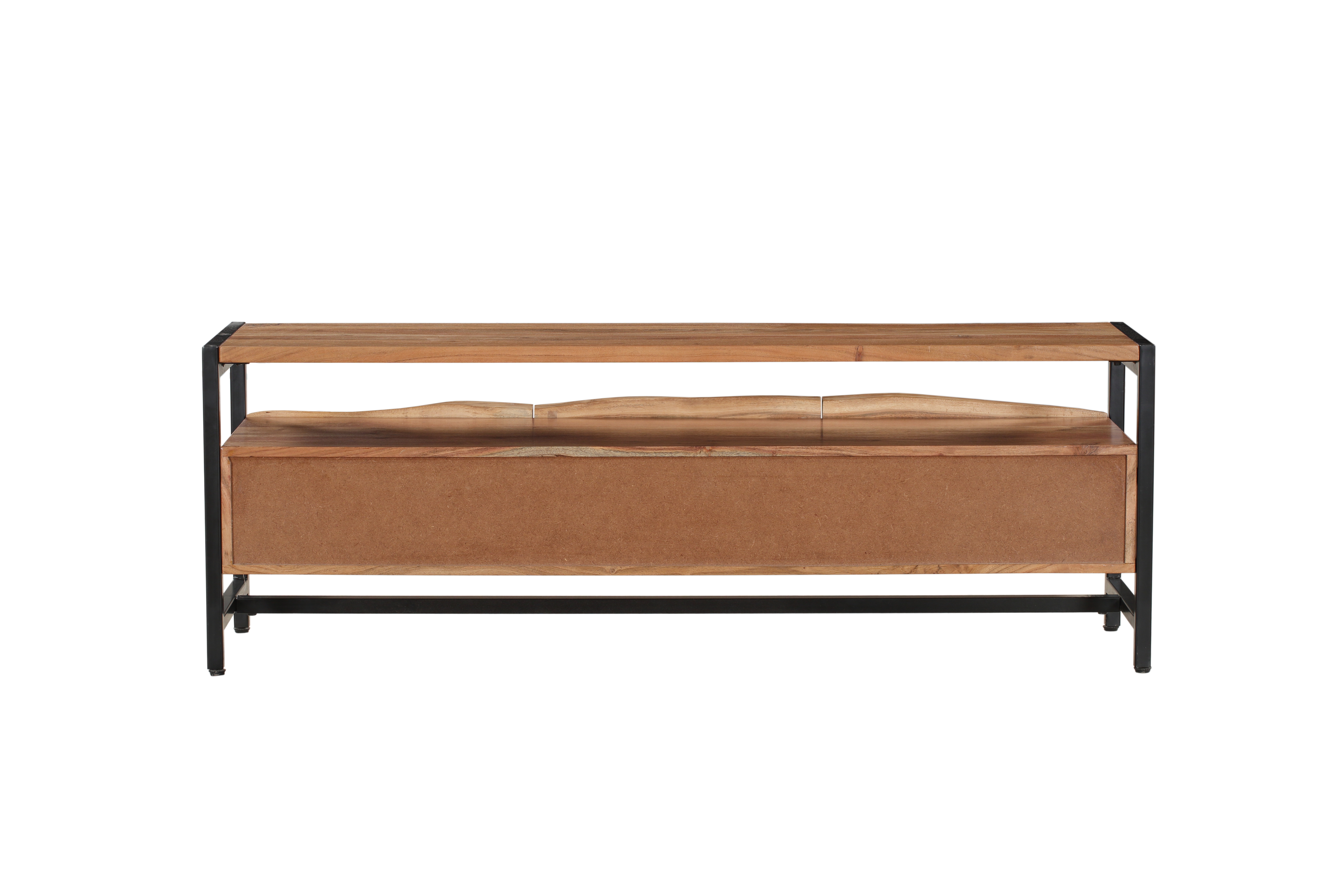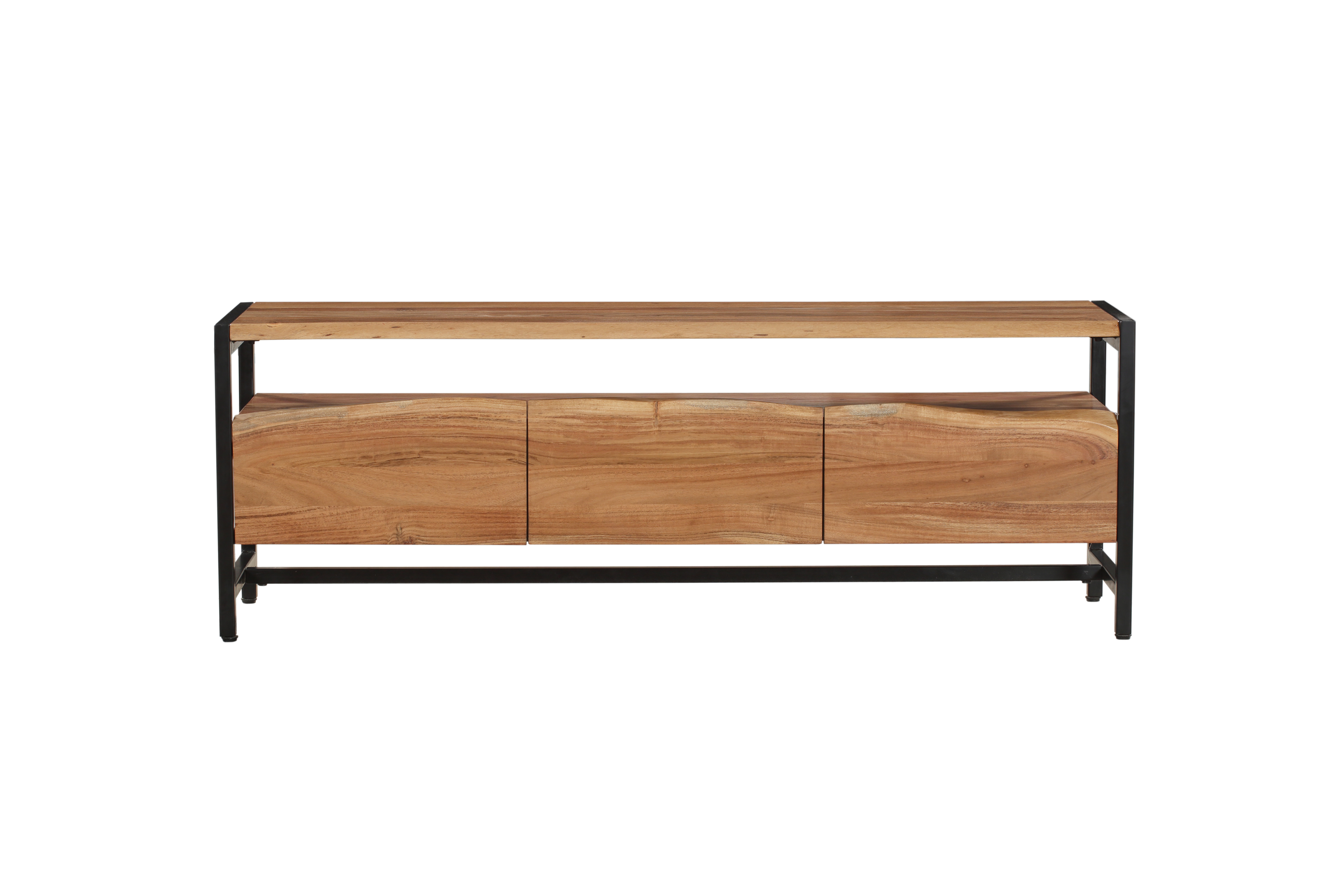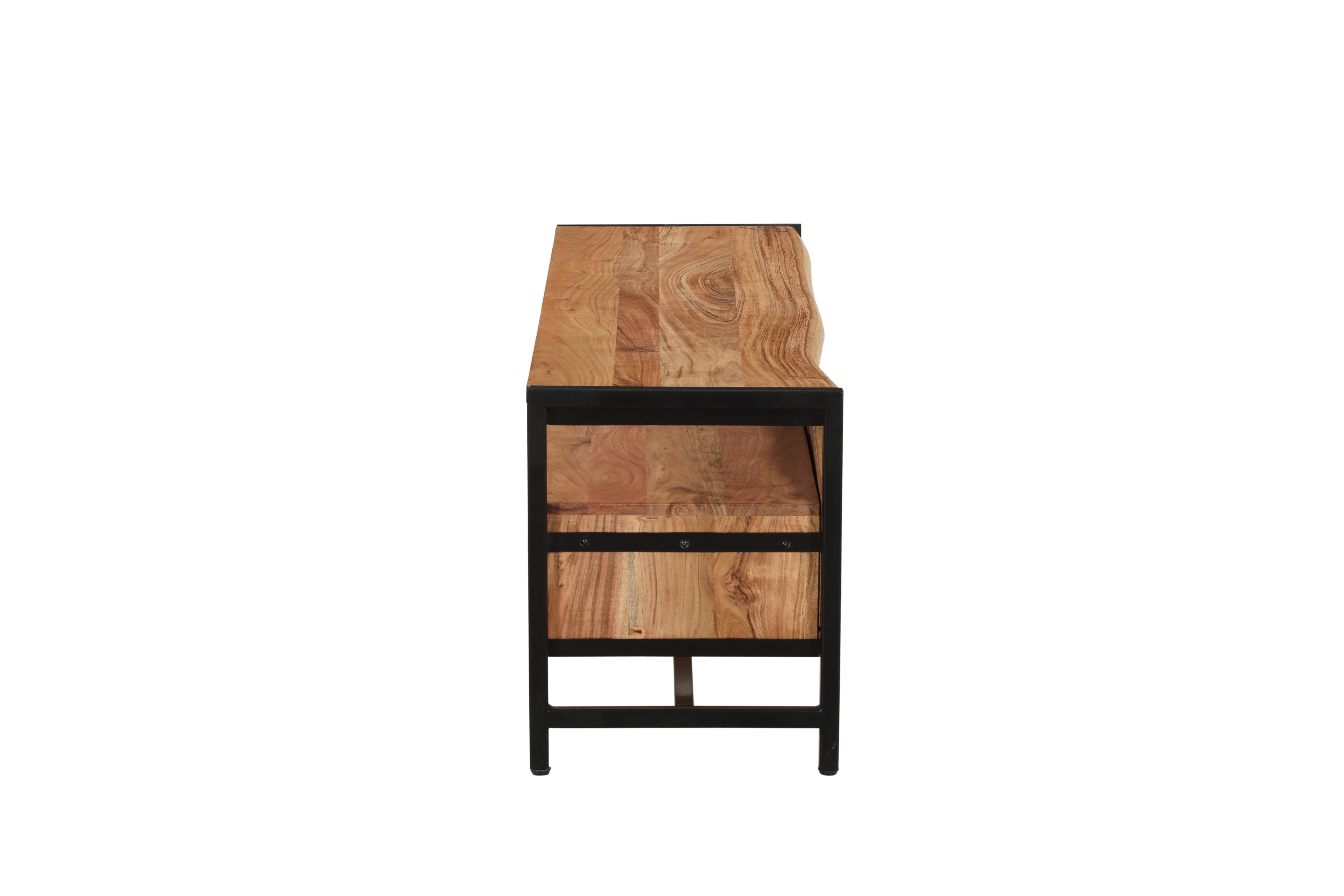 Der TV-Schrank MALA besticht durch eine Kombination aus Akazienholz und pulverbeschichtetem Eisen. Die lackierte Holzoberfläche und die schwarze Metallstruktur verleihen dem Möbelstück eine moderne, industrielle Optik, die sich hervorragend in unterschiedliche Wohnstile integriert. Mit praktischen Ablageflächen bietet der Schrank ausreichend Stauraum für Ihre Elektronik und Zubehör.