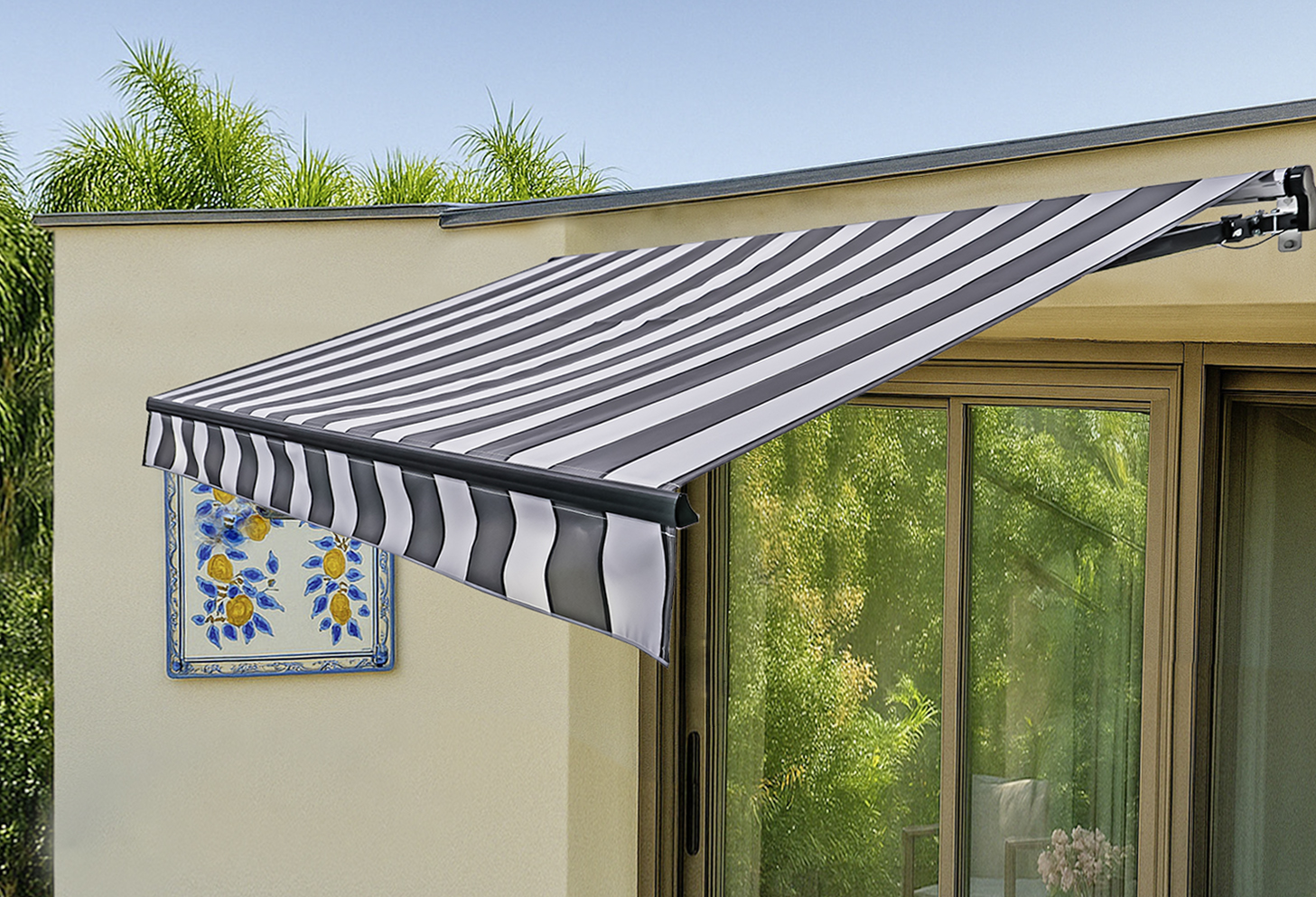 Über die leichtgängige Stahlkurbel lässt sich die Markise stufenlos ein- und ausfahren, sodass der Schatten jederzeit flexibel angepasst werden kann. Die Gelenkarme aus Aluminium halten das Tuch gleichmäßig gespannt und ermöglichen eine angenehme, großzügige Beschattung ohne störende Stützen. Dank der geraden Kante wirkt die Markise optisch klar und fügt sich harmonisch in unterschiedliche Außenbereiche ein. Insgesamt ist diese Markise eine praktische und langlebige Lösung für alle, die Funktionalität, Schutz und ein zeitloses Design miteinander verbinden möchten.