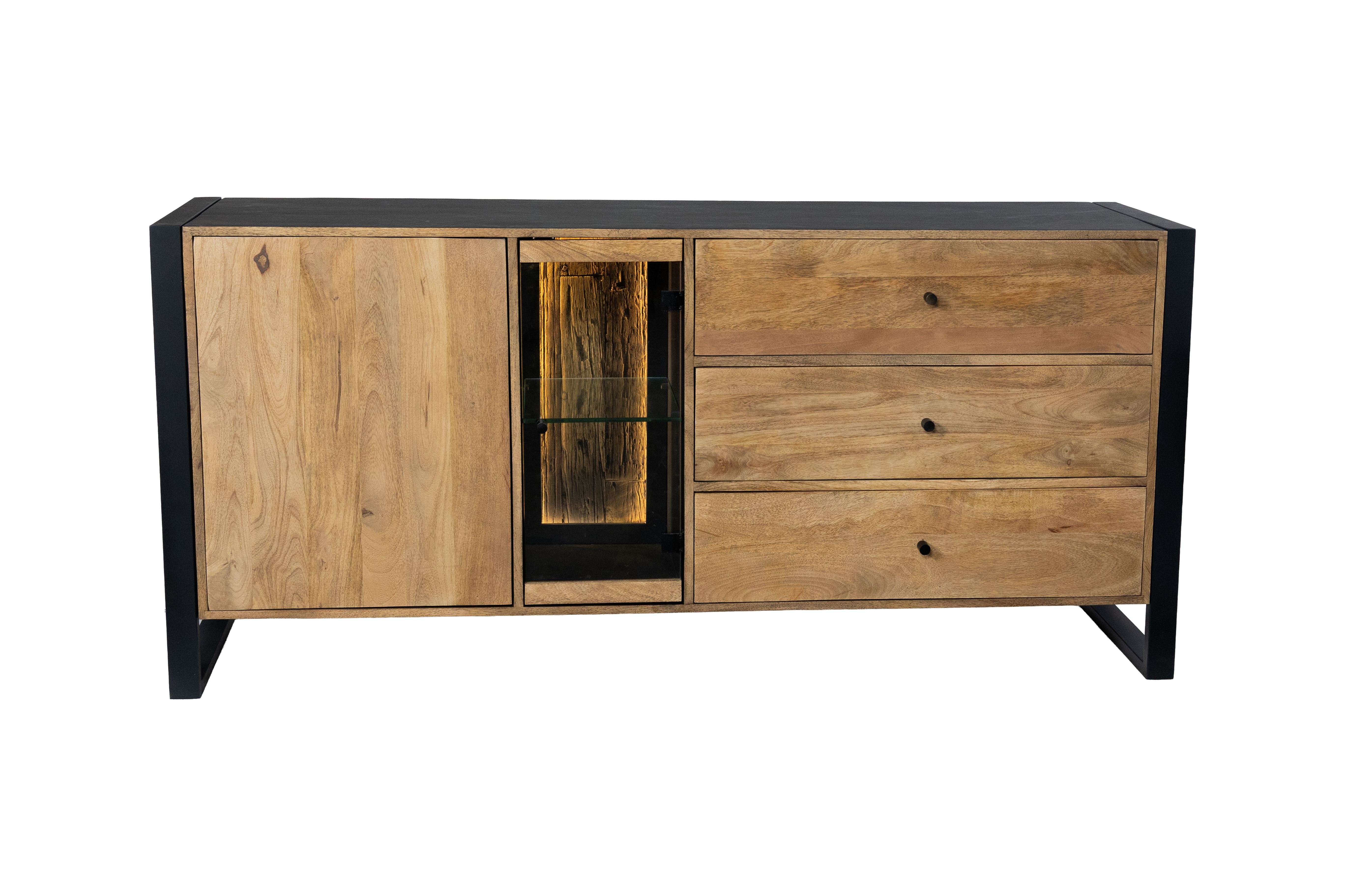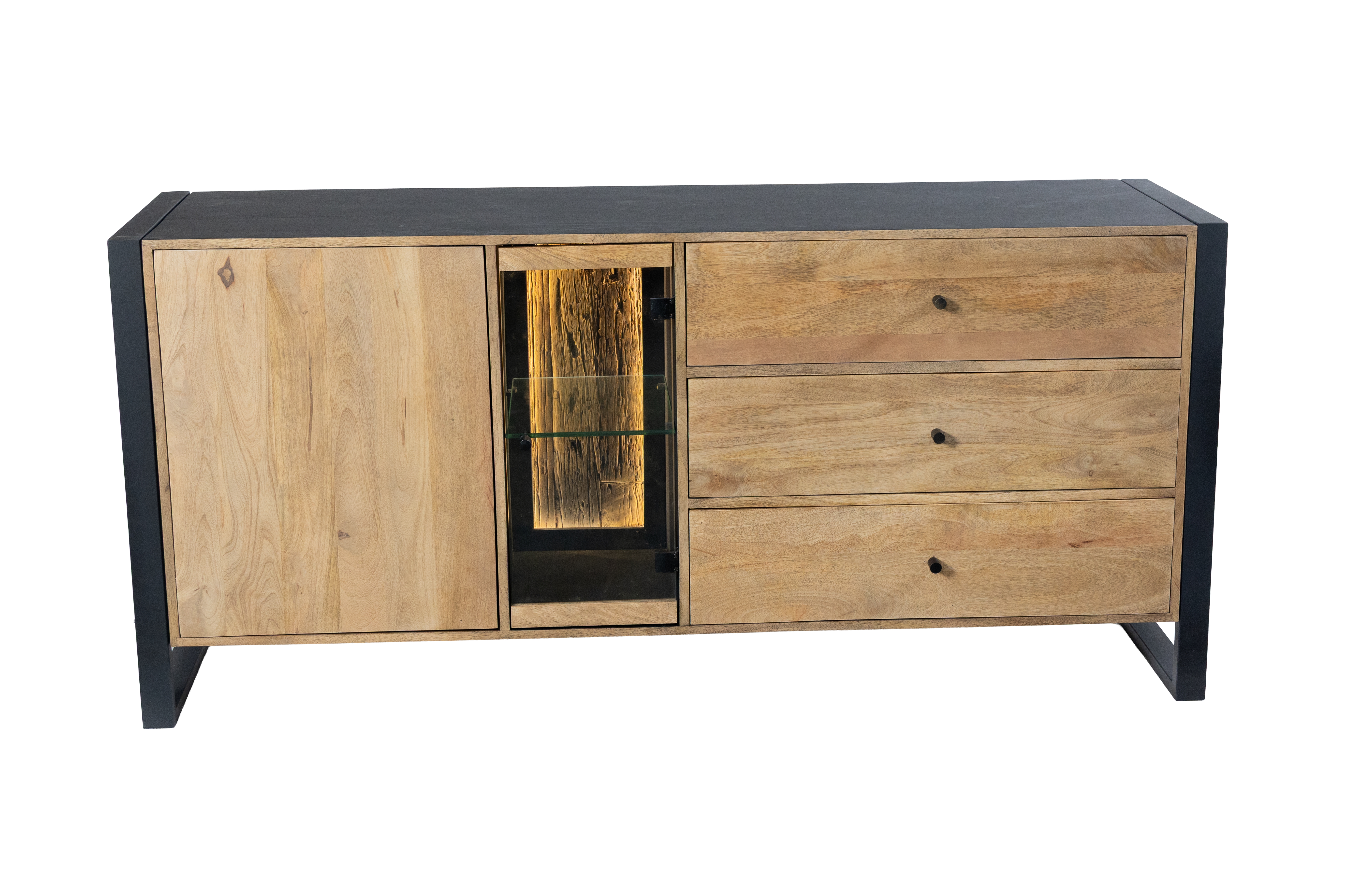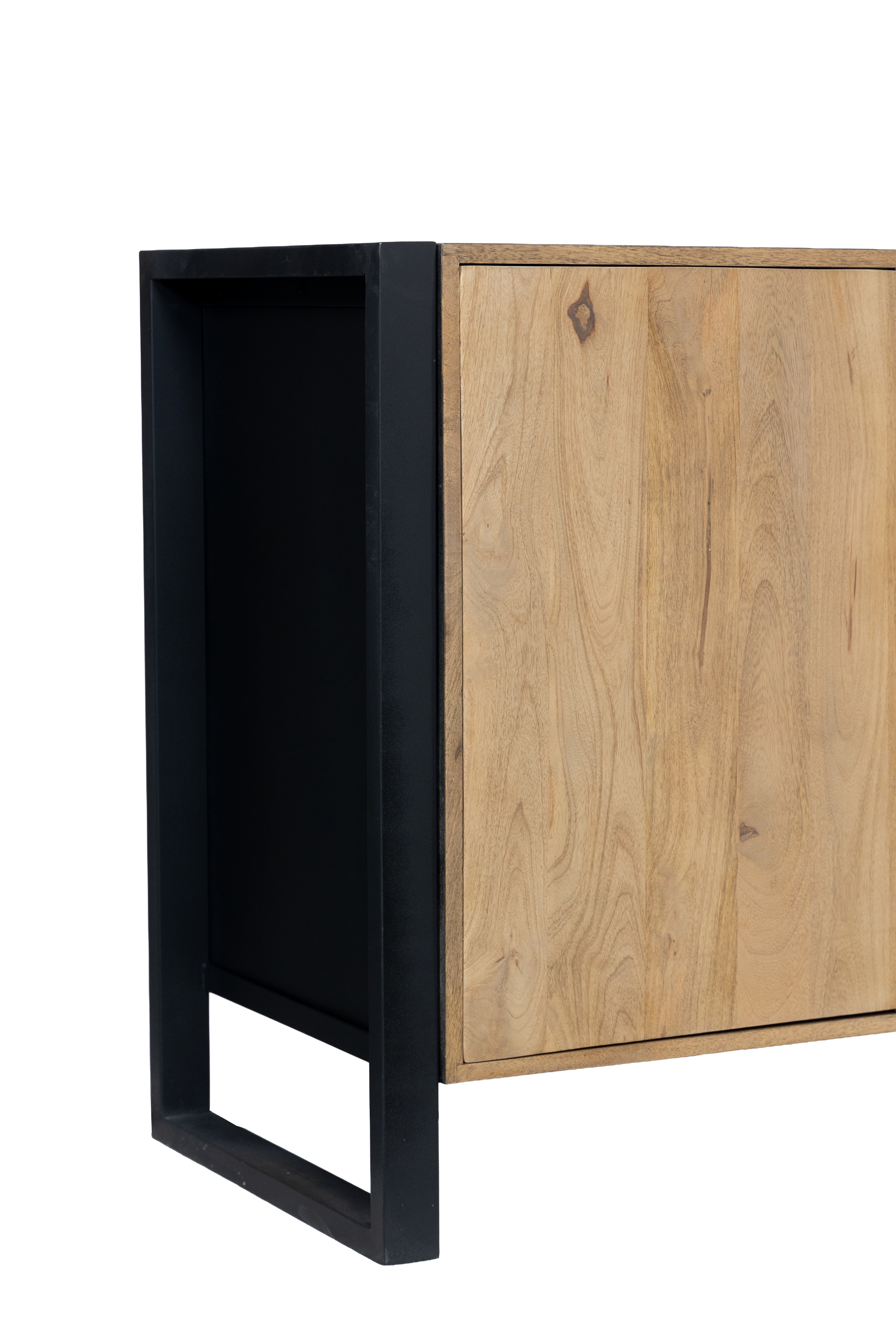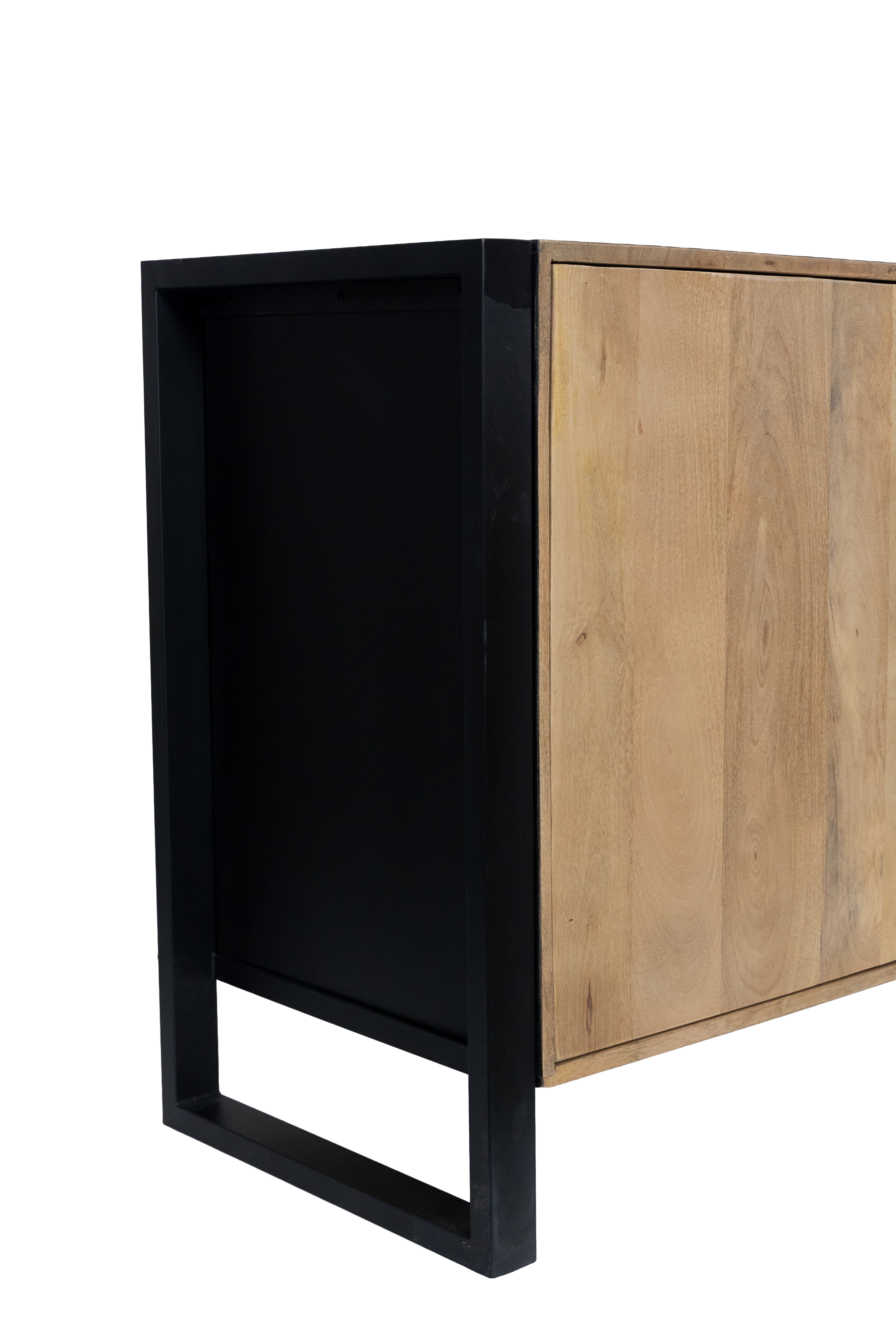 Das Sideboard MAYA überzeugt durch die gelungene Kombination aus massivem Mango-Holz und stabilem Eisen und bringt einen modernen Industrial-Look in Ihr Zuhause. Die lackierte Oberfläche in Schwarz Matt wird harmonisch durch warme Honigtöne ergänzt und unterstreicht die natürliche Maserung des Holzes.