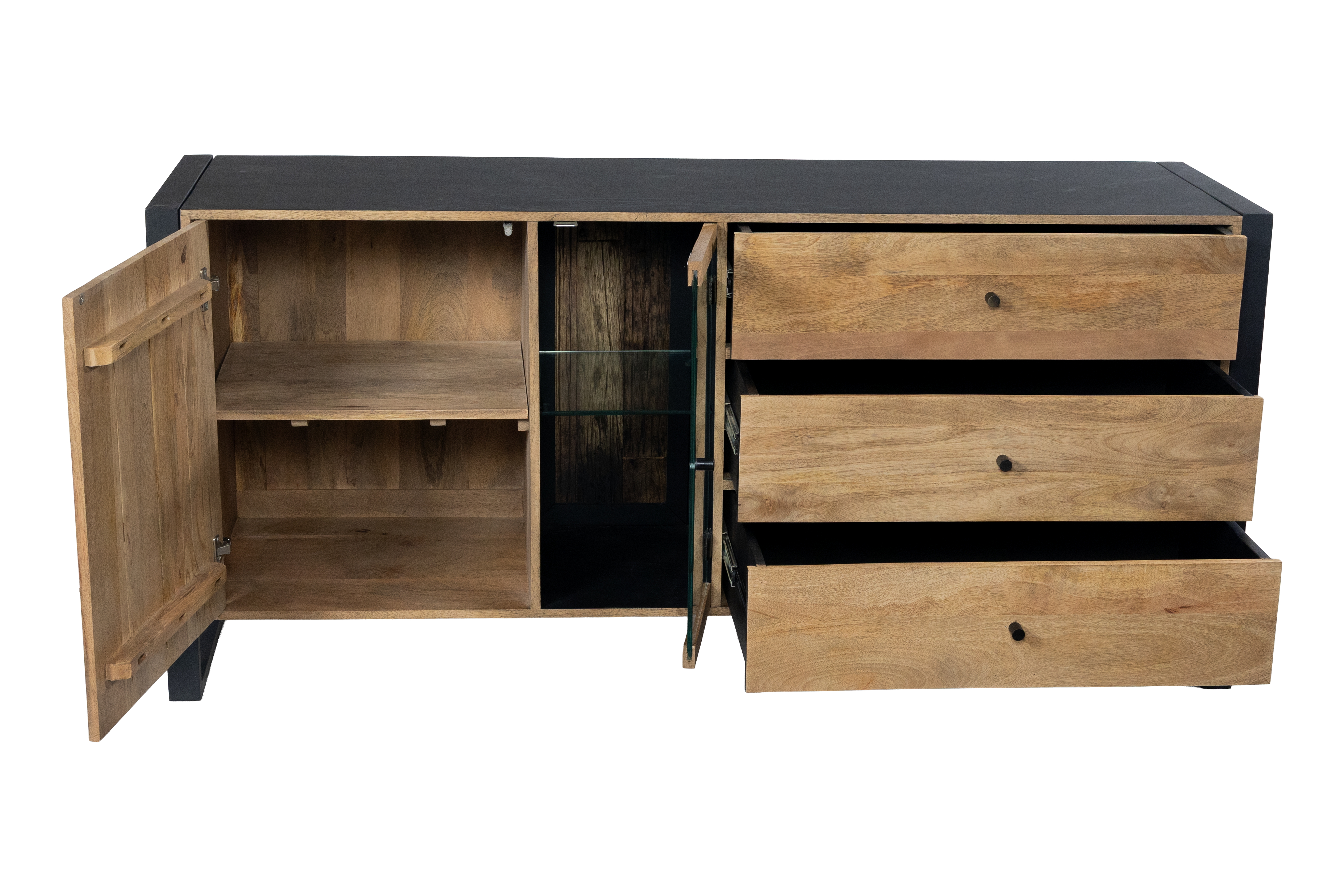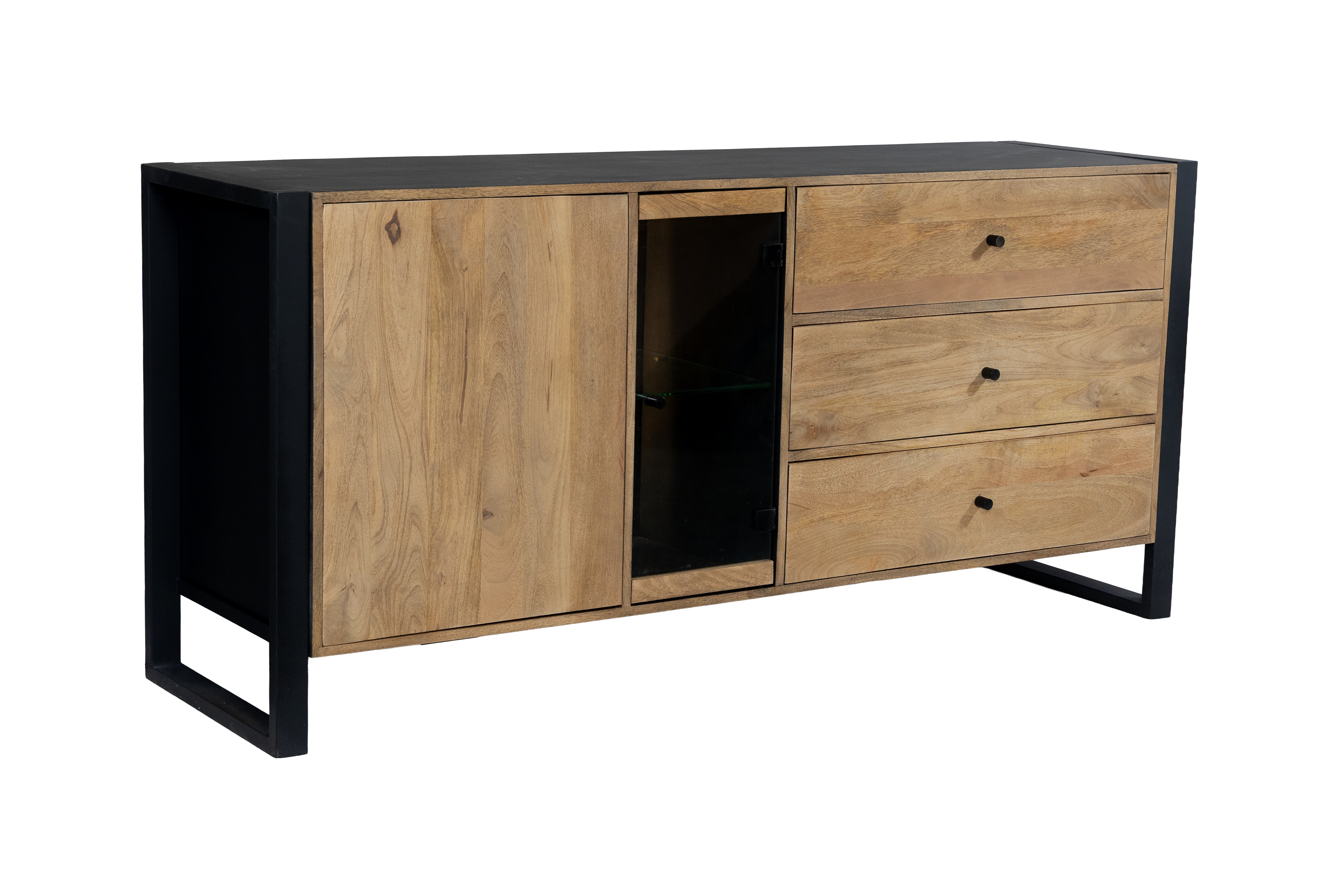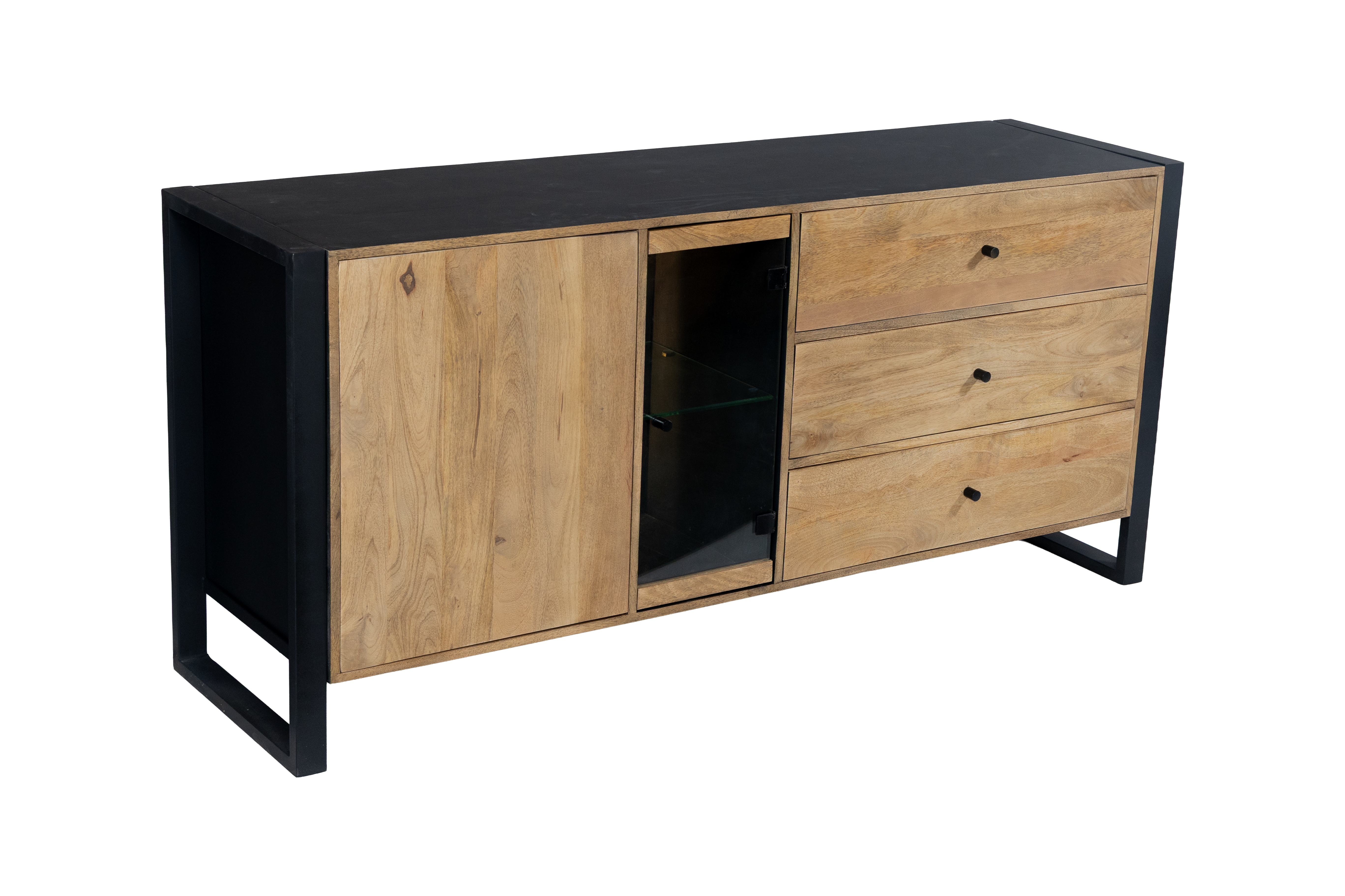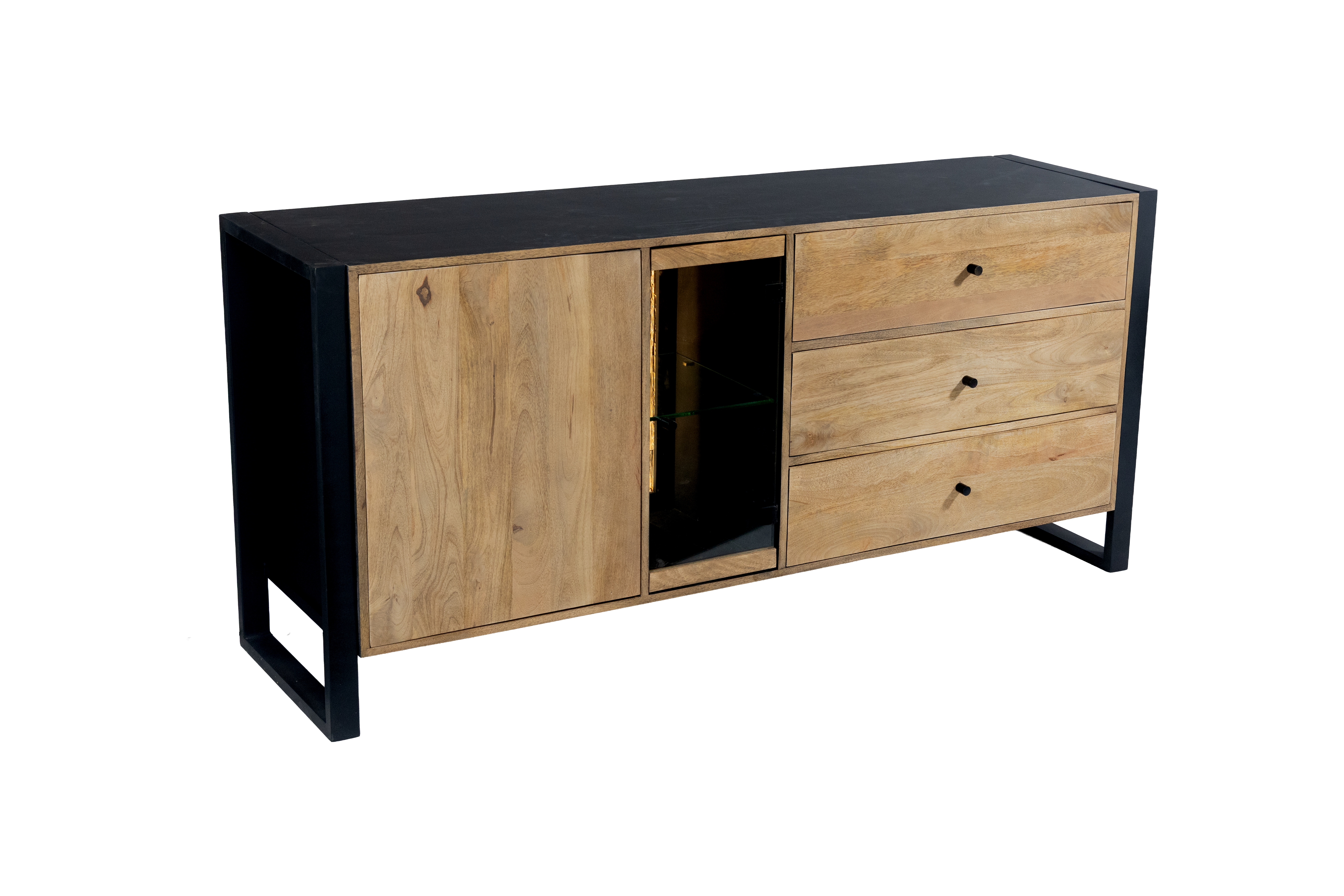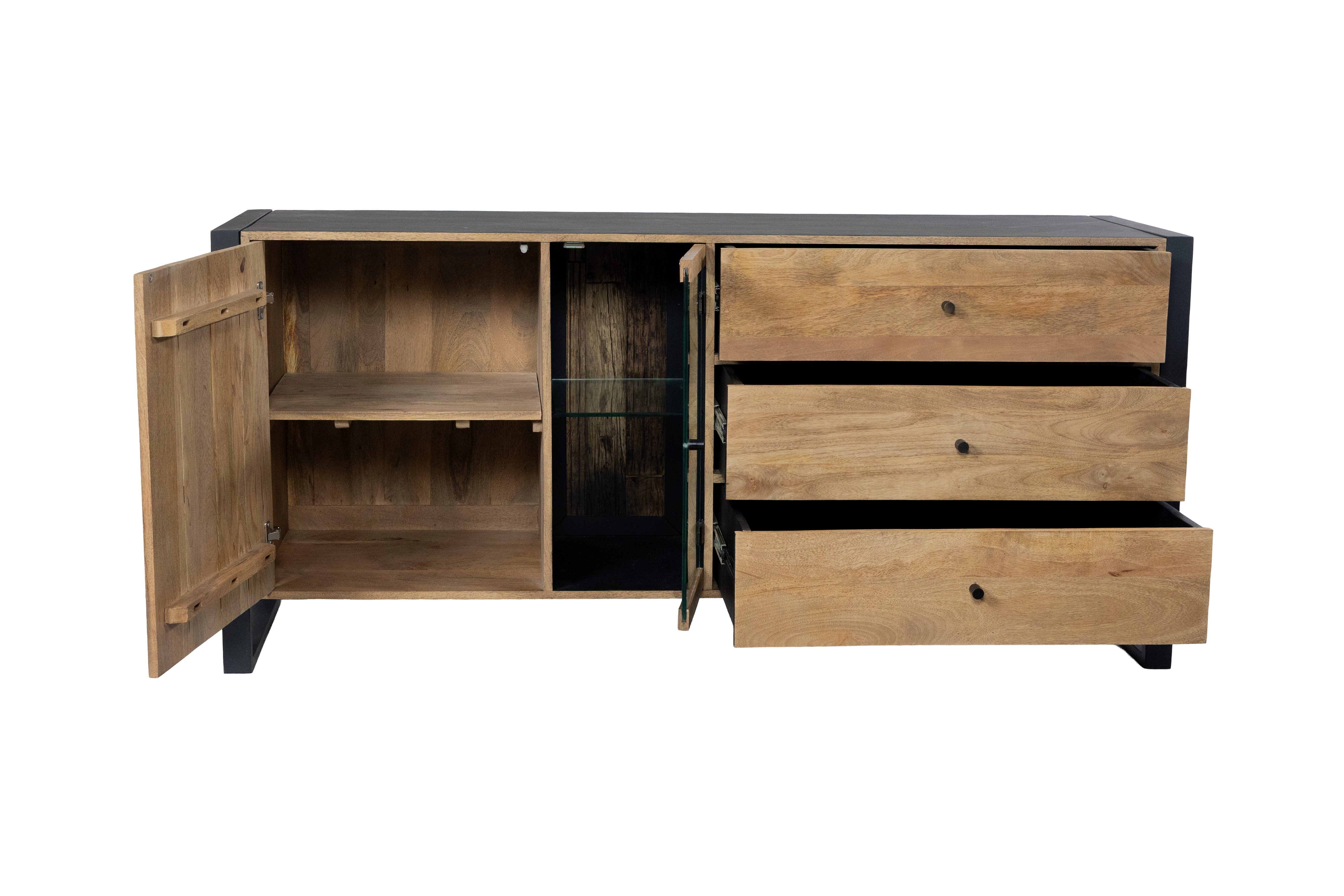 Das Sideboard MAYA überzeugt durch die gelungene Kombination aus massivem Mango-Holz und stabilem Eisen und bringt einen modernen Industrial-Look in Ihr Zuhause. Die lackierte Oberfläche in Schwarz Matt wird harmonisch durch warme Honigtöne ergänzt und unterstreicht die natürliche Maserung des Holzes.