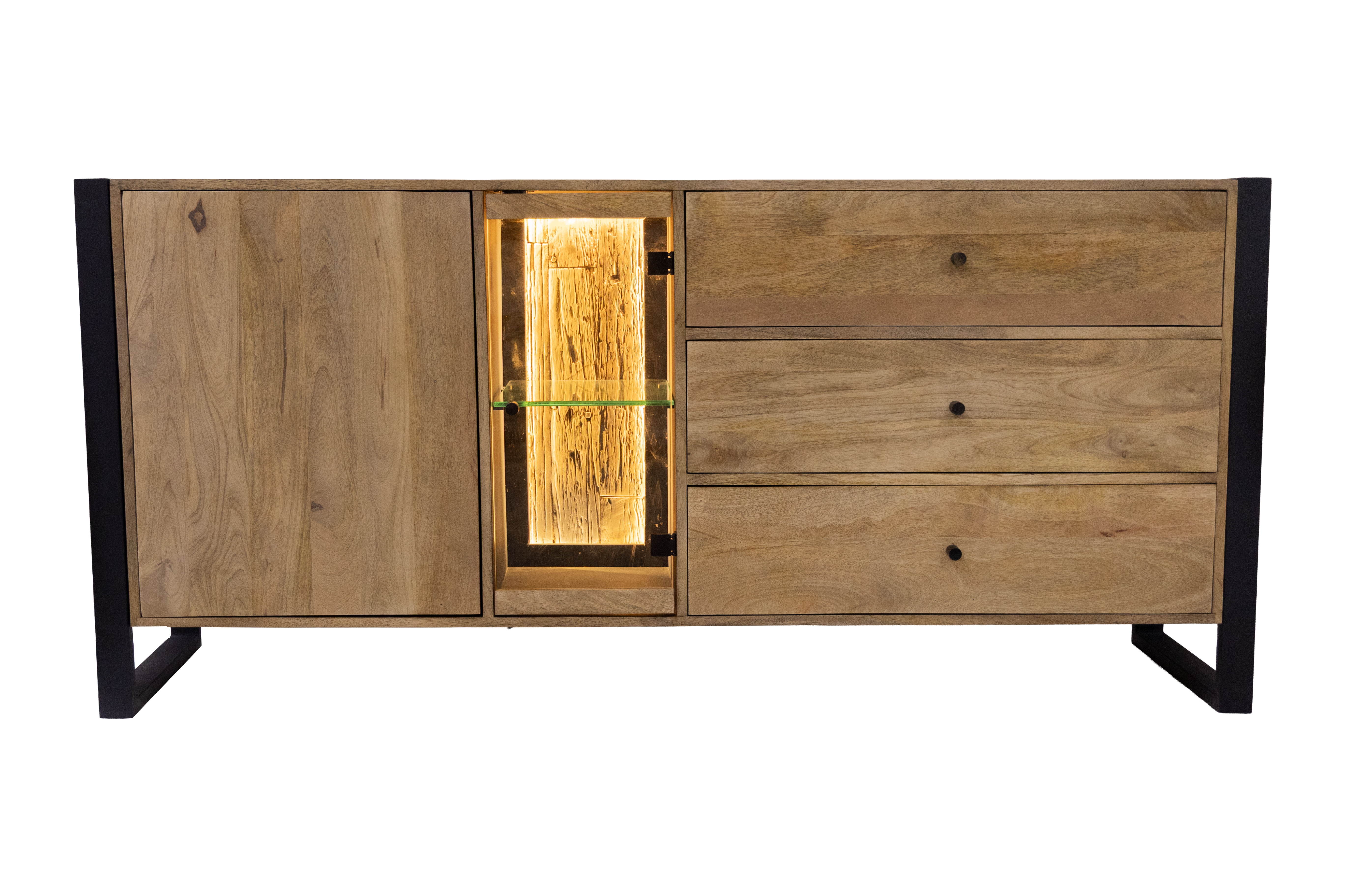 Die Glas-Tür verleiht dem Sideboard eine elegante Leichtigkeit und ermöglicht einen stilvollen Blick auf den Innenraum. Ein besonderes Highlight ist die Rückwand aus recyceltem Holz, die jedes Möbelstück zu einem Unikat macht und den nachhaltigen Charakter betont.