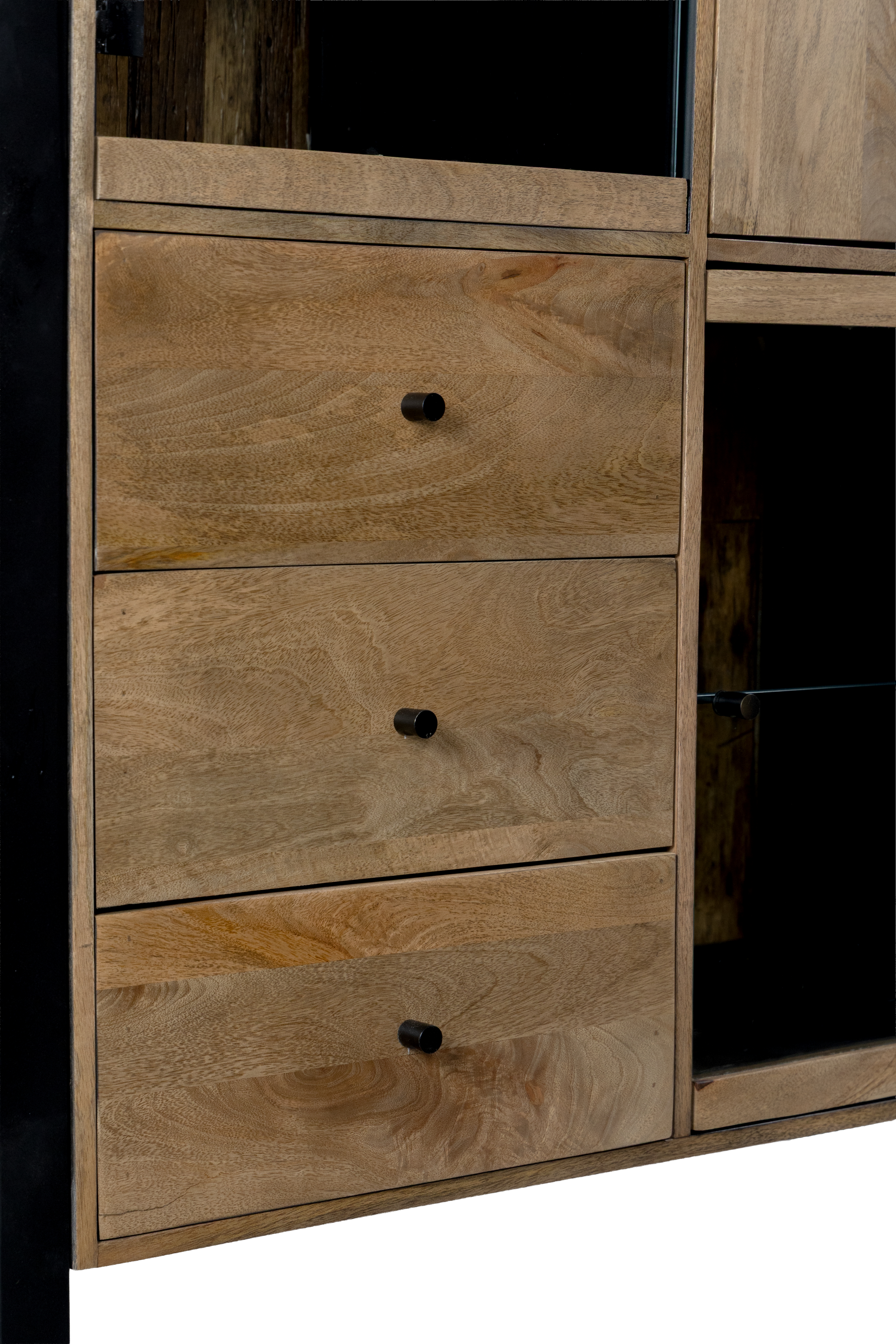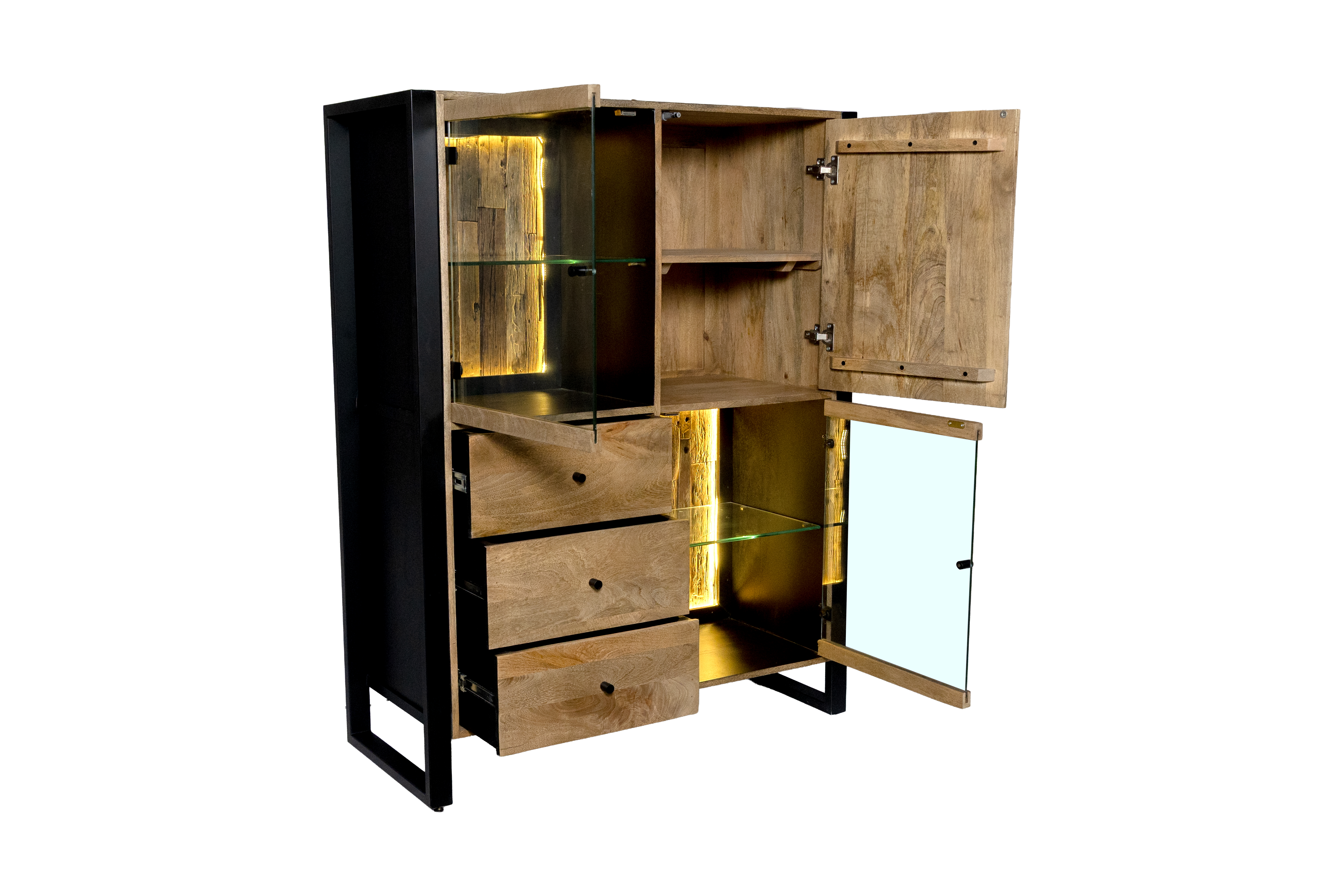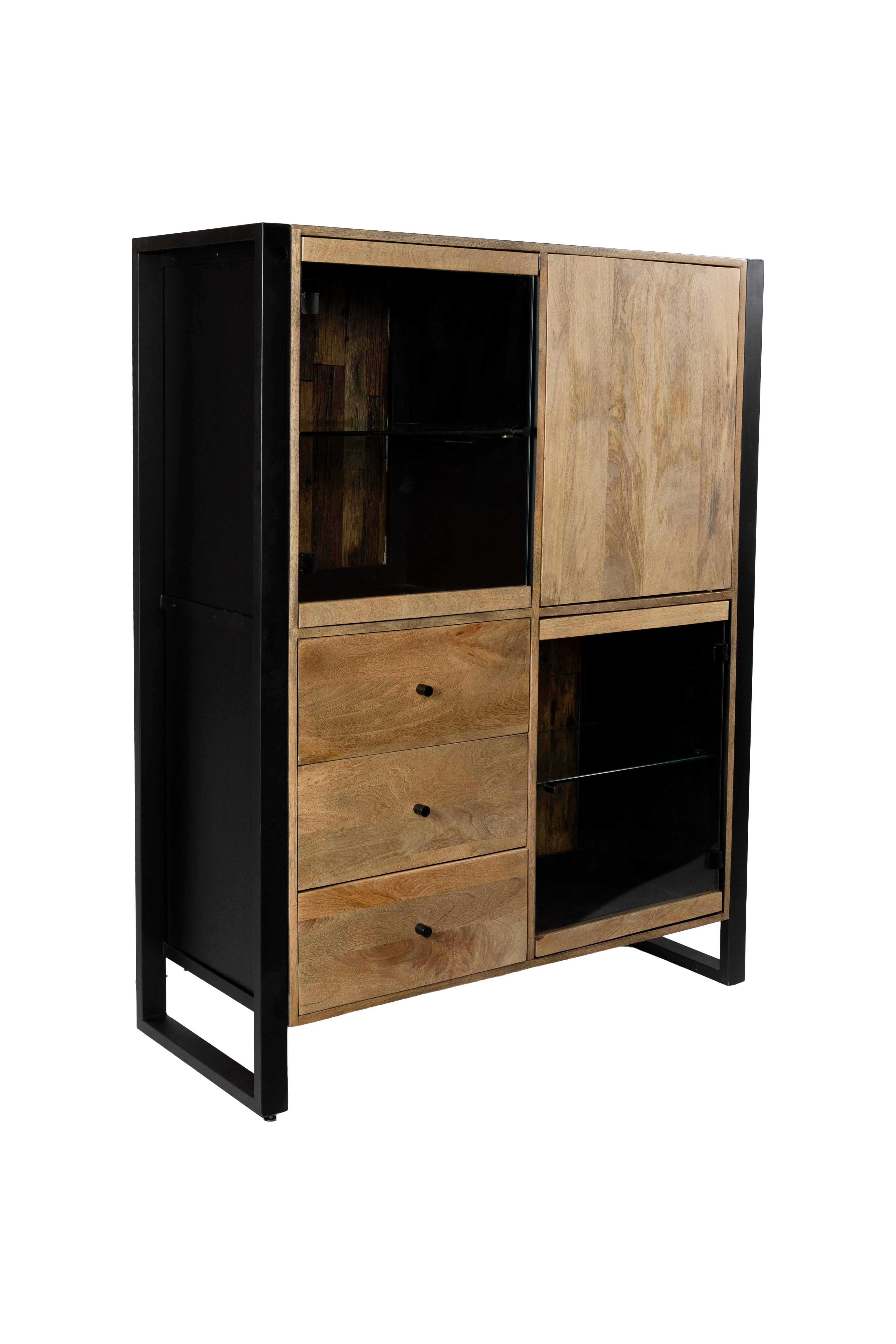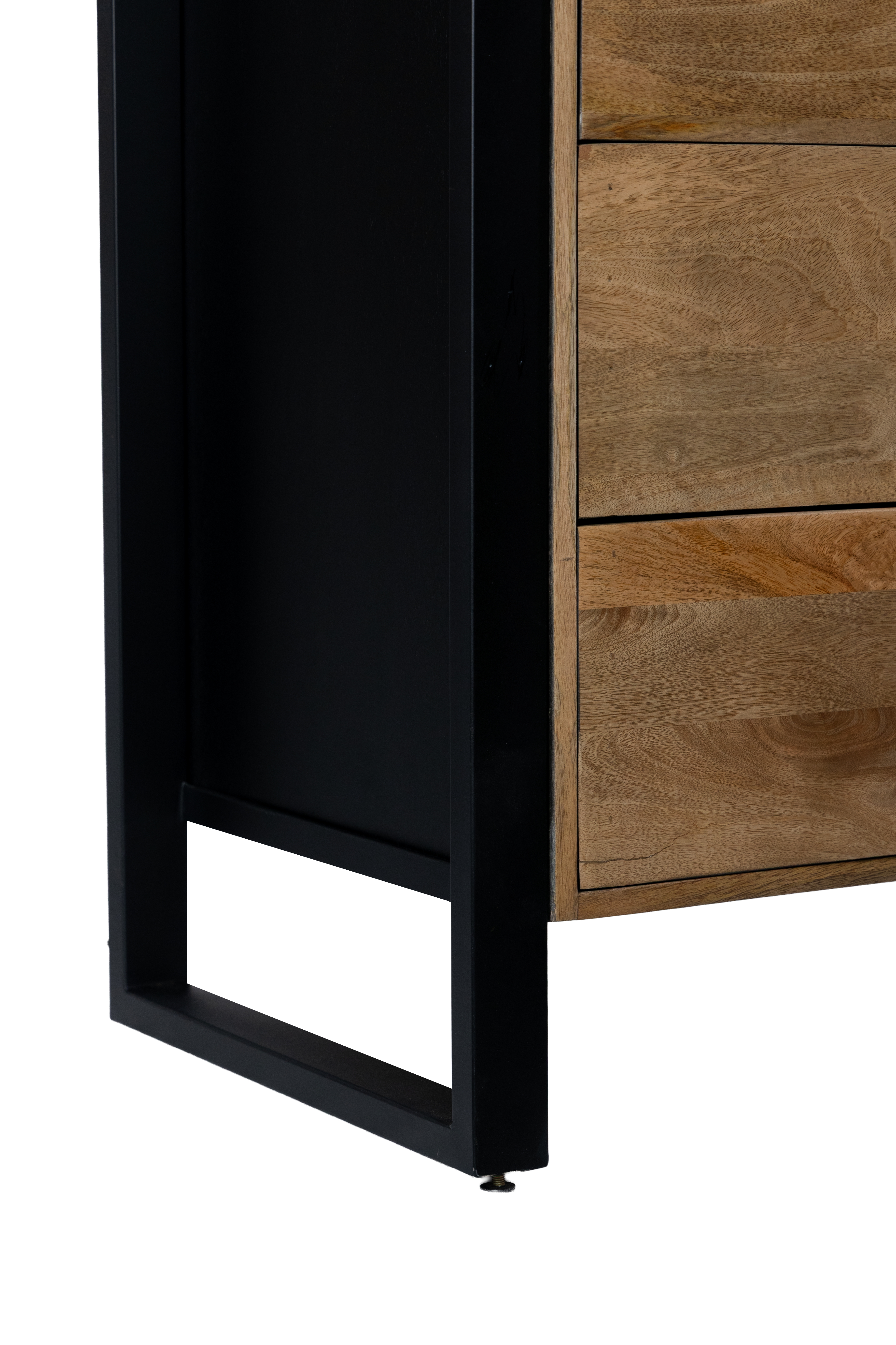 Das Highboard MAYA vereint hochwertiges Mango-Holz mit robustem Eisen und überzeugt durch sein ausdrucksstarkes Design im modernen Industrial-Stil. Die lackierte Oberfläche in Schwarz Matt wird durch warme Honigtöne ergänzt und bringt die natürliche Struktur des Holzes besonders schön zur Geltung.