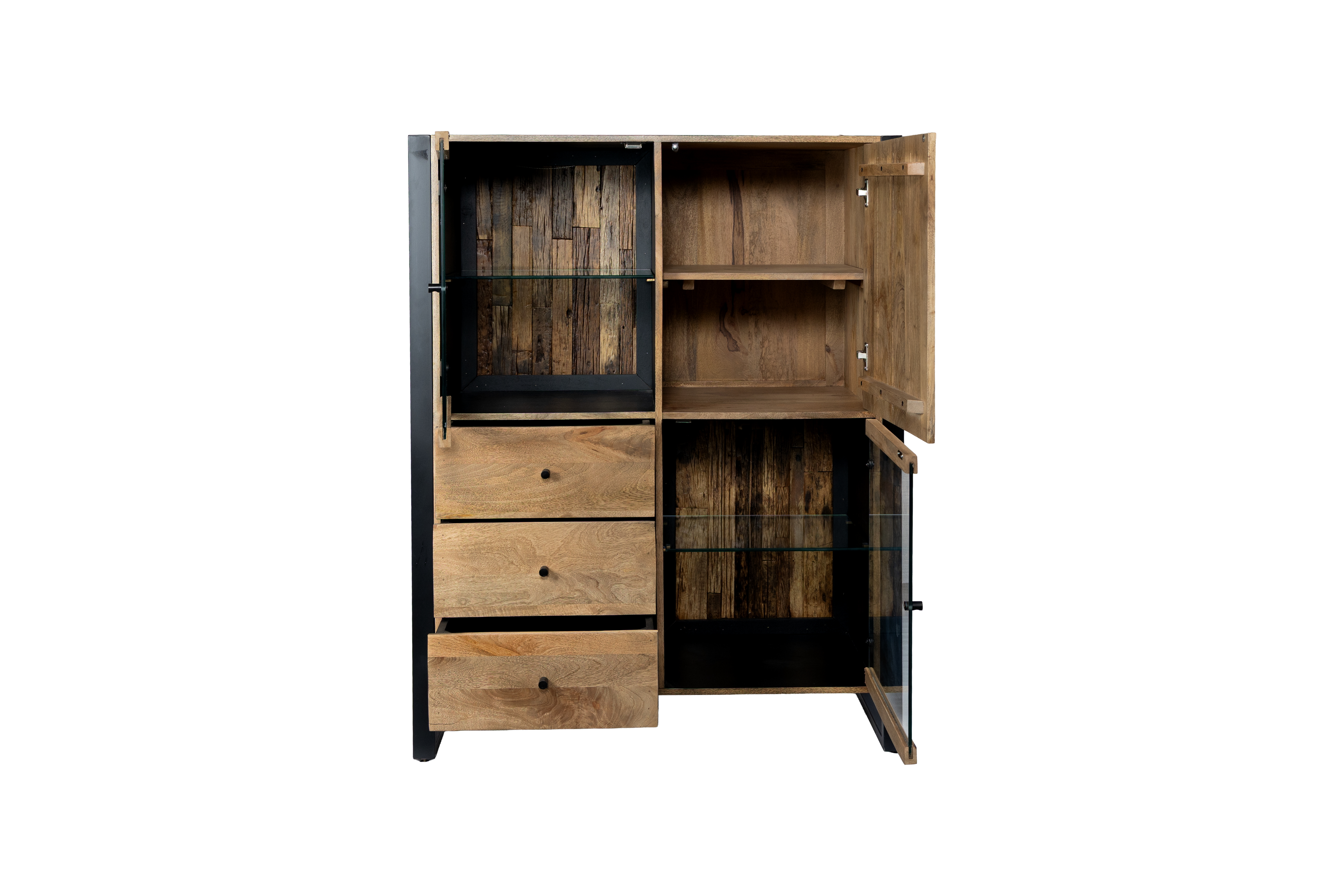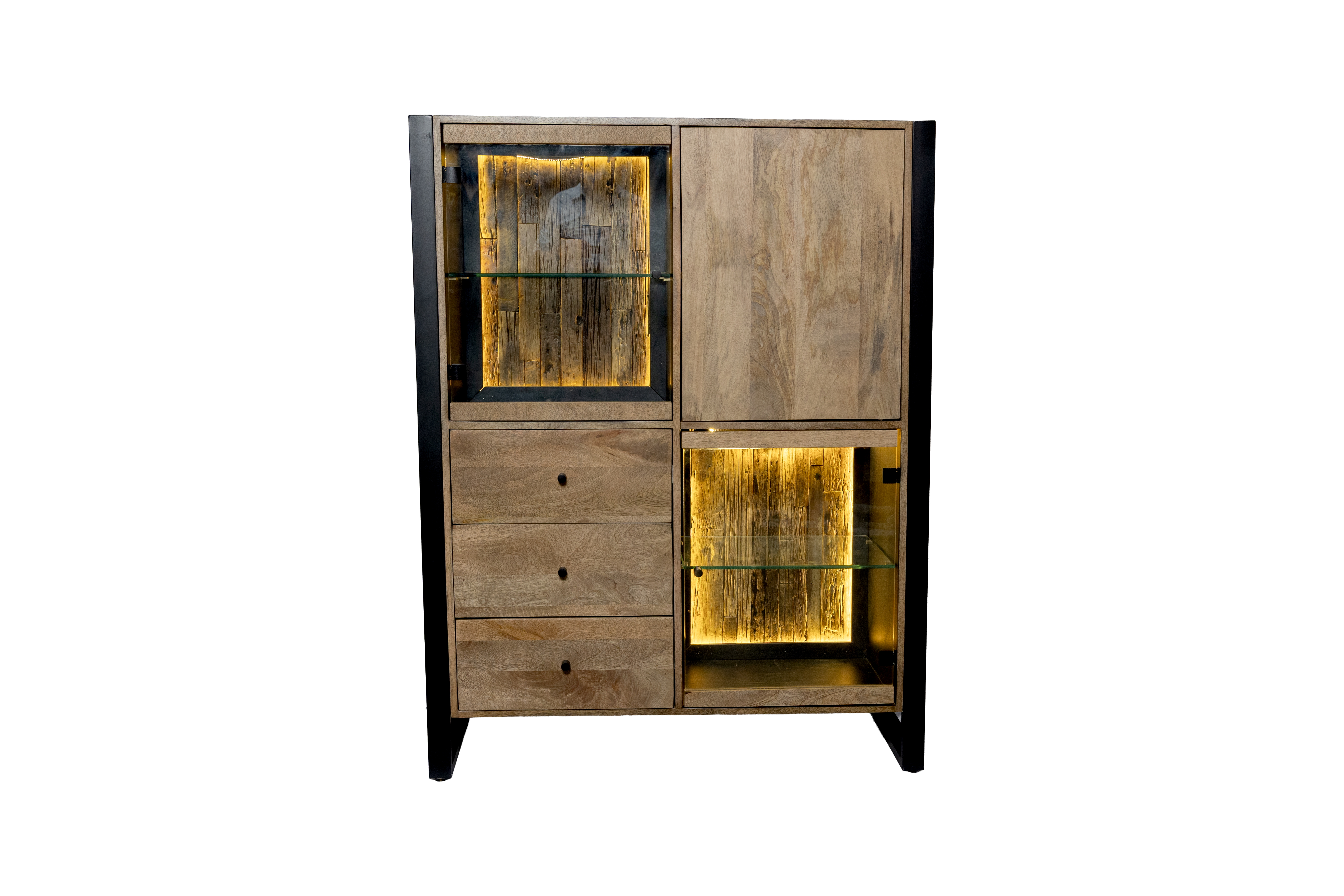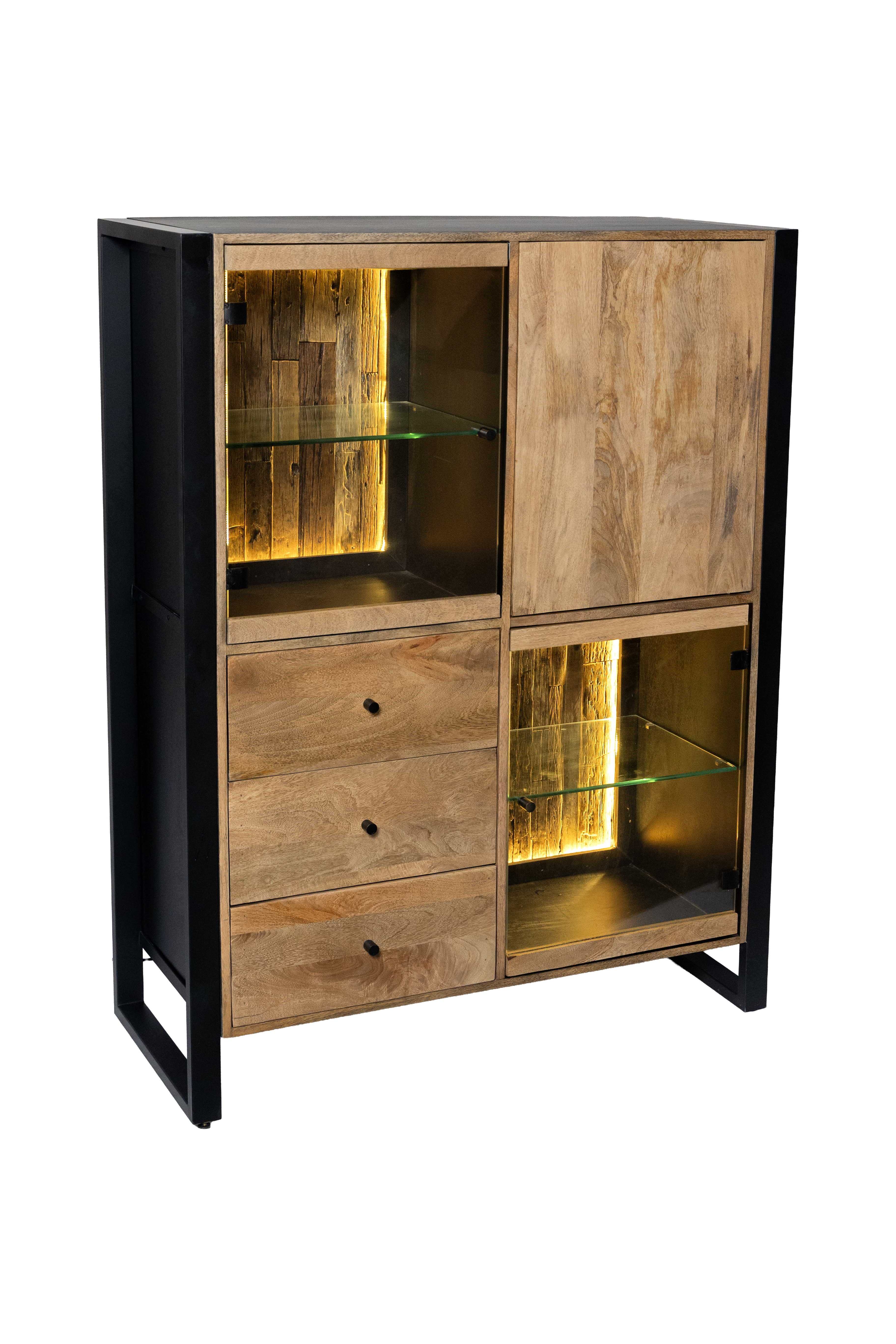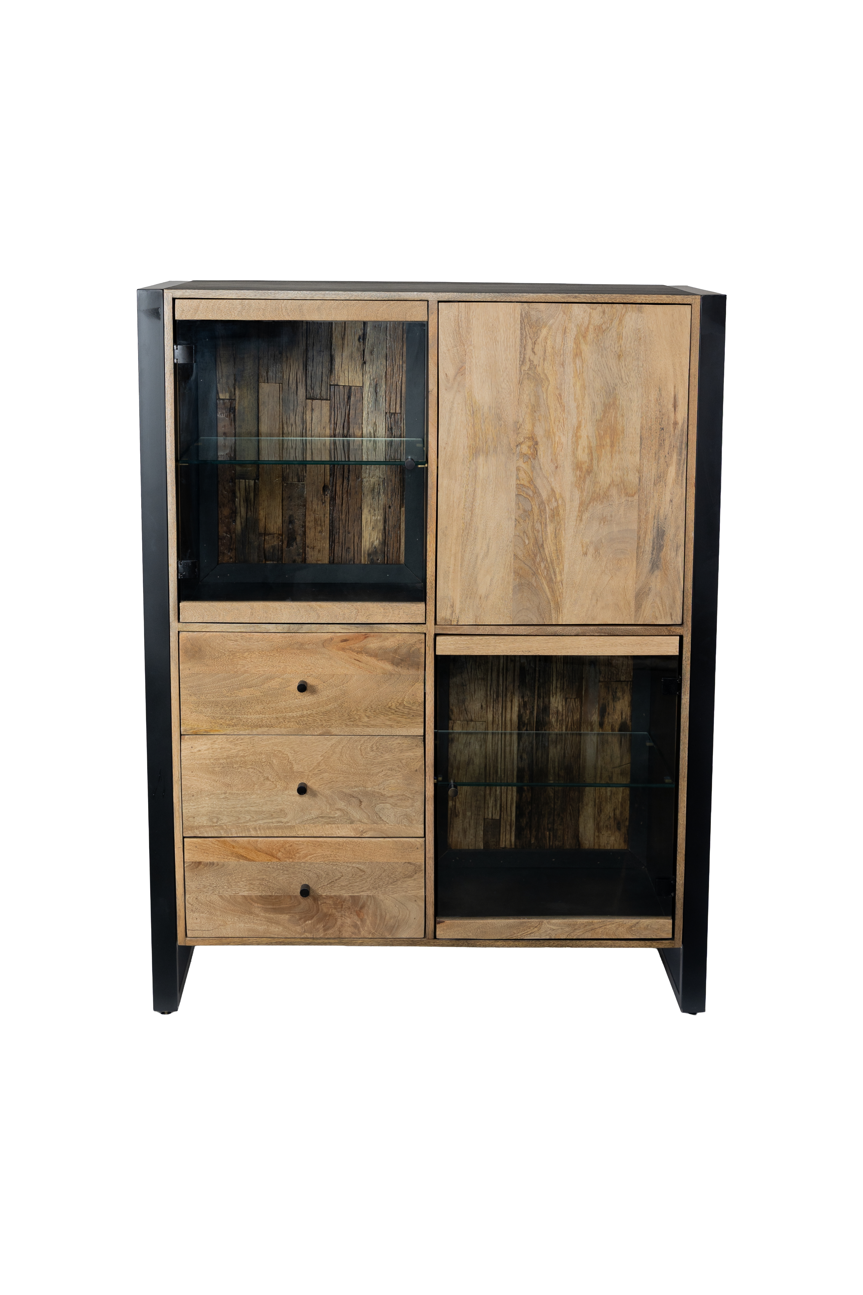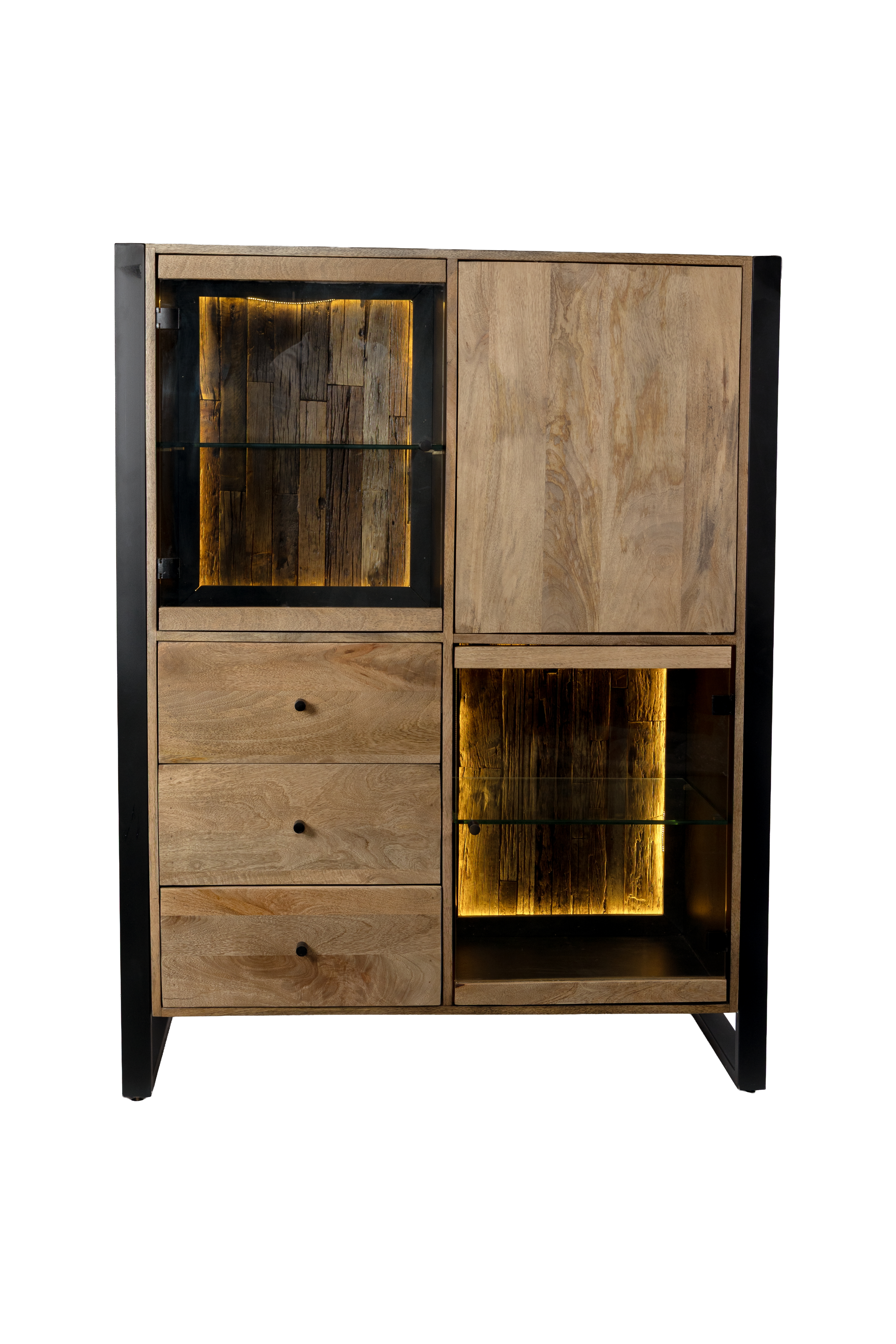 Die integrierte Glas-Tür sorgt für eine elegante Optik und ermöglicht einen stilvollen Blick auf den Innenraum. Ein besonderes Detail ist die Rückwand aus recyceltem Holz, die jedes Highboard zu einem individuellen Unikat macht und zugleich den nachhaltigen Charakter des Möbelstücks unterstreicht.