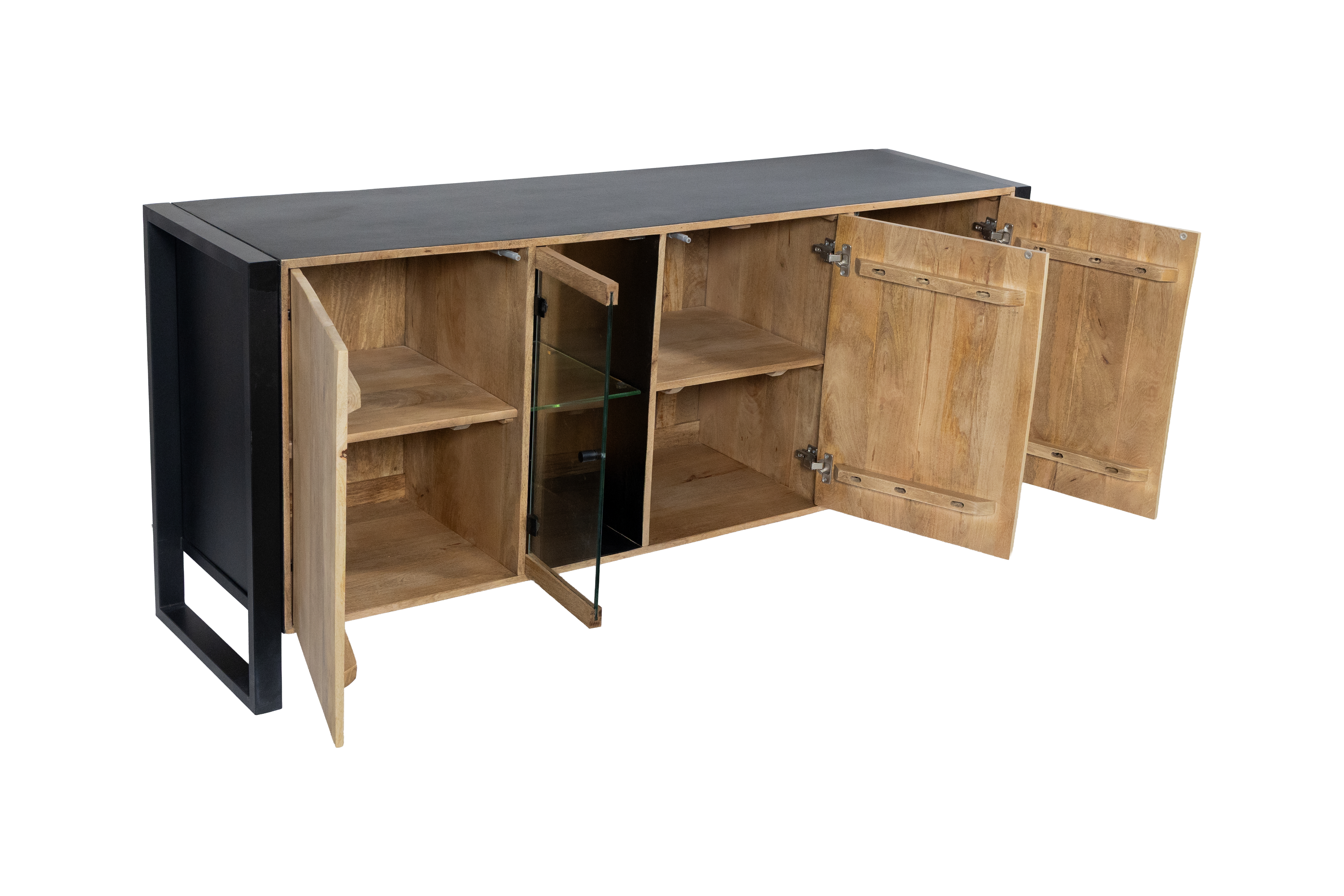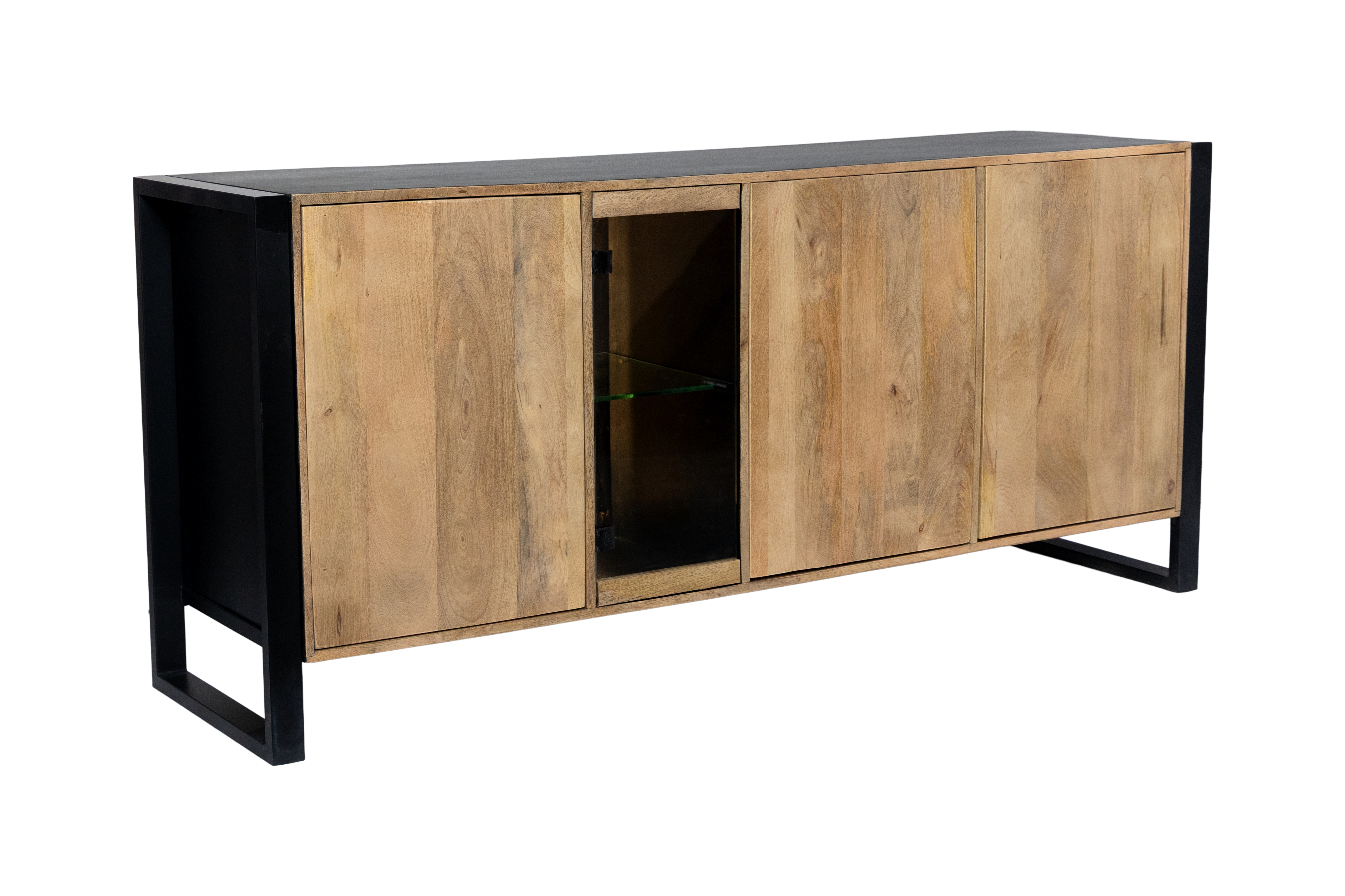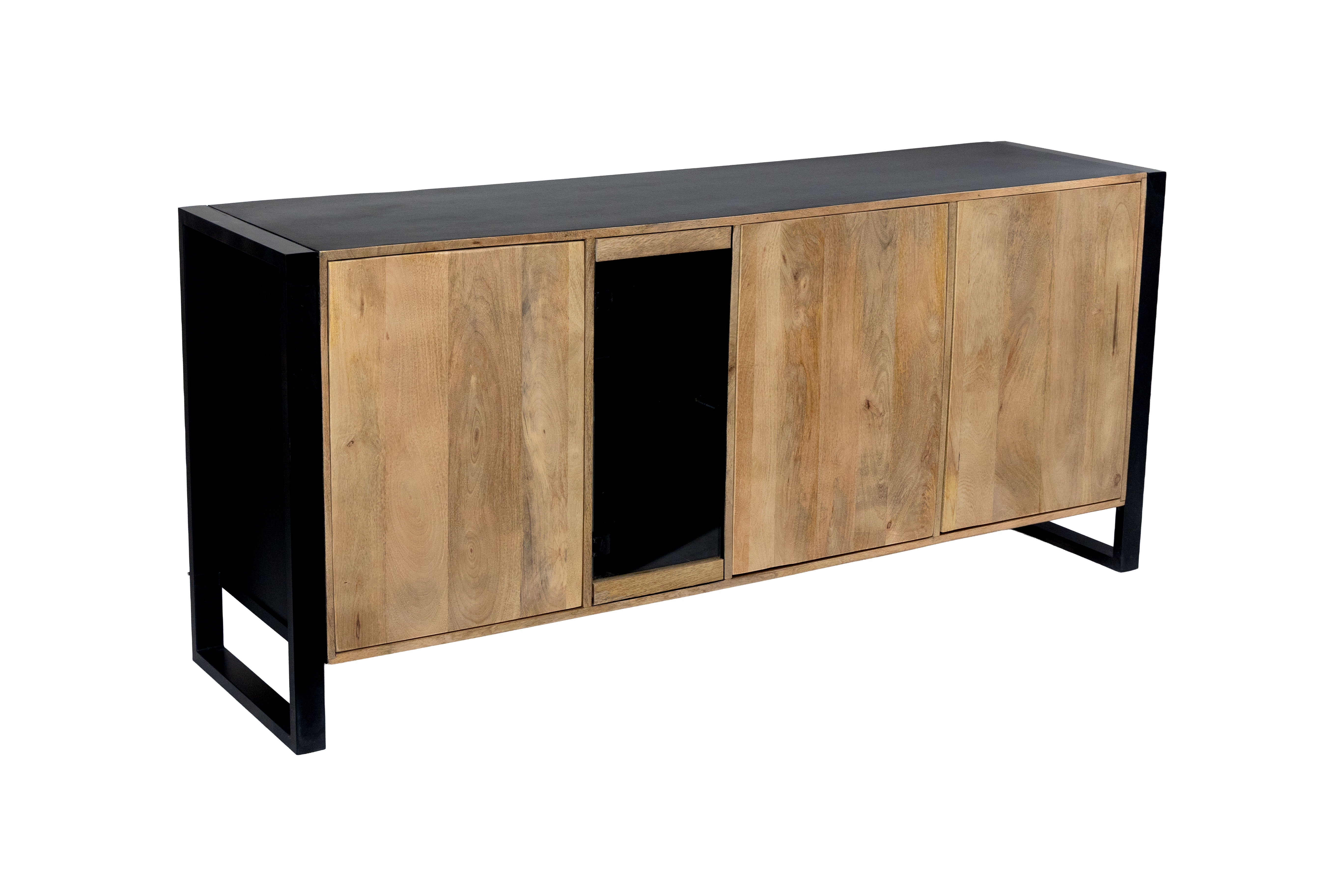 Das Sideboard MAYA überzeugt durch die gelungene Kombination aus massivem Mango-Holz und stabilem Eisen und bringt einen modernen Industrial-Look in Ihr Zuhause. Die lackierte Oberfläche in Schwarz Matt wird harmonisch durch warme Honigtöne ergänzt und unterstreicht die natürliche Maserung des Holzes.