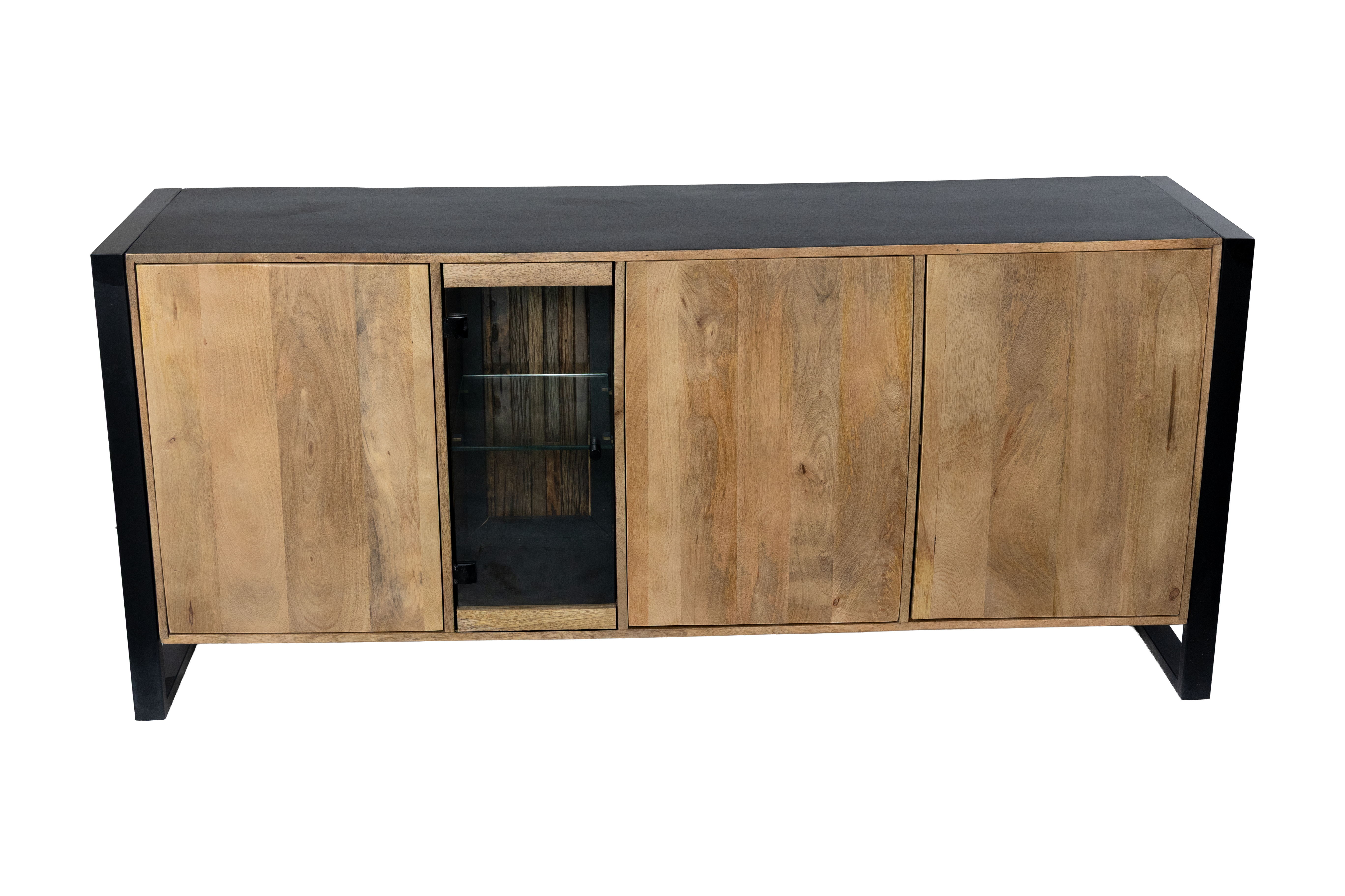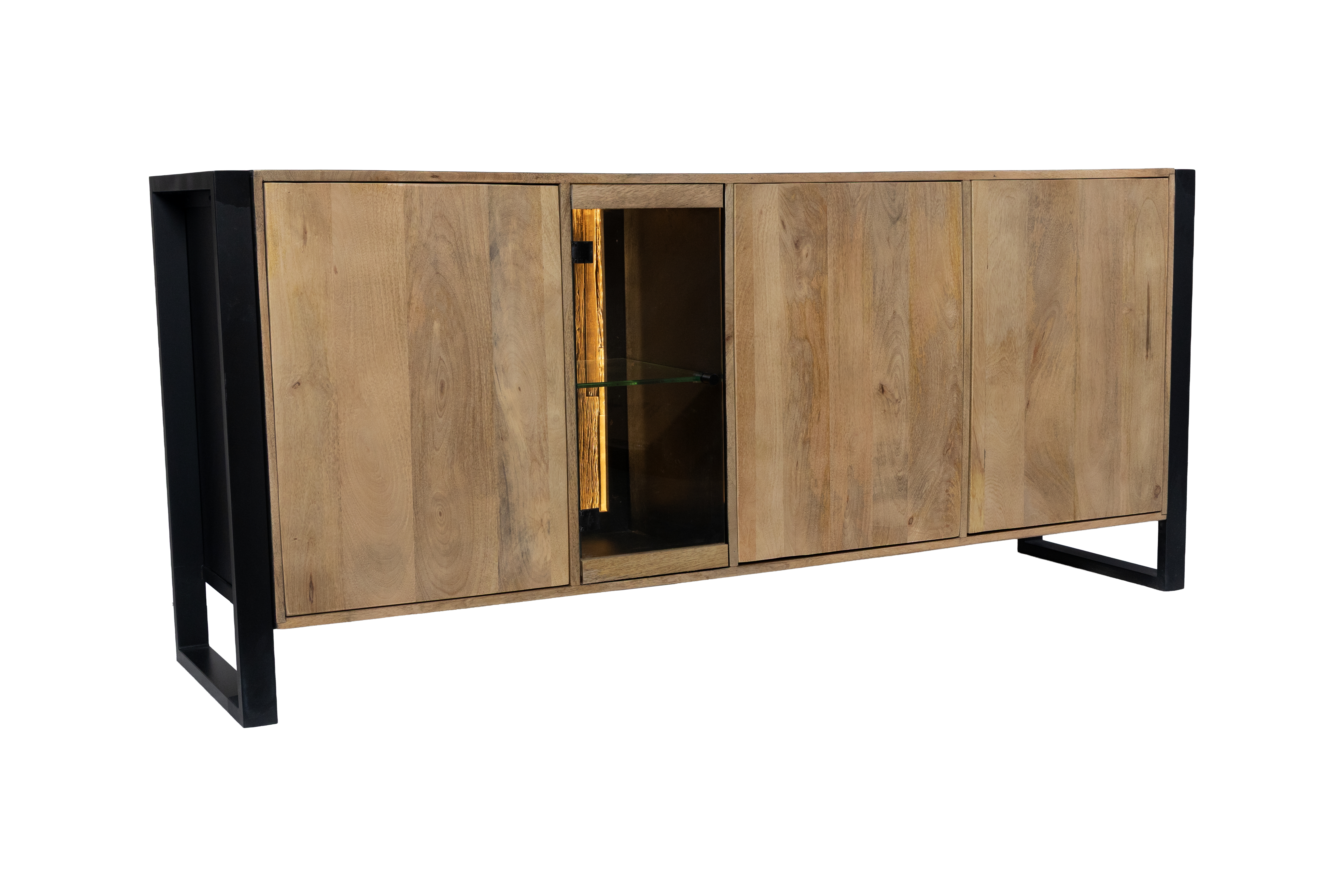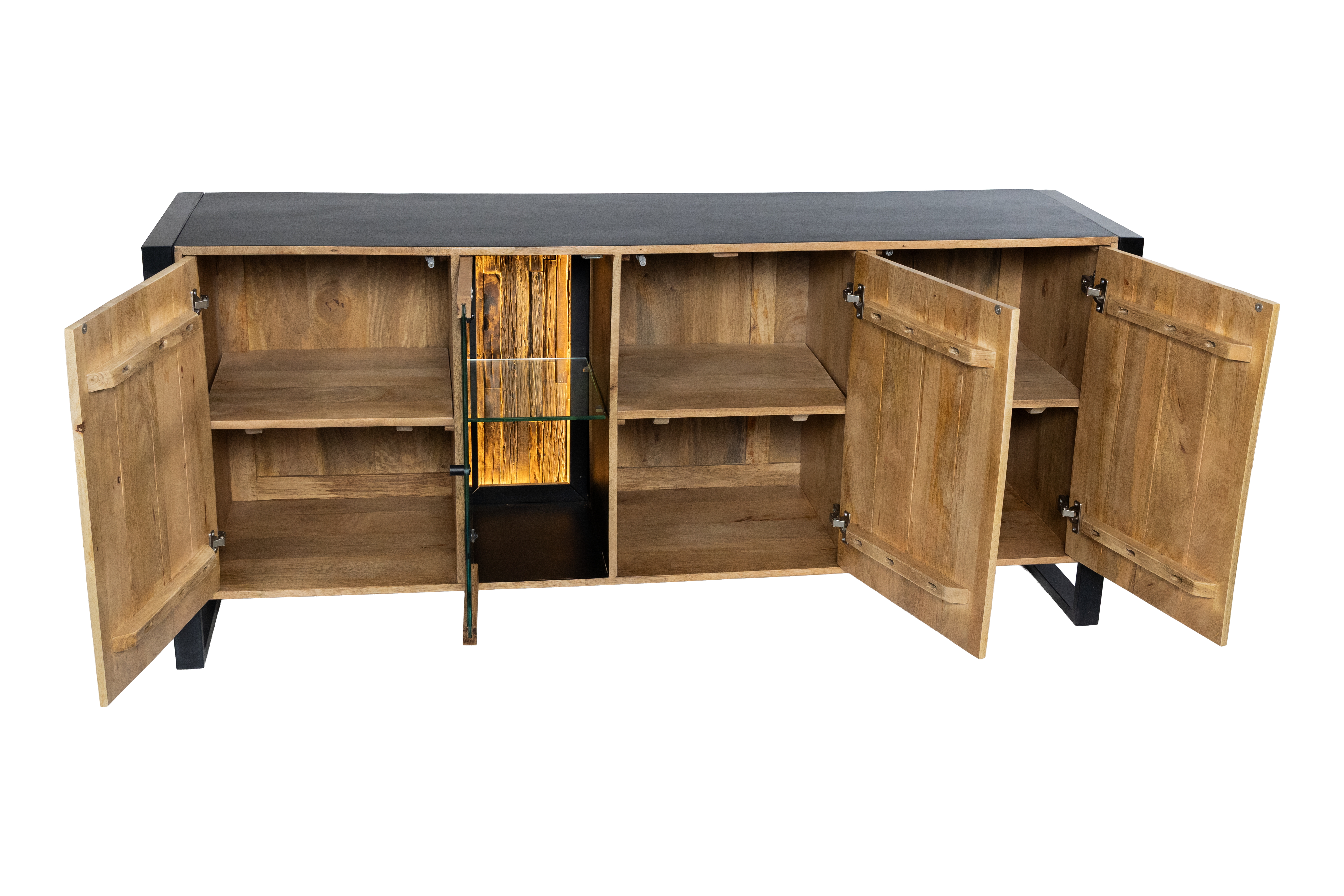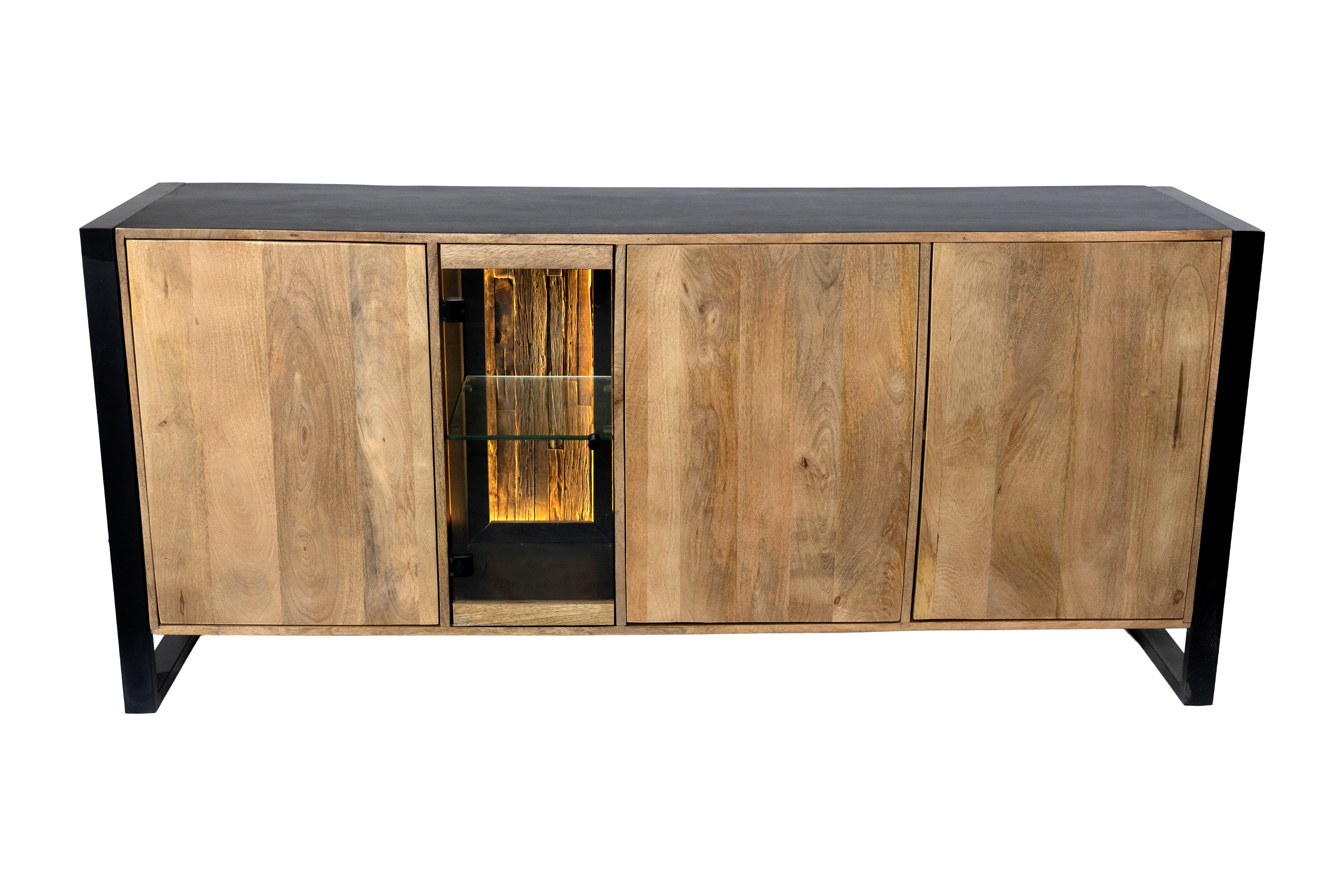 Das Sideboard MAYA überzeugt durch die gelungene Kombination aus massivem Mango-Holz und stabilem Eisen und bringt einen modernen Industrial-Look in Ihr Zuhause. Die lackierte Oberfläche in Schwarz Matt wird harmonisch durch warme Honigtöne ergänzt und unterstreicht die natürliche Maserung des Holzes.