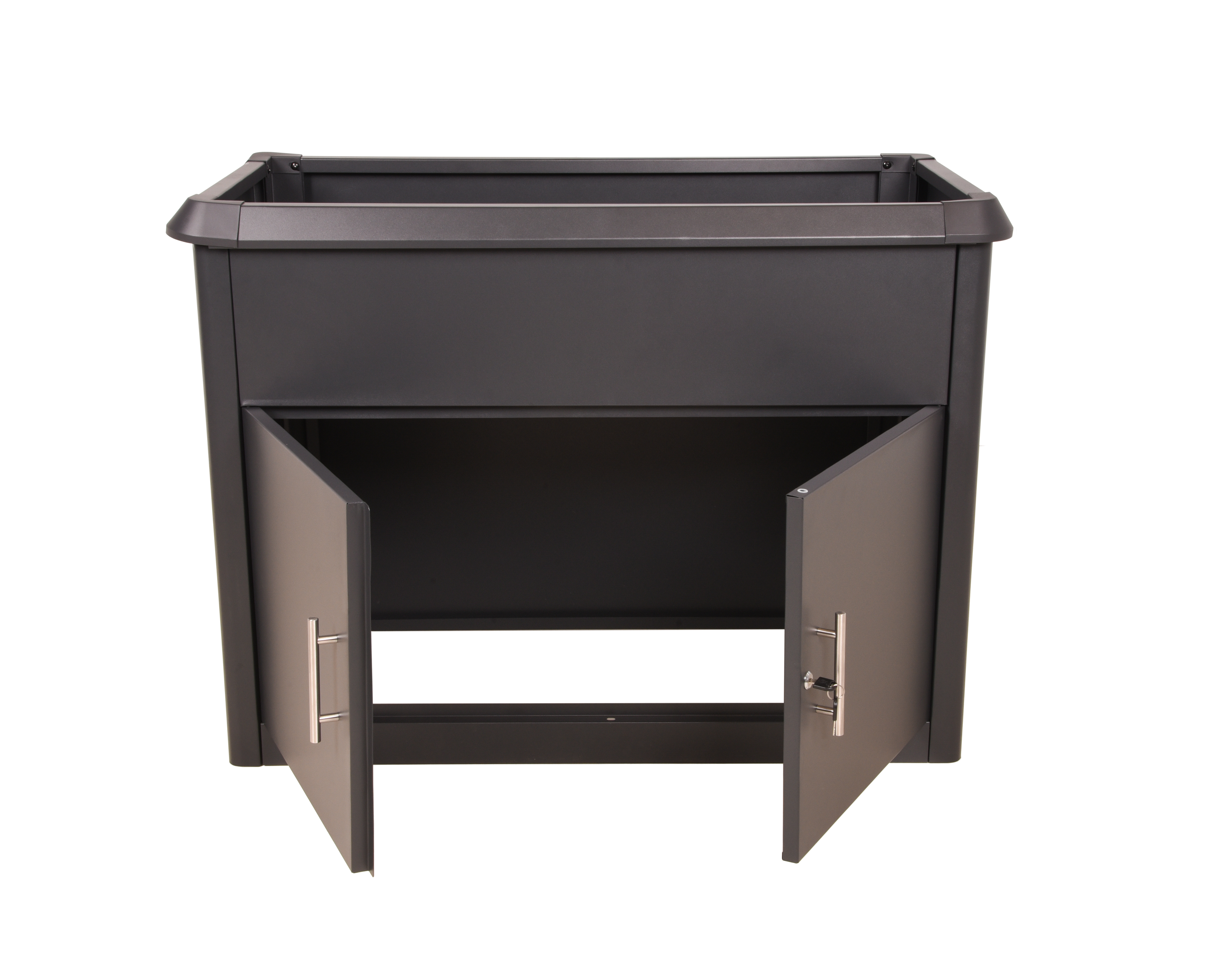 Mit dem Hochbeet ZINNIA bringen Sie stilvolle Gartenfreude auf Balkon, Terrasse oder in den Garten: Das anthrazitfarbene, galvanisierte und pulverbeschichtete Stahlbeet ist robust, wetterfest und misst 107 × 57 × 78 cm. Dank selbstbewässernder Pflanzschicht und schneckenabweisendem Rand gedeihen Kräuter, Gemüse und Blumen besonders komfortabel und geschützt. Überschüssiges Wasser kann über ein verschließbares Loch in der Bodenmitte ablaufen – der umschaltbare Abflussstopfen macht ZINNIA dabei sowohl für den Innen- als auch Außenbereich ideal. Unter der Pflanzfläche bietet der integrierte Schrank (Innenmaß 96 × 46,5 × 51 cm) mit verschließbarer Tür praktischen Stauraum für Erde, Werkzeug oder Gießkanne und trägt bis zu 35 kg.