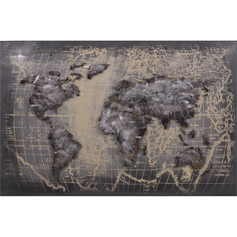 Dieses beeindruckende 3D Metallbild zeigt eine detailgetreue Weltkarte und ist aus hochwertigem grauem Metall gefertigt.