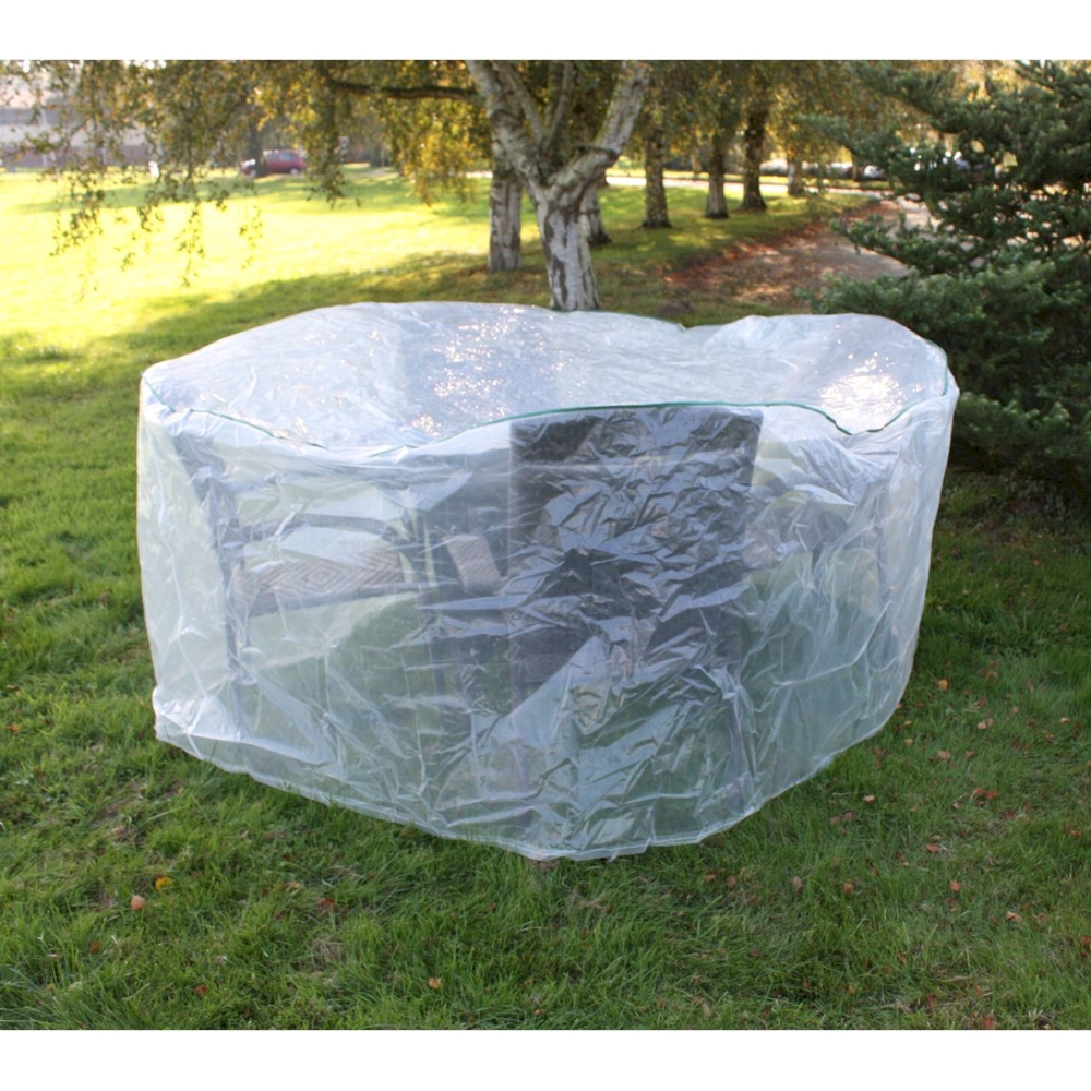 Unsere Abdeckhaube für 4 Stapelstühle und einen runden Tisch bietet Ihnen den perfekten Schutz für Ihre Gartenmöbel. Hergestellt aus transparentem PE mit einer Dichte von 135g/m² ist diese Abdeckhaube robust und witterungsbeständig, was Ihre Möbel vor den Elementen schützt.