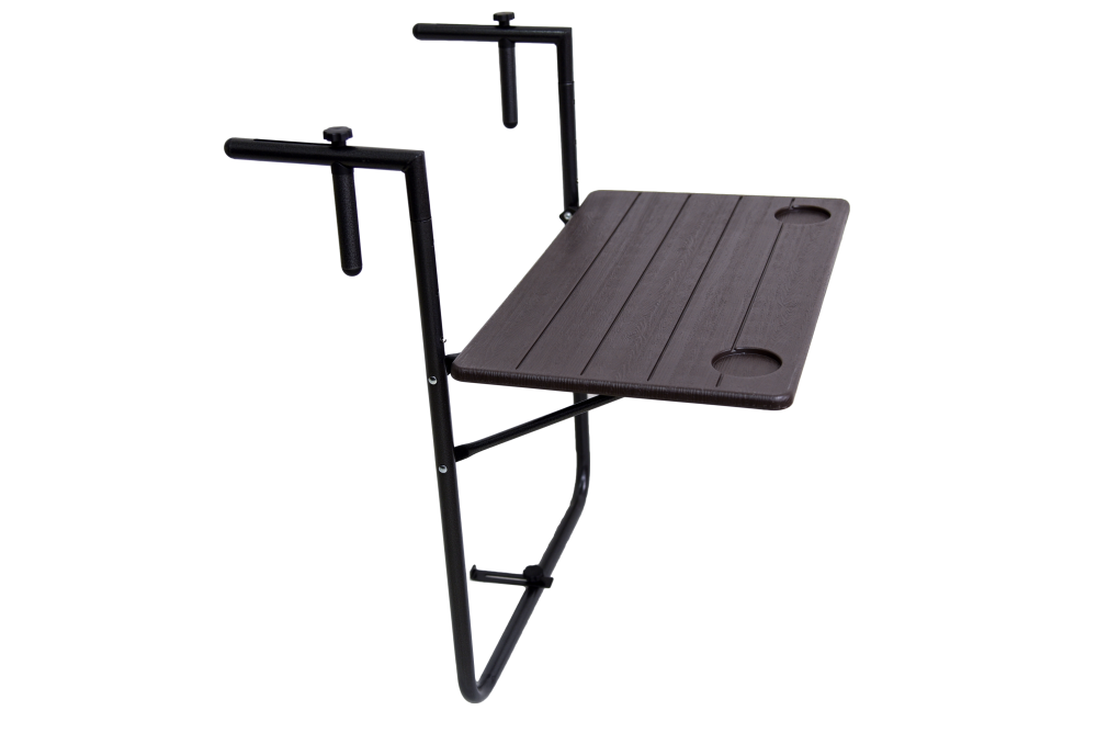 Der Hängetisch hat ein Stahlgestell (schwarz) und die Tischplatte hat eine Holzoptik (Material Kunststoff / HDPE).