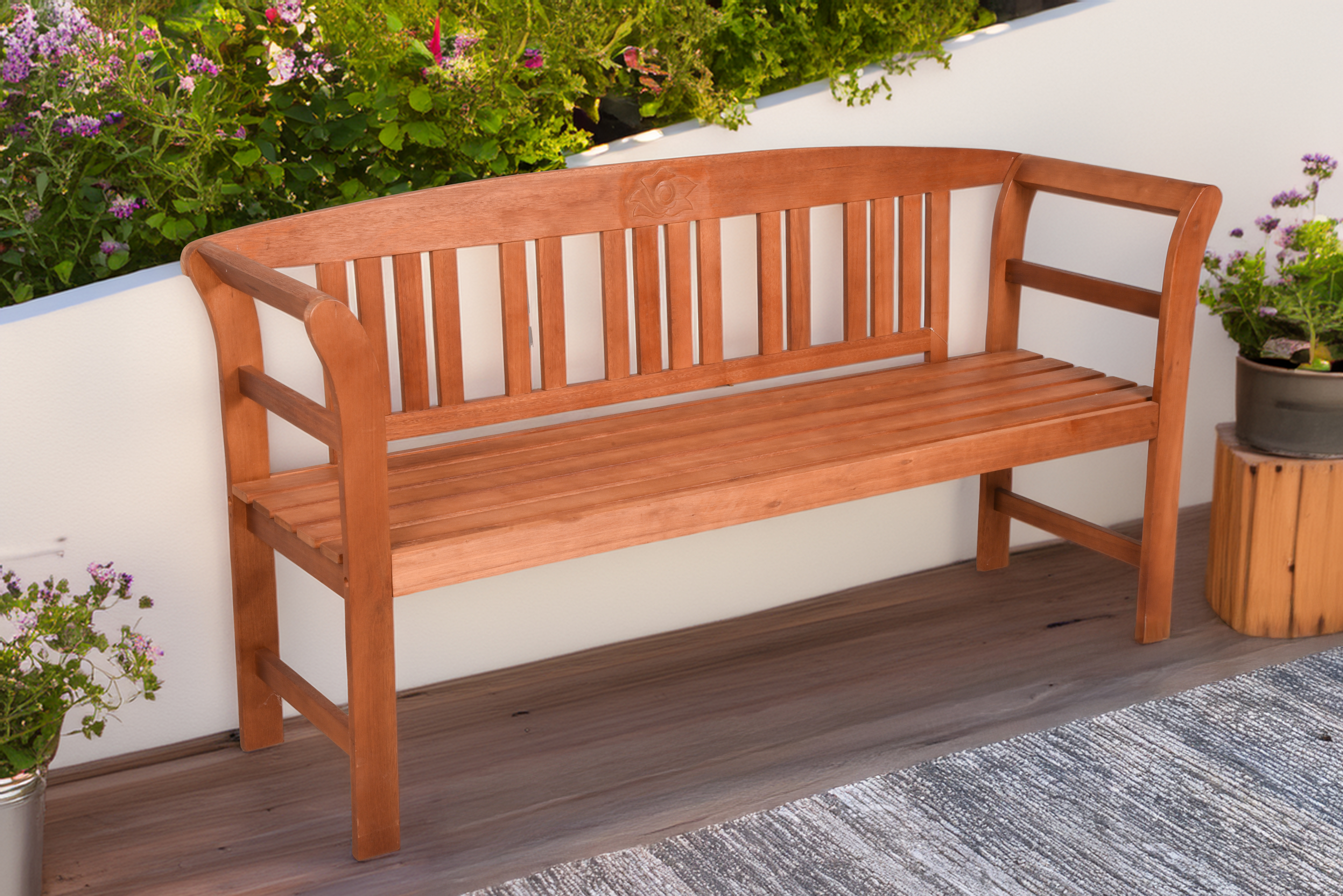 Die HARLAND Bank bietet bequem Platz für bis zu drei Personen und verfügt über eine elegante Rosenverzierung, die in das Rückenlehnen-Design integriert ist. Dies verleiht der Bank eine romantische und charmante Atmosphäre. Das geölte Eukalyptus Grandis Holz schützt nicht nur vor den Elementen, sondern verleiht der Bank auch ein warmes und ansprechendes Erscheinungsbild. Genießen Sie entspannte Momente im Freien auf der HARLAND Bank, sei es beim Lesen eines Buches, beim Genießen einer Tasse Kaffee oder beim Beobachten der Natur.