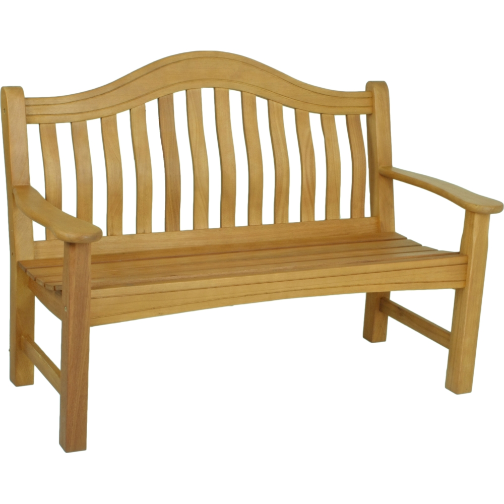 Durch das mittelrot geölte Eukalyptusholz erinnert die Bank mit großzügigen Armauflagen an Teakholz.