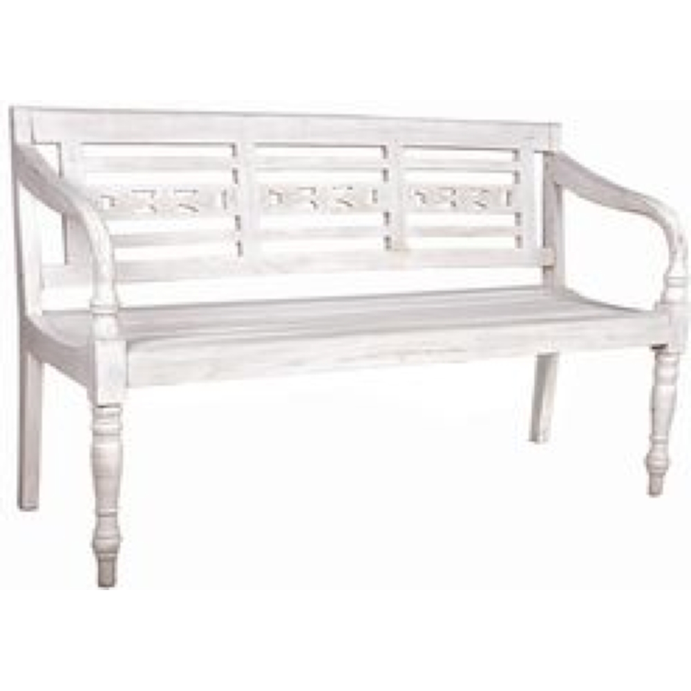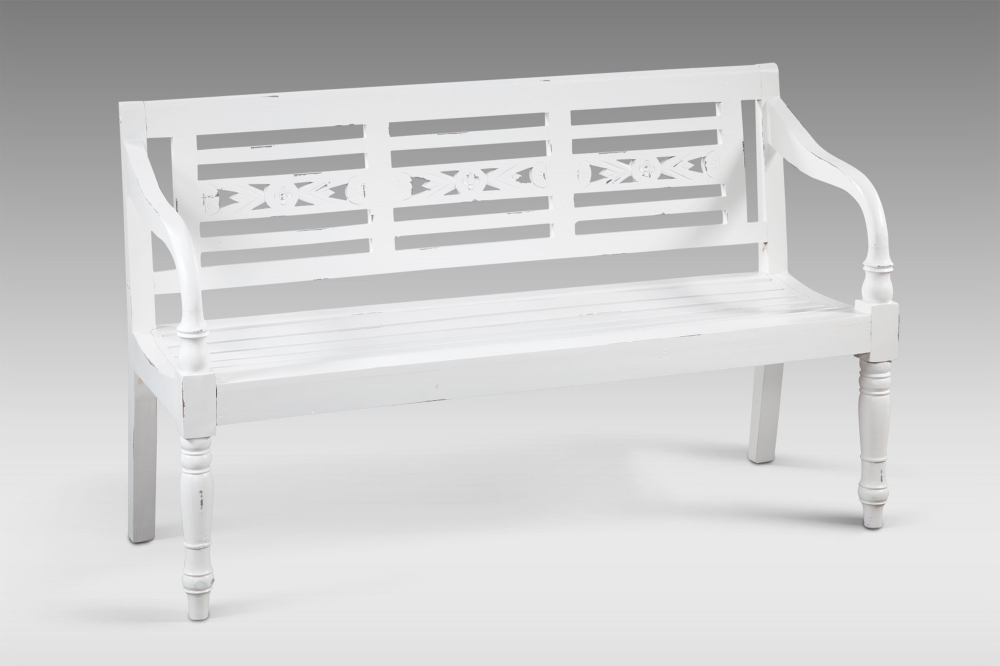 Die 3-Sitzer Bank MOYO ist ein elegantes Möbelstück, das aus hochwertigem Mahagoniholz gefertigt wurde. Die Bank verfügt über eine ansprechende weiß-antike Optik, die jedem Raum eine warme und einladende Atmosphäre verleiht.