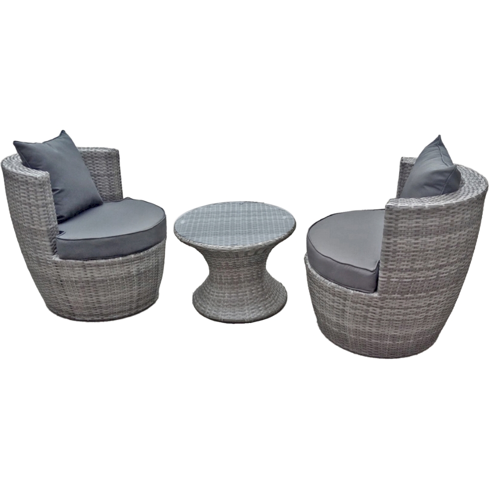 Das Set besteht aus zwei Sesseln, die mit Sitzkissen und Rückenkissen ausgestattet sind, sowie einem kleinen Tisch.