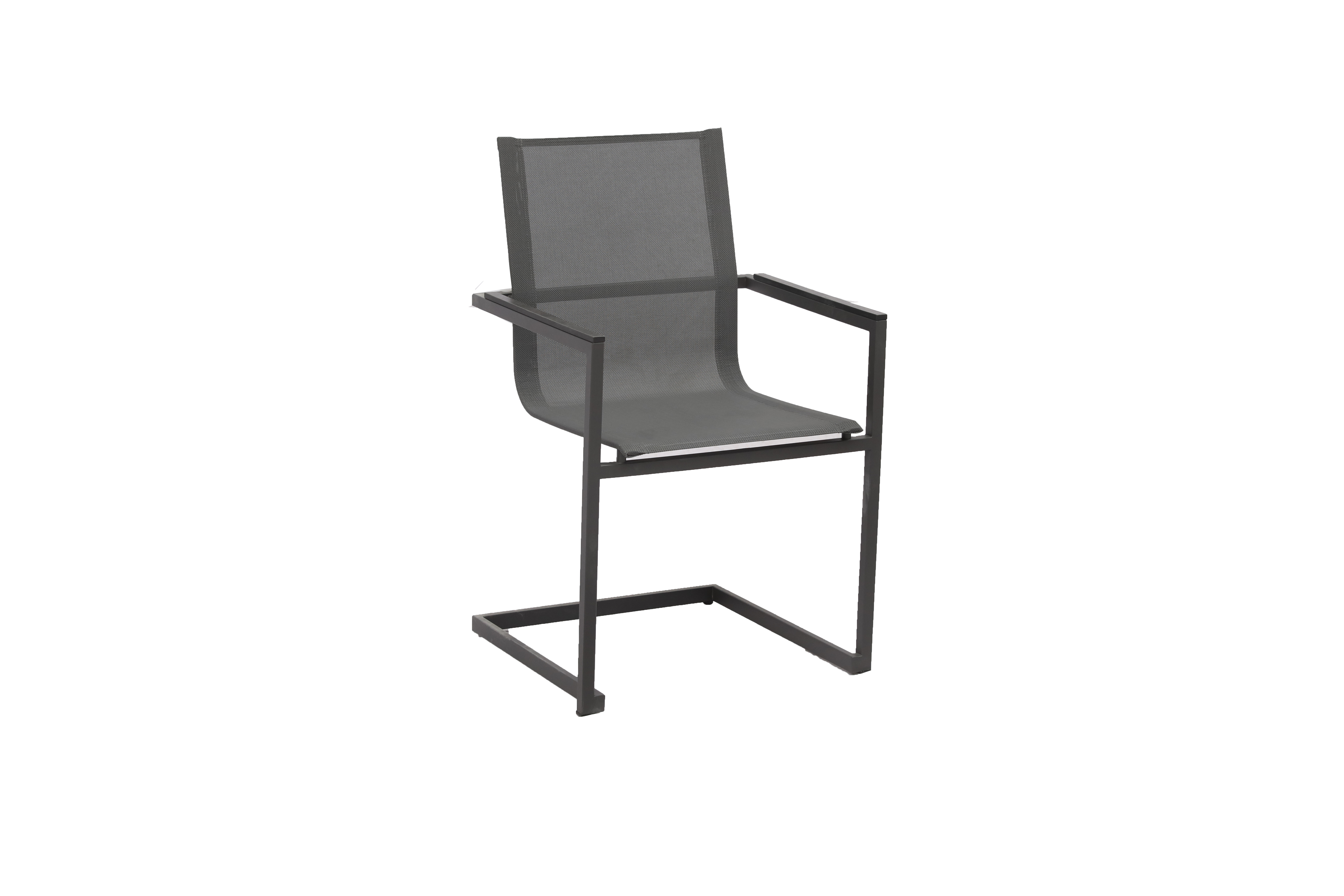 Die Sitz- und Rückenflächen des Stuhls sind mit grauem Kunststoffgewebe bezogen, das nicht nur bequem ist, sondern auch wetterbeständig und pflegeleicht. Das 2x2-Muster verleiht dem Stuhl eine moderne Optik und sorgt gleichzeitig für Belüftung und Komfort.
