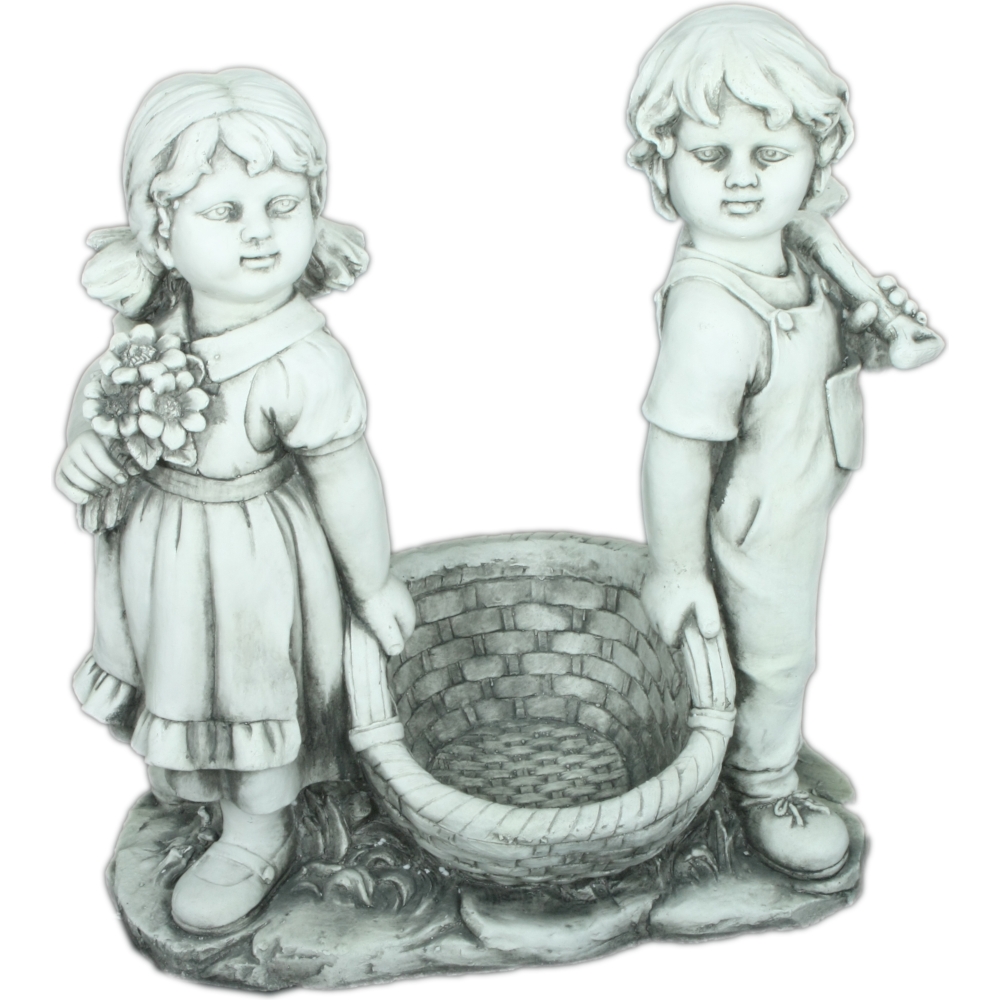 Die beiden Figuren bestehen aus robustem und langlebigem Fiberglas in Steinoptik, das UV-beständig und wetterfest ist.