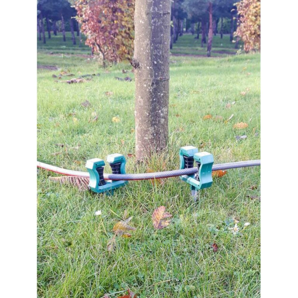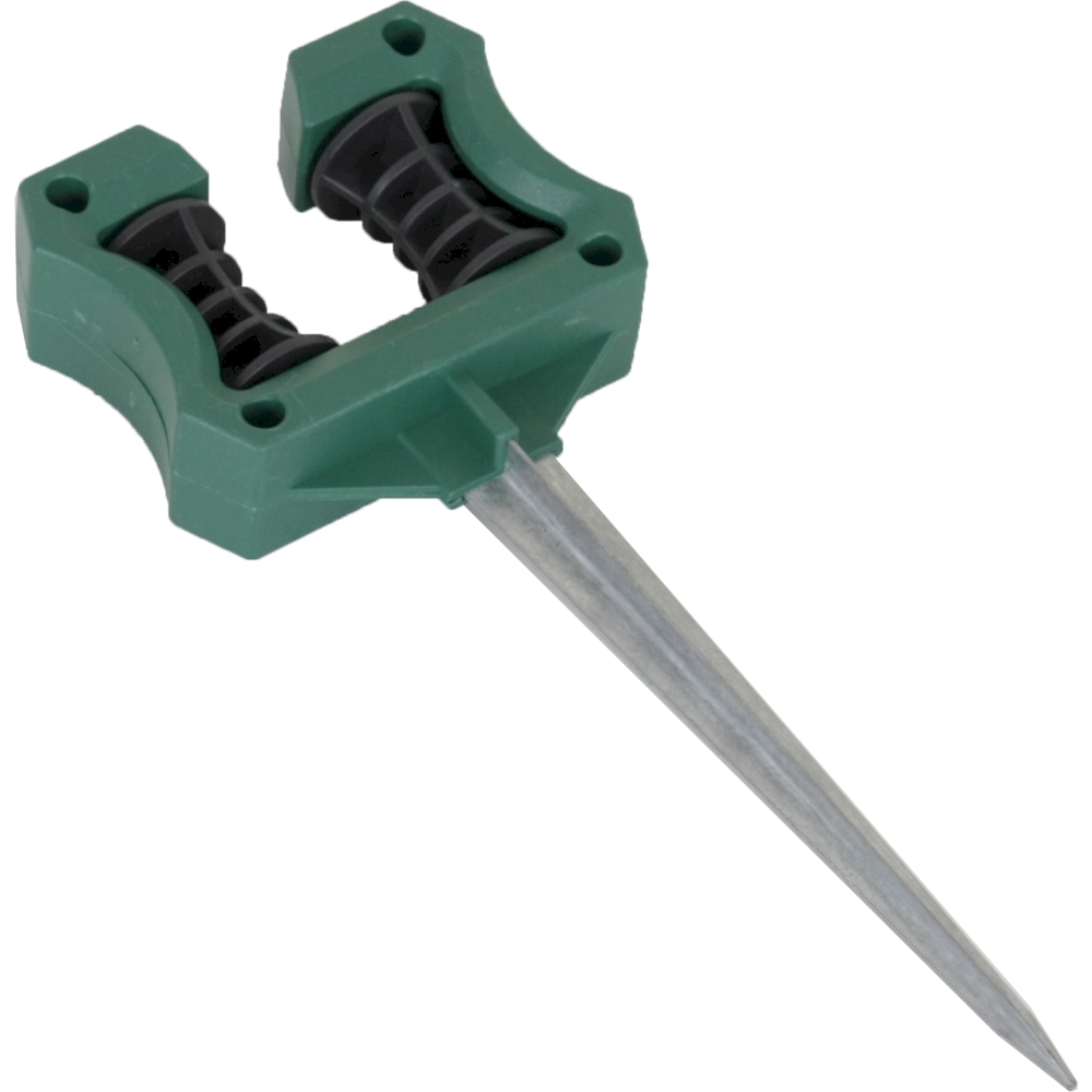 Der mitgelieferte Spieß aus silberfarbenem Zink ermöglicht es Ihnen, die Halterung sicher im Boden zu verankern, sodass der Schlauch stabil gehalten wird.