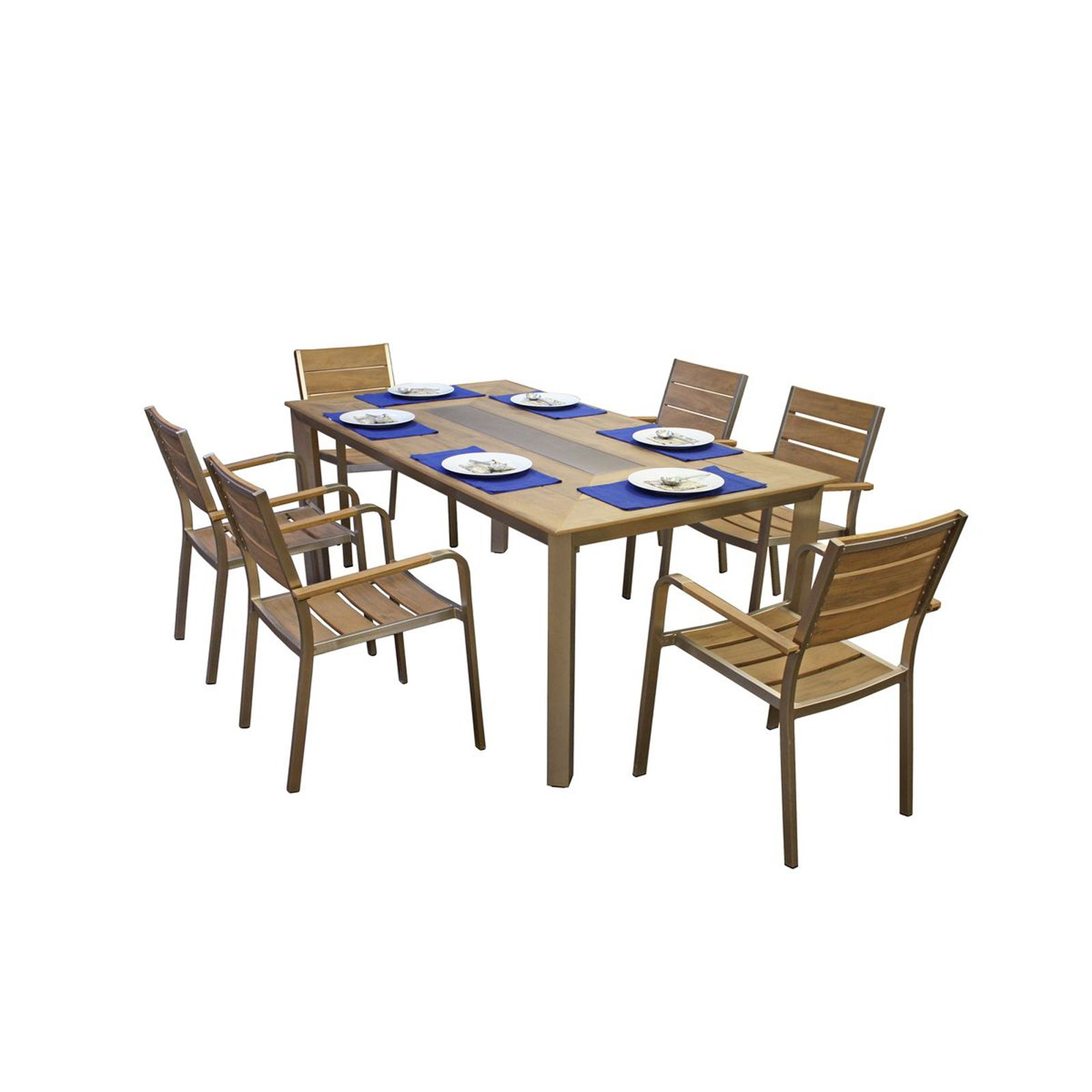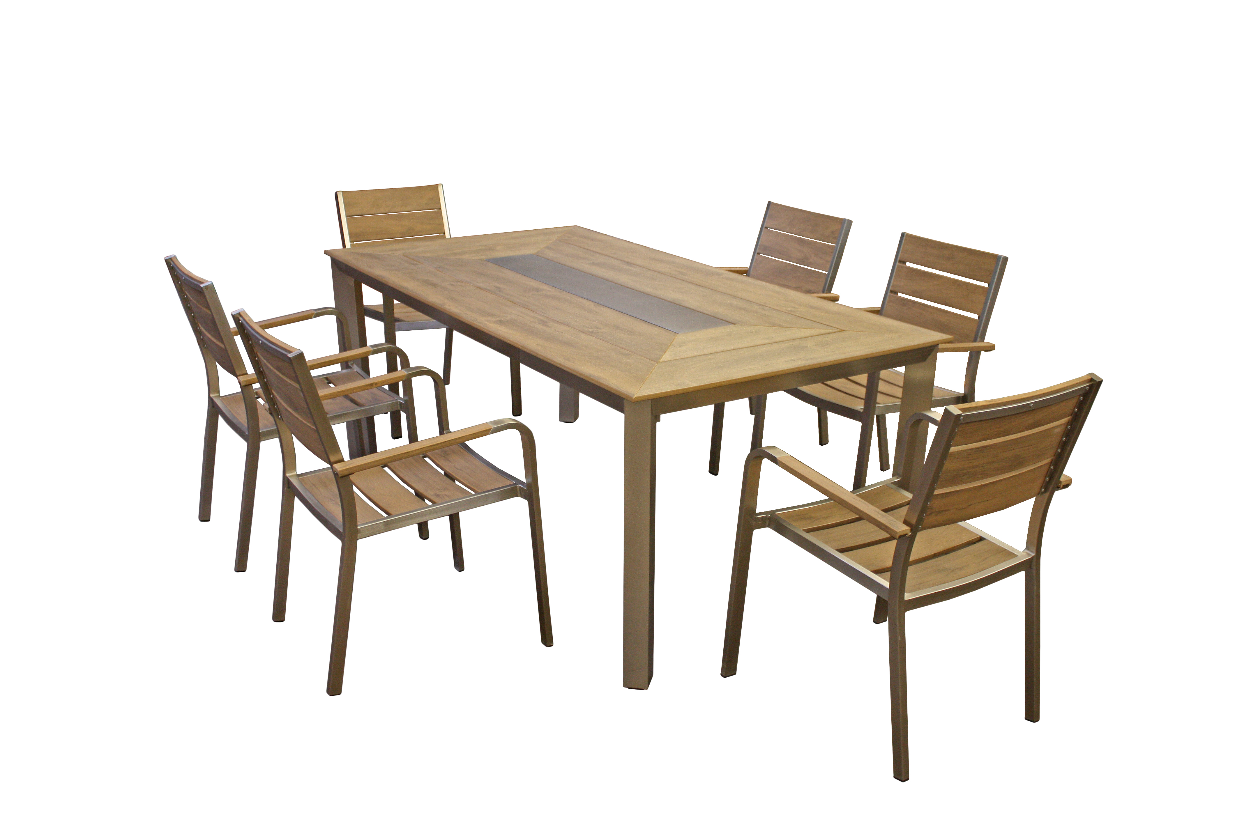 Die sechs Stapelstühle sind aus hochwertigem champagnerfarbenem Aluminium gefertigt und verfügen über Nonwood-Akzente in Teak-Optik, die nicht nur ästhetisch ansprechend sind, sondern auch Stabilität und Langlebigkeit bieten. Die Stapelfunktion ermöglicht es Ihnen, die Stühle bei Nichtgebrauch platzsparend zu verstauen.