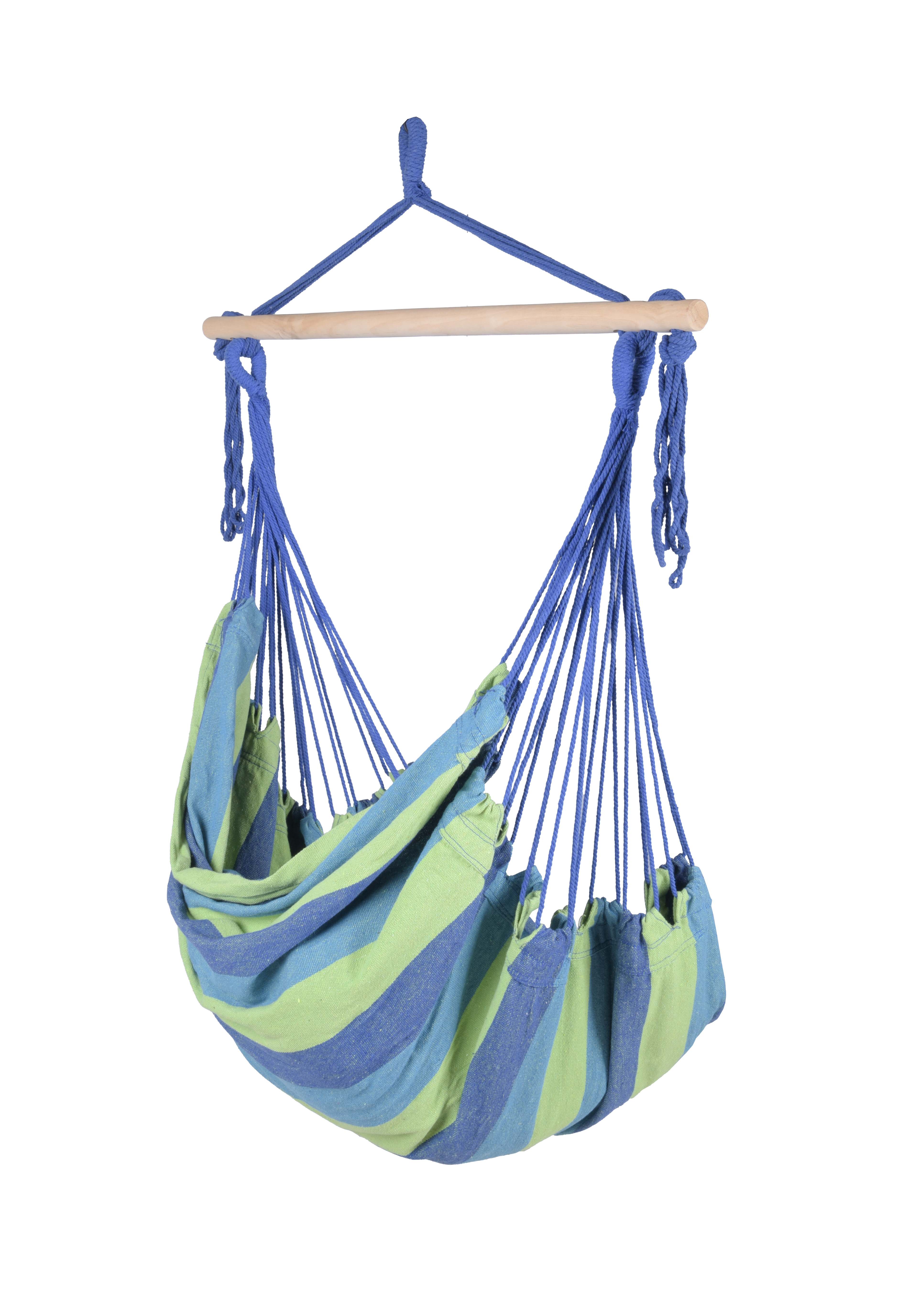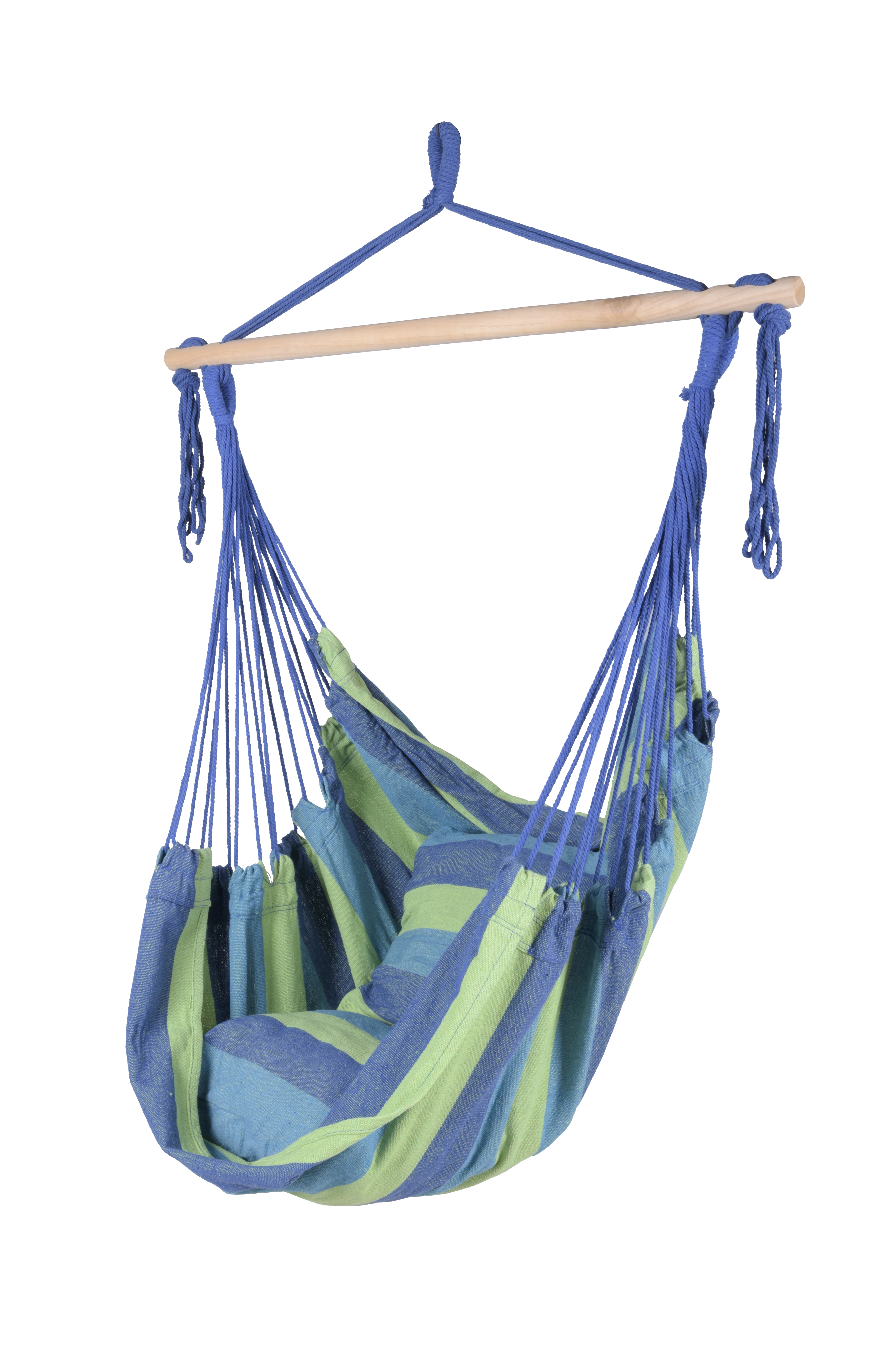 Der Hängesessel TOBAGO ist ein einladendes und komfortables Möbelstück, das perfekt zum Entspannen und Ausruhen im Freien geeignet ist. Der Sessel besteht aus einem Baumwoll-Polyester-Mix in verschiedenen Grün- und Blautönen, die eine angenehme und entspannende Atmosphäre schaffen.