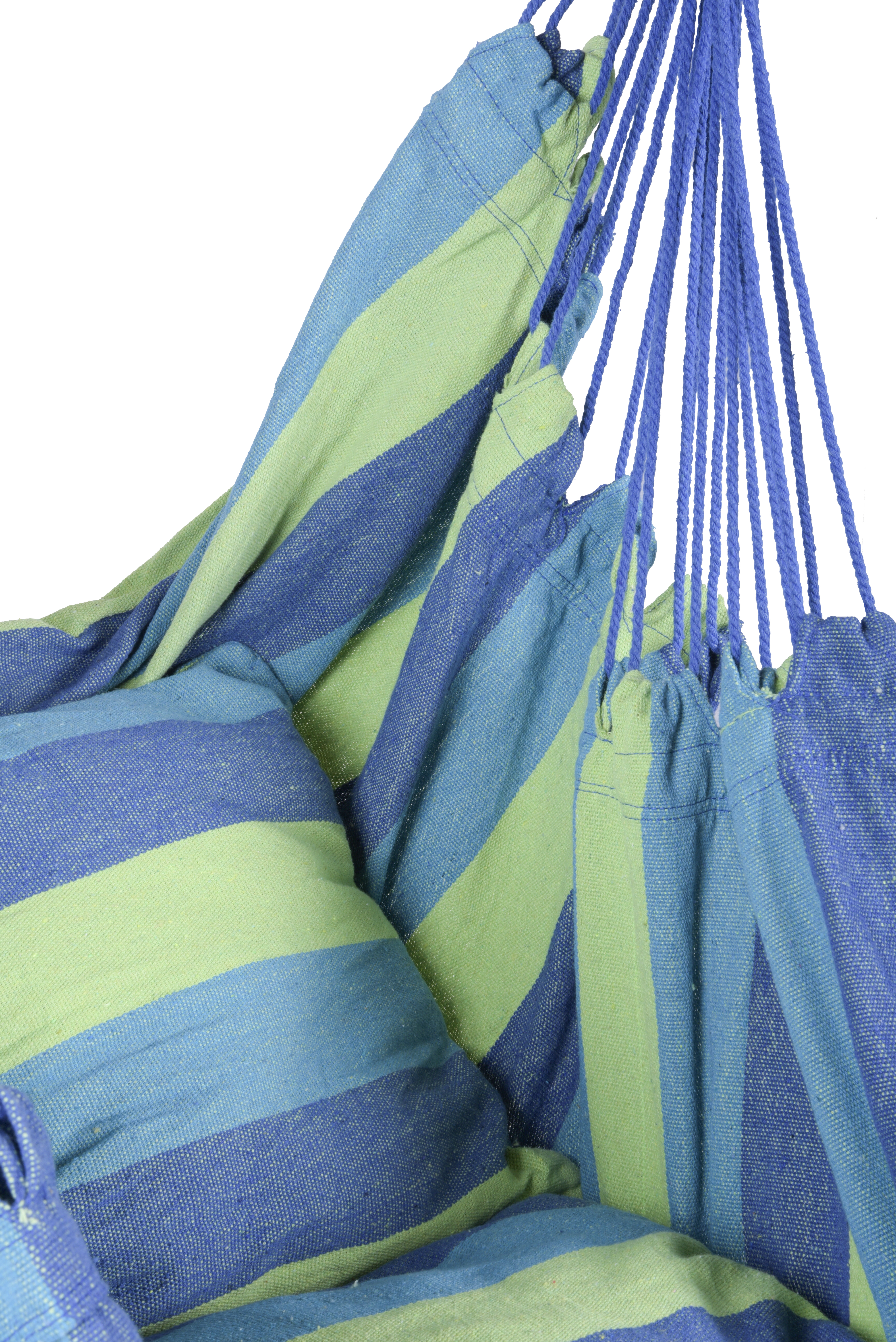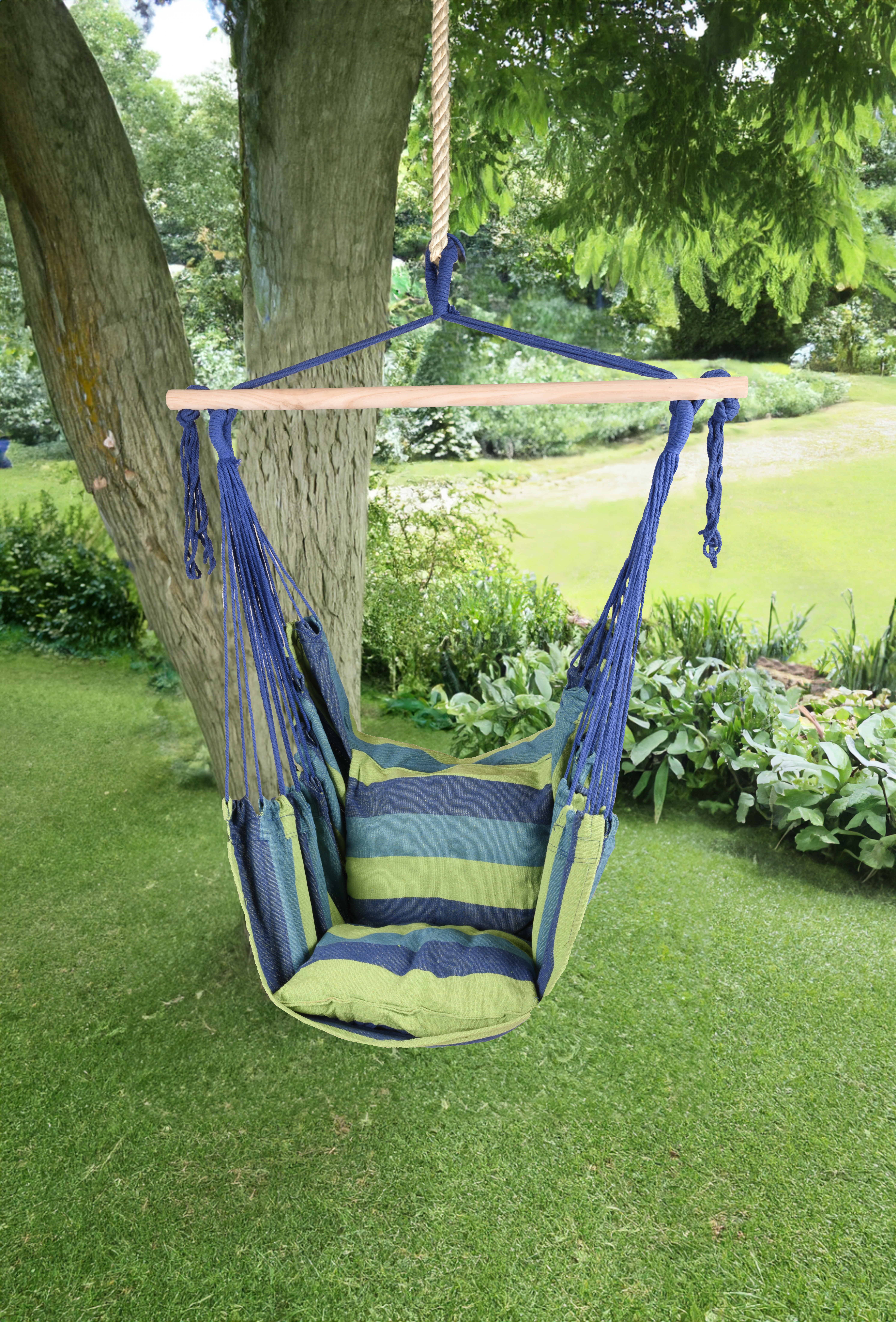 Der TOBAGO Hängesessel ist auch optisch ansprechend und verleiht Ihrem Außenbereich eine moderne und ruhige Ausstrahlung. Die grünen und blauen Farbtöne des Baumwoll-Polyester-Mixes schaffen eine harmonische und beruhigende Atmosphäre, die Ihnen dabei hilft, sich zu entspannen und Ihre Zeit im Freien zu genießen.