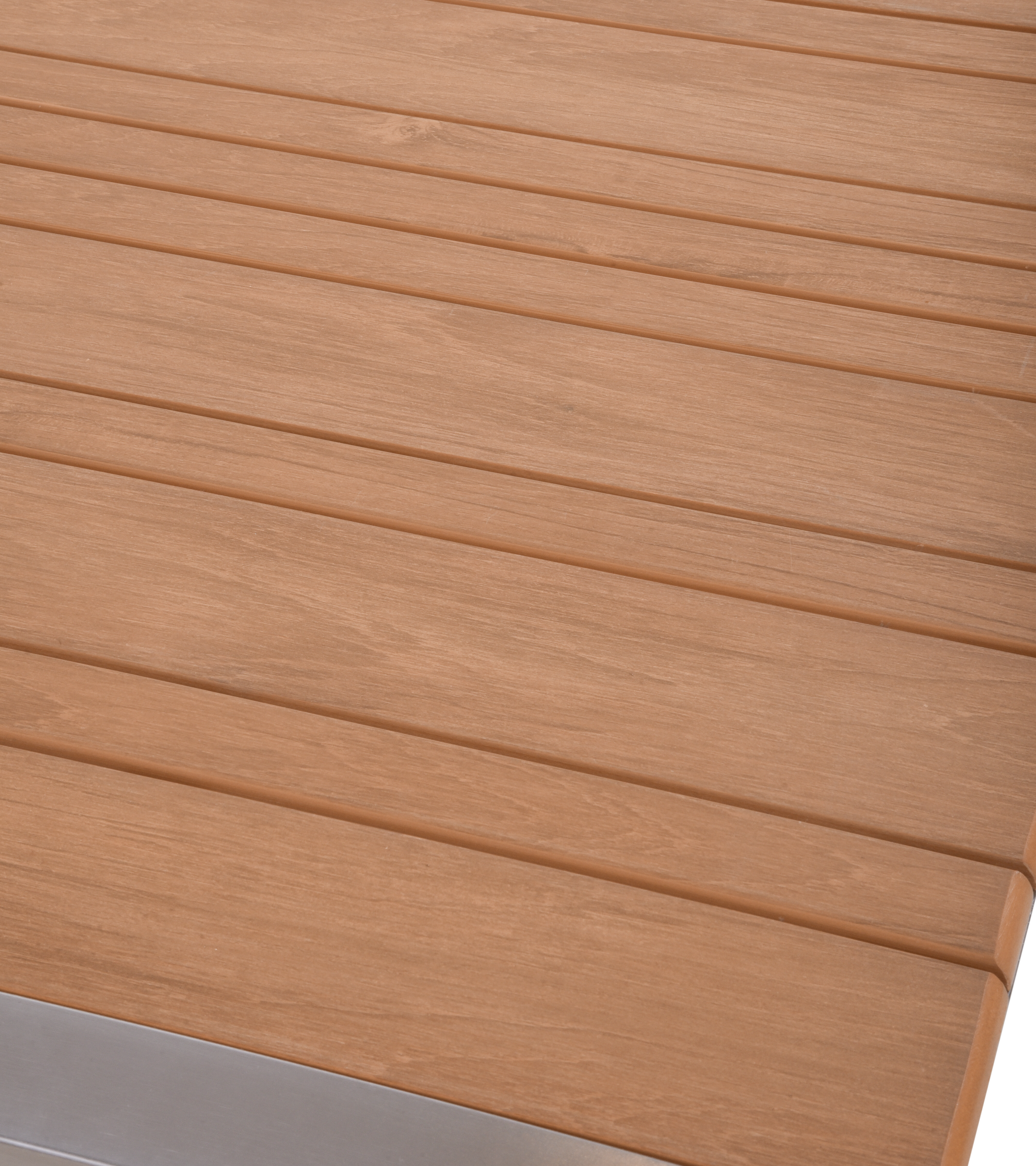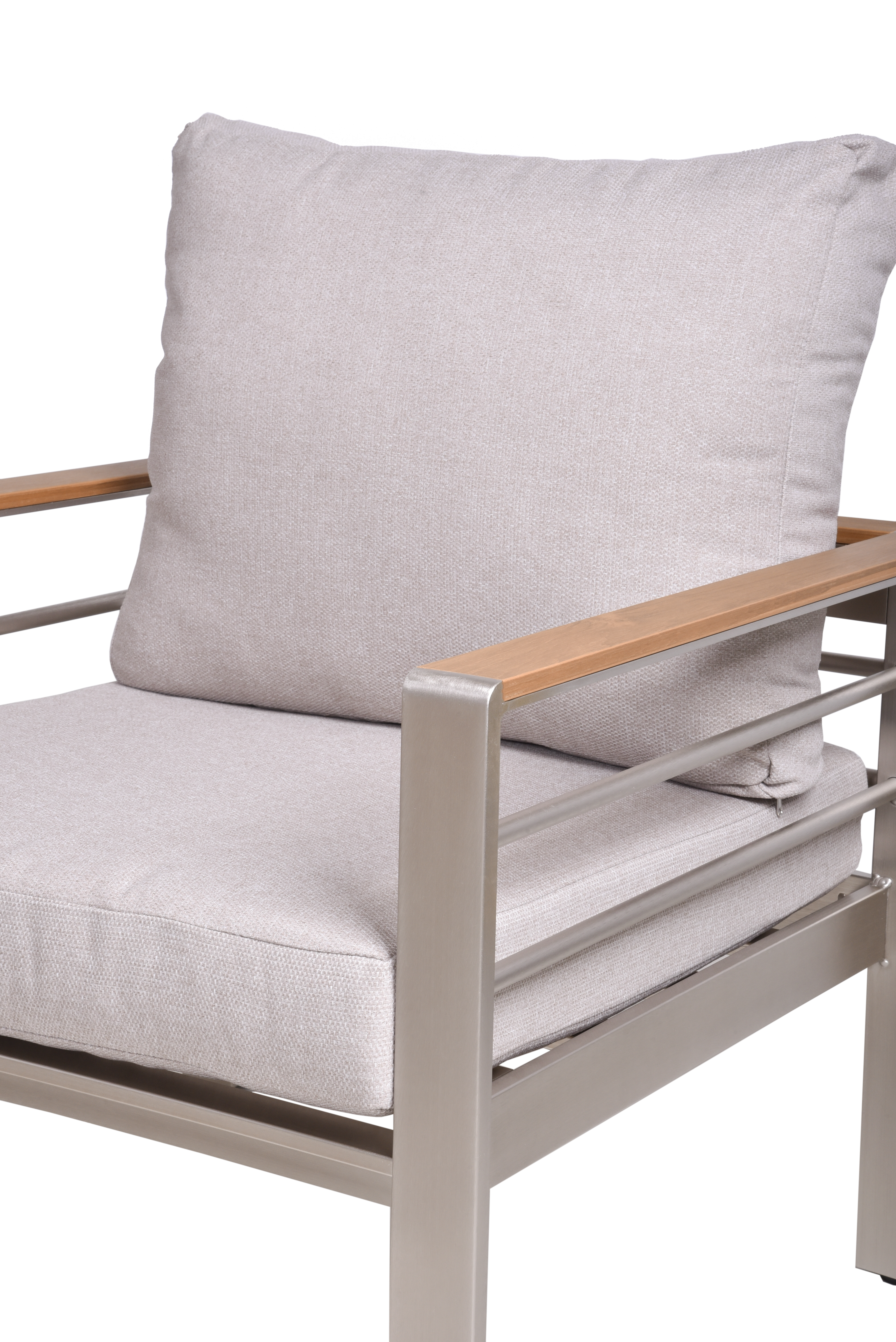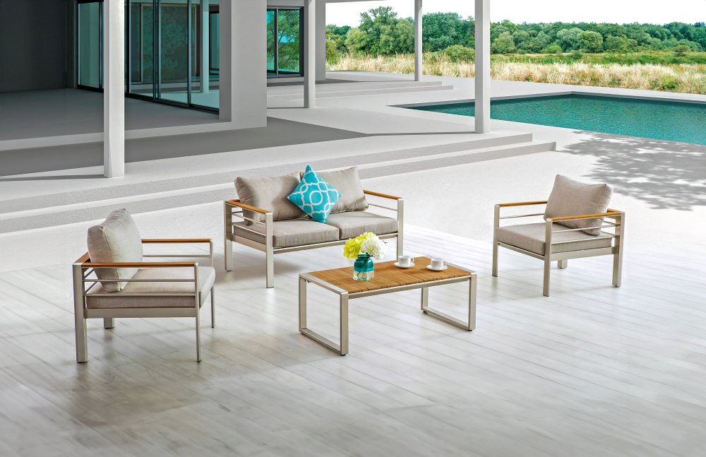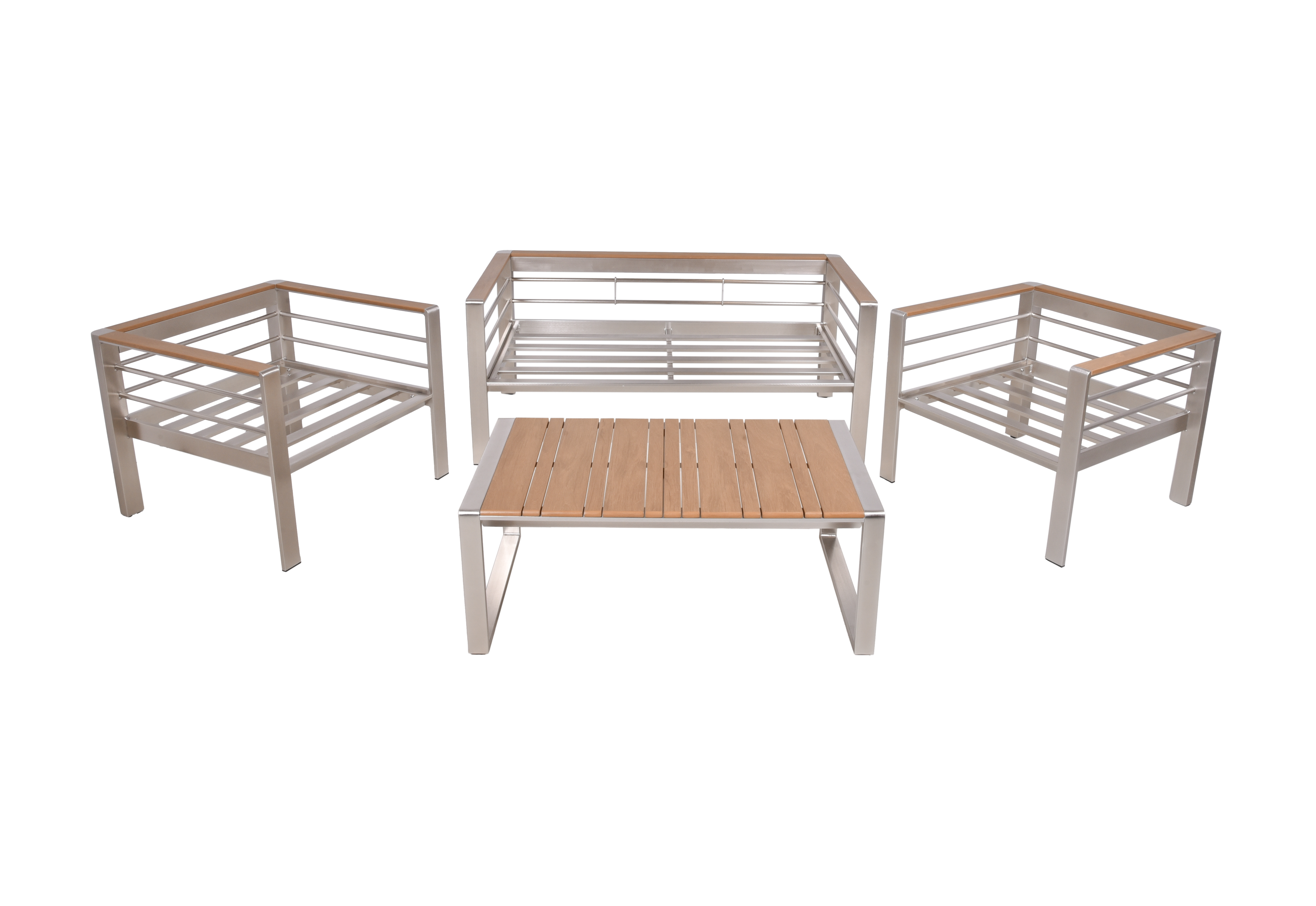 Das Set besteht aus einem hochwertigen, gebürsteten Champagner Aluminiumrahmen und Non-Wood-Elementen in holzfarbenem Finish, die sowohl modernes Design als auch Widerstandsfähigkeit gegenüber den Elementen bieten.