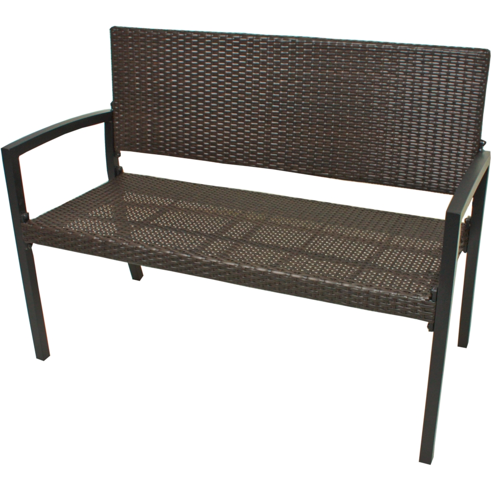 Mit ihrem Aluminiumgestell in Schwarz, einer Sitz- und Rückenfläche aus kunststoffgeflochtenem Material in der Farbe Coffee und Armlehnen aus Aluminium ist diese Parkbank ein echter Blickfang.