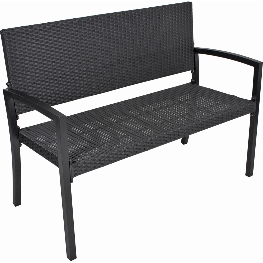 Mit ihrem Aluminiumgestell in Schwarz, einer Sitz- und Rückenfläche aus kunststoffgeflochtenem Material in der Farbe schwarz und Armlehnen aus Aluminium ist diese Parkbank ein echter Blickfang.