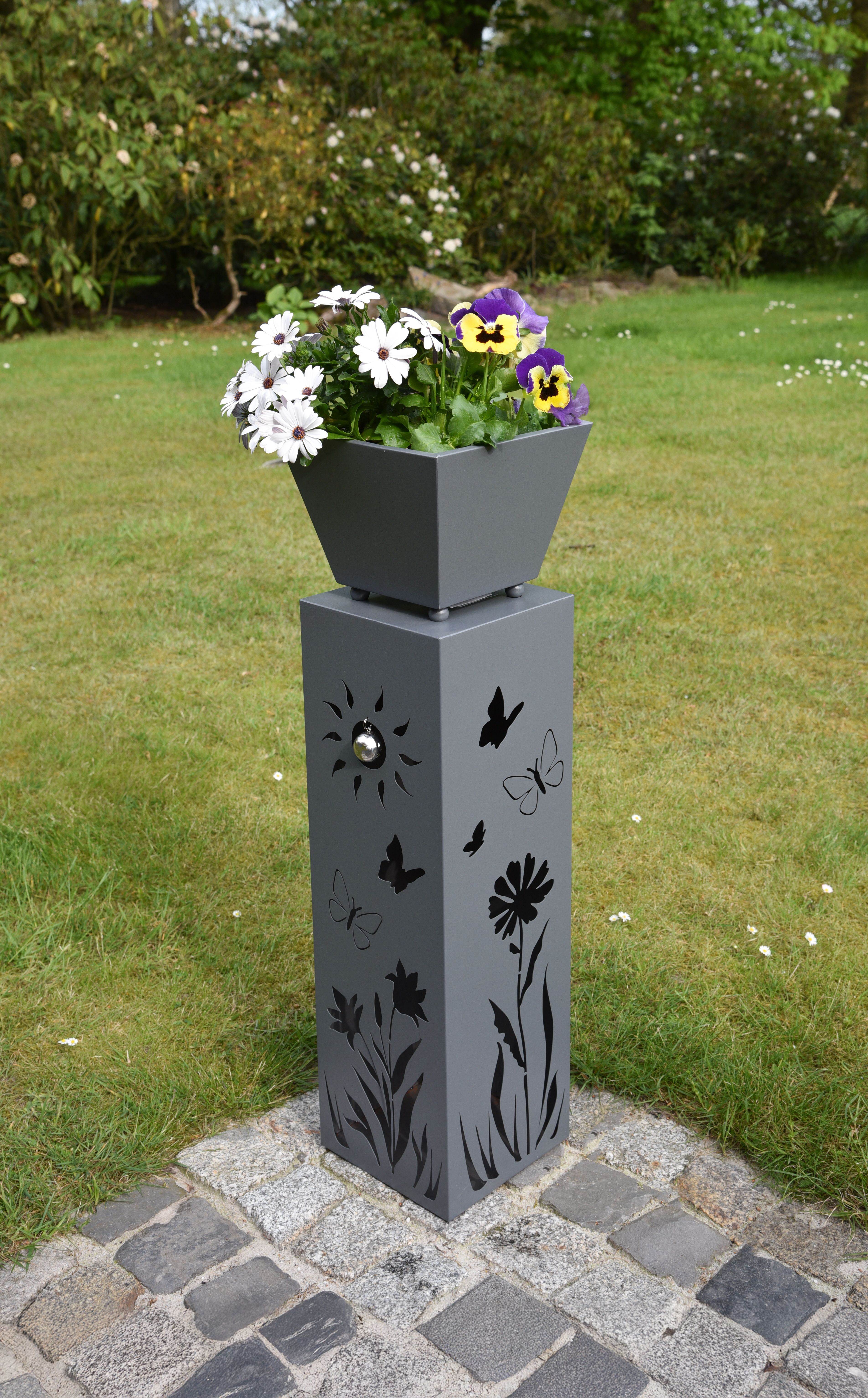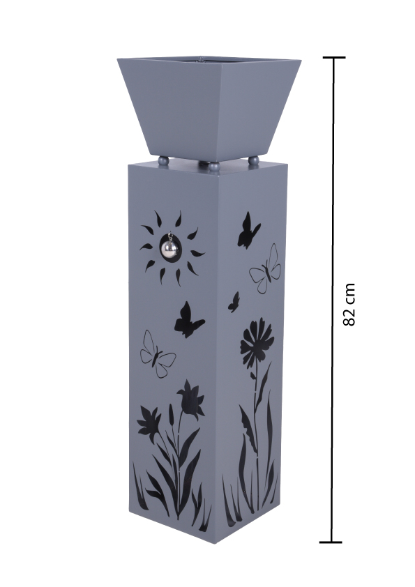 Unsere Pflanzsäule NOVELLA mit einem Blumenmotiv ist eine charmante Möglichkeit, Ihre Lieblingspflanzen in Ihrem Garten oder auf Ihrer Terrasse stilvoll zur Schau zu stellen. Die Pflanzsäule ist aus stabilem Stahl gefertigt und verfügt über eine elegante graue Oberfläche, die langlebig und witterungsbeständig ist.