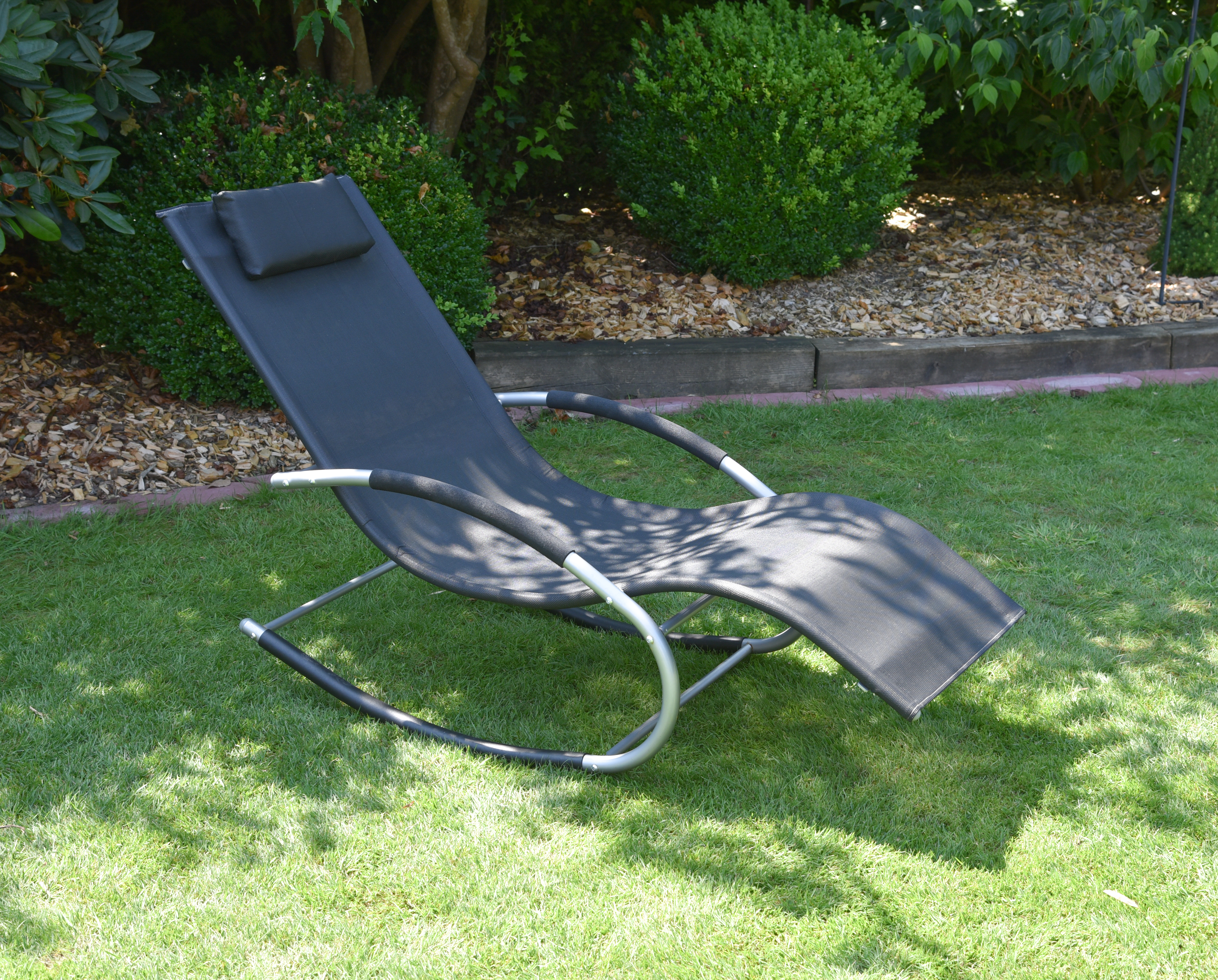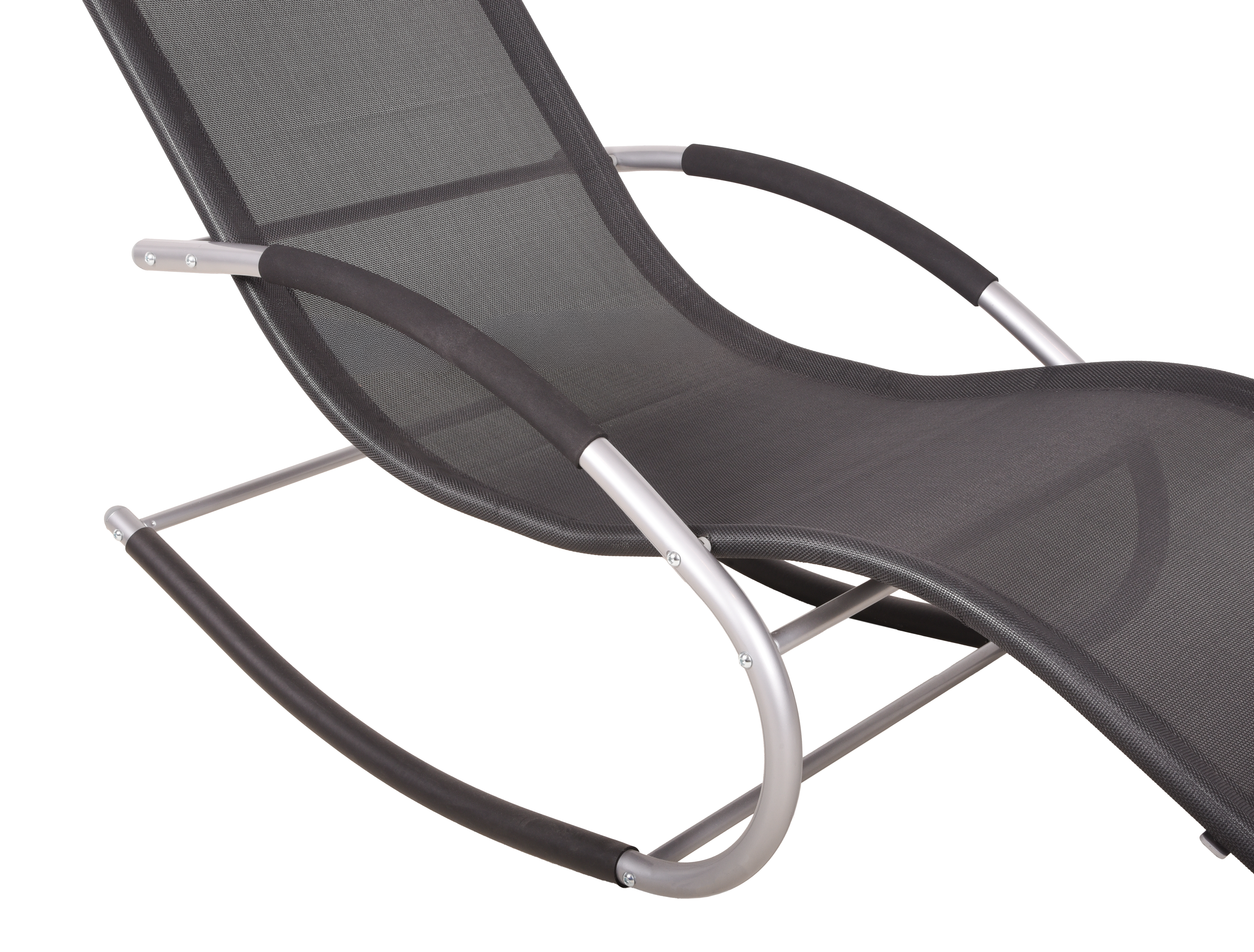 Die Sitzfläche und die Rückenlehne der Schaukelliege sind mit schwarzem Kunststoffgewebe im 2x1-Muster bezogen. Dieses Material ist nicht nur bequem, sondern auch langlebig und wetterbeständig, wodurch die Liege ideal für den Außenbereich geeignet ist.