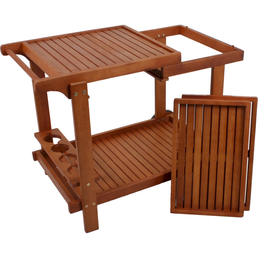 Der rollbare Servierwagen aus geöltem Eukalyptusholz läßt sich an der Handstange leicht anheben und im handumdrehen auf zwei Rädern verschieben.