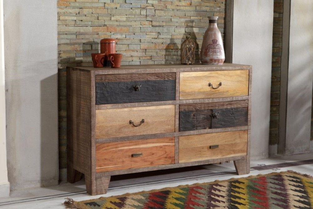 Unser Sideboard TARIM (84 cm) mit ihrer ausdrucksstarken Optik (Unikat-Look) aus mehreren Materialien (Akazie & Mango massiv recycled, MDF, Oberfläche lackiert) vereint Form und Funktion.