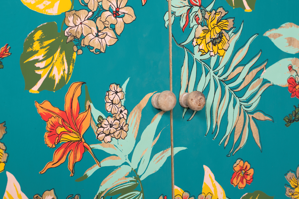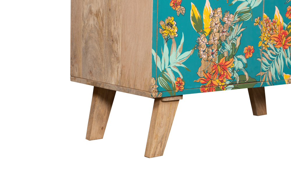 Unser Sideboard REIPUR (Materialmix Mango massiv & MDF, lackiert) mit seiner ausdrucksstarken Optik (Aufdruck mit bunter Pflanzenoptik) beeindruckt durch sein individuelles Design und vereint Form und Funktion.