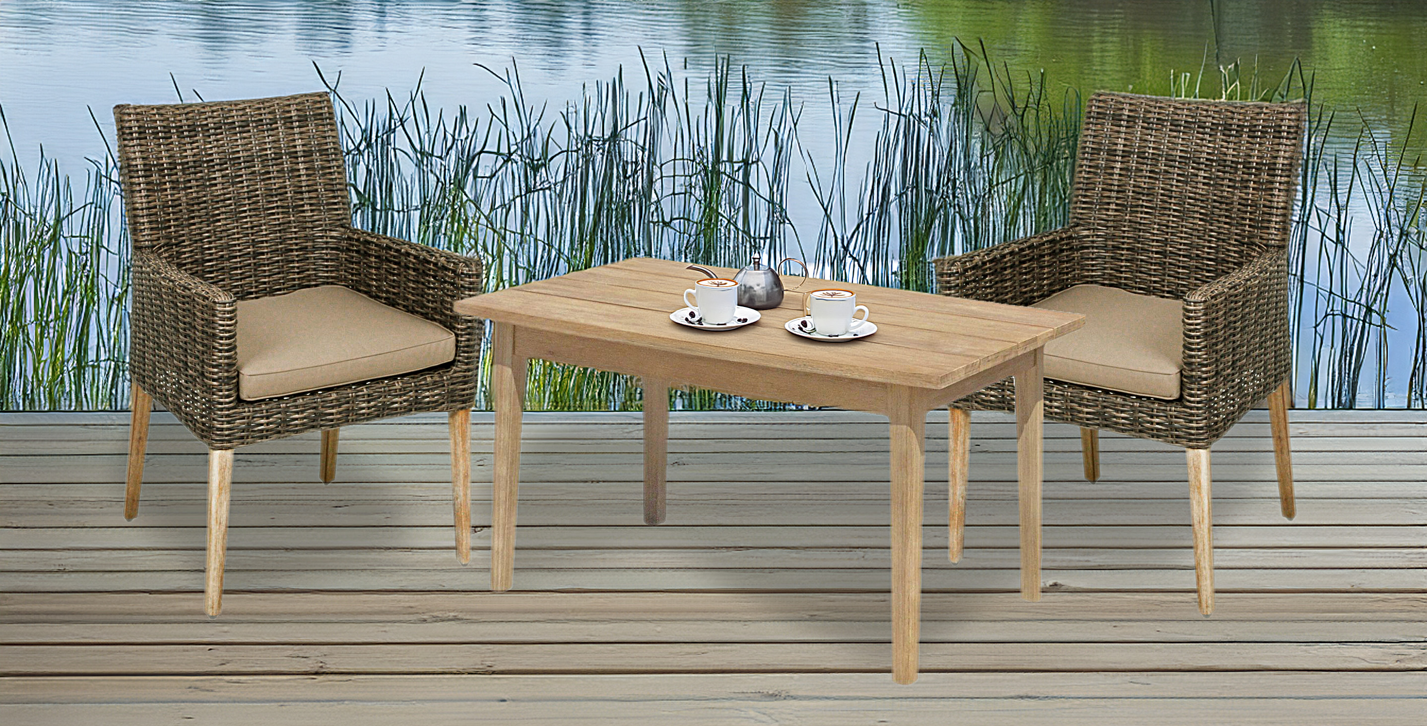 Der Tisch PUEBLO besteht aus FSC-zertifizierter Akazie in brushed wash und bietet ausreichend Platz für Mahlzeiten oder Getränke im Freien. Diese kompakte Sitzgruppe umfasst einen Tisch und zwei Stühle, die eine gemütliche und stilvolle Outdoor-Sitzlösung für Mahlzeiten und Entspannung im Freien bieten. Genießen Sie Luxus und Komfort auf Ihrem Balkon, Ihrer Terrasse oder Ihrem kleinen Garten mit der NORVELL/PUEBLO Sitzgruppe.