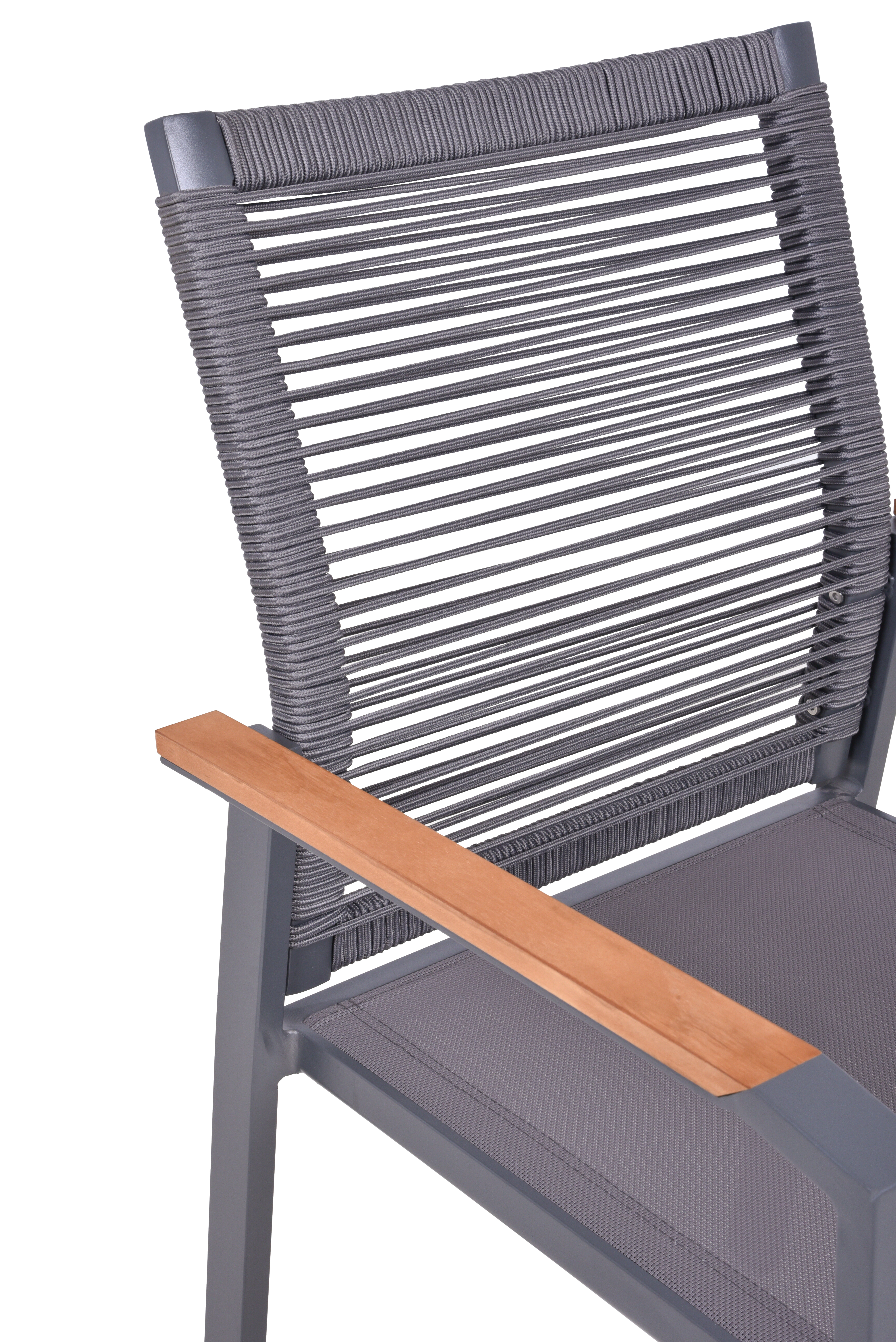 Die Teakholzarmlehnen, die zu 100% aus FSC-zertifiziertem Holz stammen, verleihen dem Stapelstuhl DAVINA eine natürliche Note und ein warmes, einladendes Gefühl. Darüber hinaus können Sie die Stühle bei Bedarf stapeln, was sie besonders platzsparend und praktisch macht. Der Stapelstuhl DAVINA ist perfekt für Terrassen, Gärten und andere Außenbereiche geeignet und bietet eine stilvolle und bequeme Sitzgelegenheit mit hochwertigen Materialien für entspannte Momente im Freien.