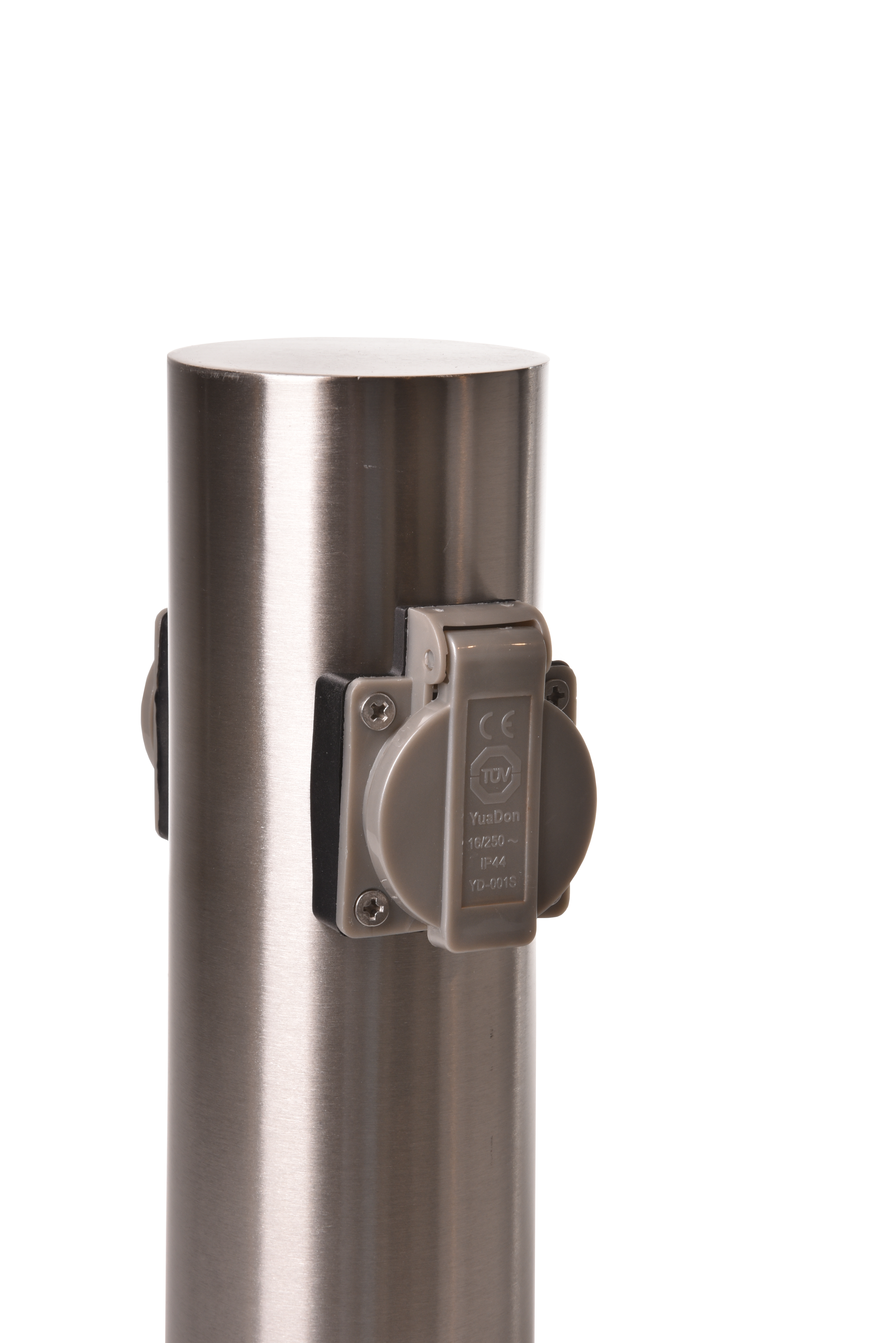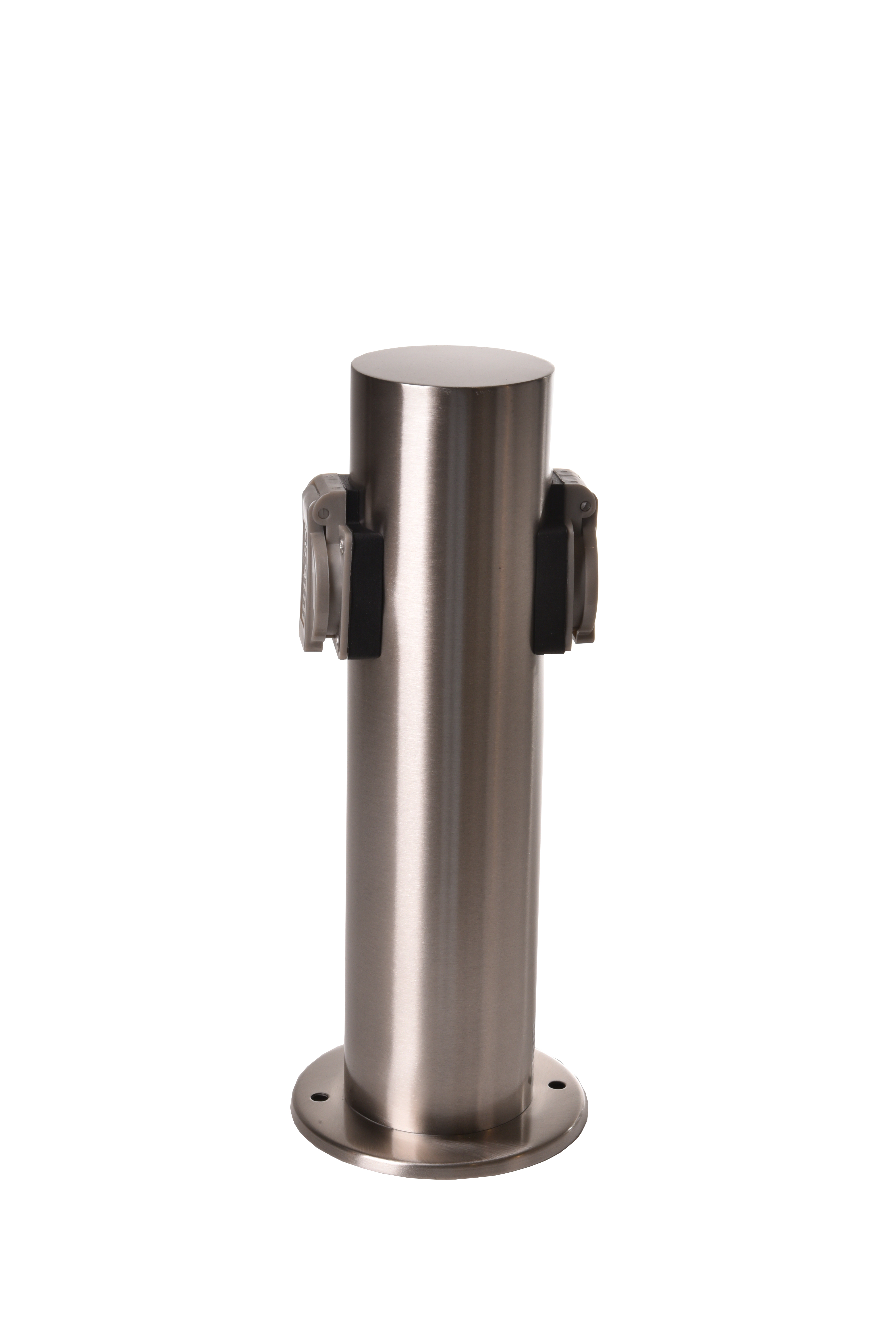 Die Steckdosensäule mit silberner Klarlackbeschichtung und Edelstahlkonstruktion ist eine praktische Lösung für den Außenbereich. Der runde Edelstahlkörper verleiht ihr ein modernes und ansprechendes Erscheinungsbild, das zu verschiedenen Umgebungen passt.