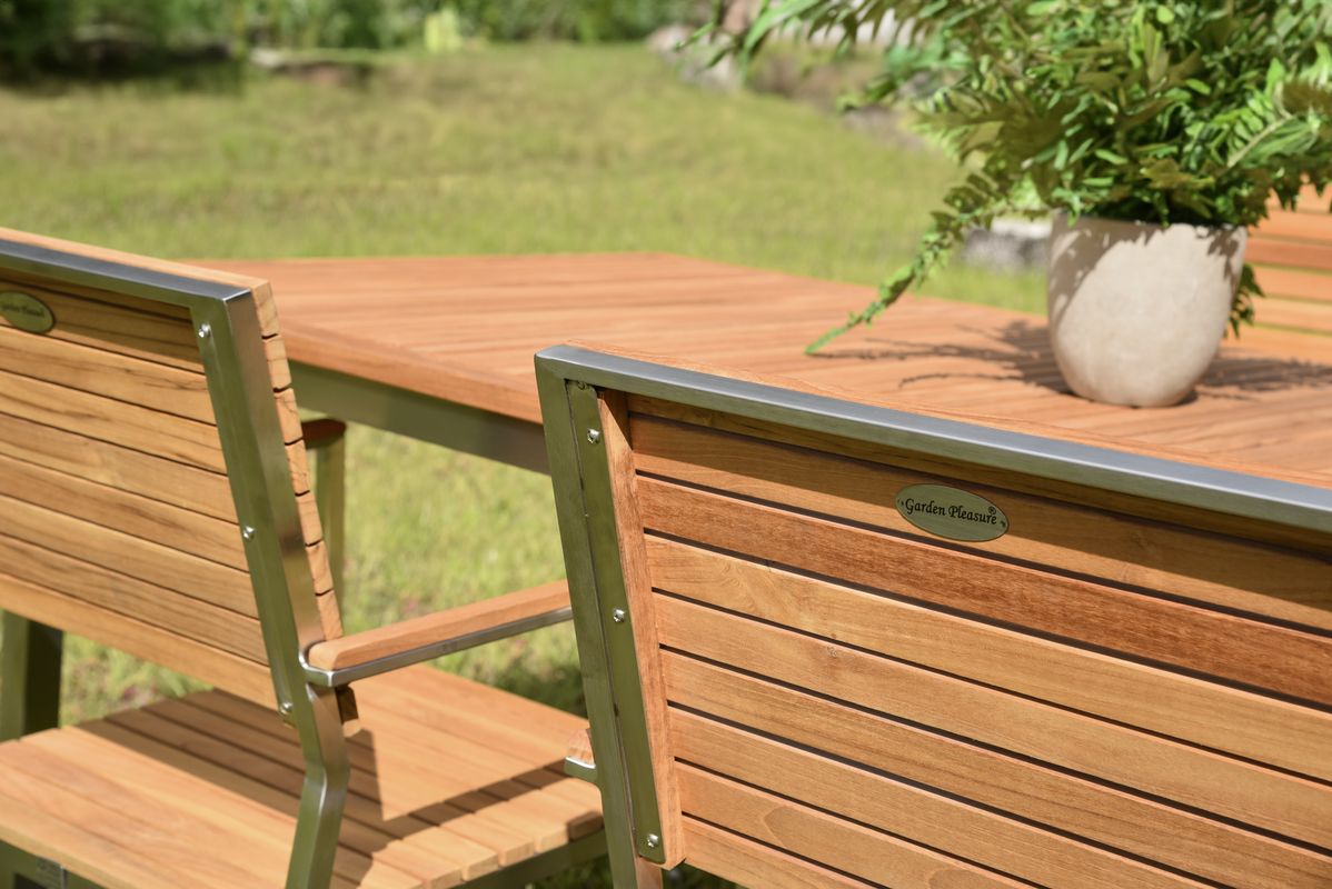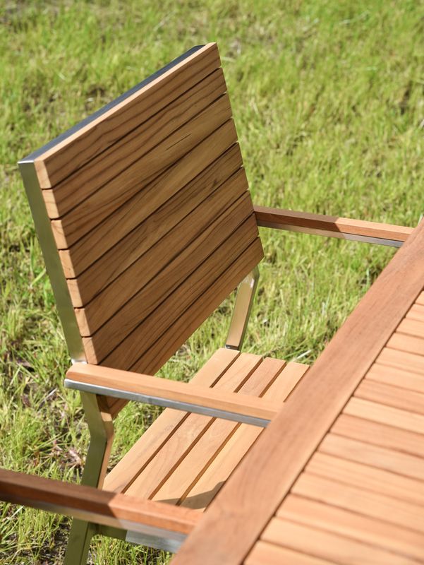 Die Kombination aus robustem Edelstahl und natürlichem Teakholz verleiht dem Tisch eine zeitlose Schönheit und macht ihn zu einem Blickfang in jedem Raum.