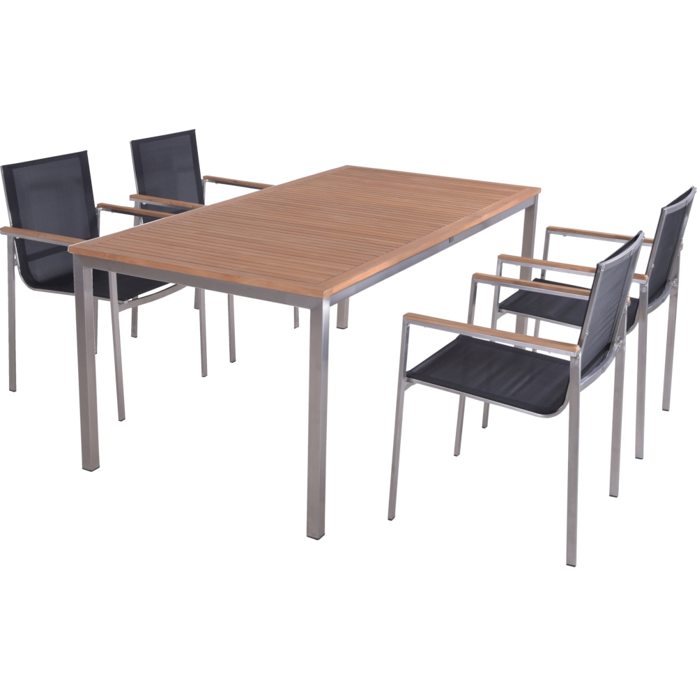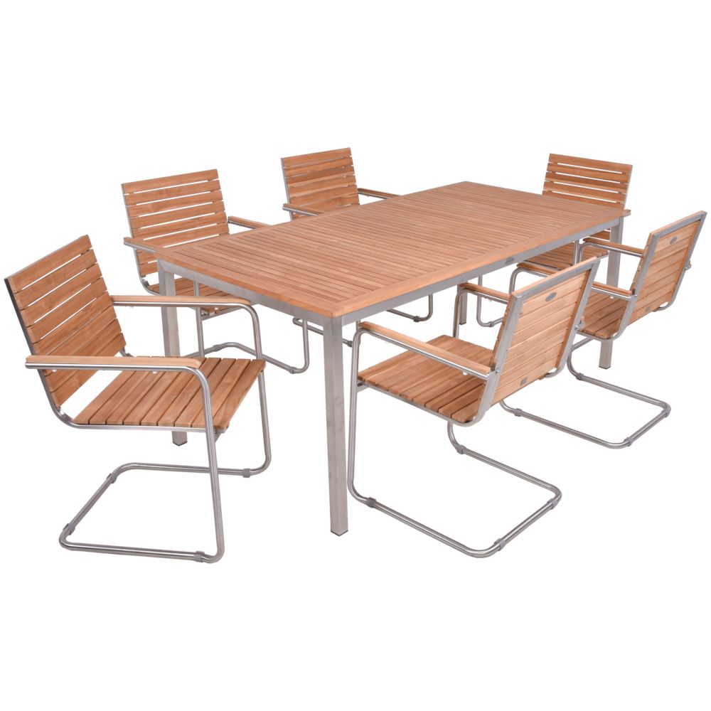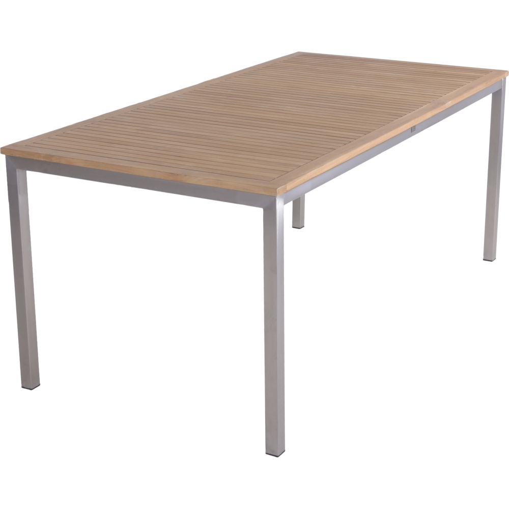 Der Tisch DENVER ist ein elegantes Möbelstück, das mit seinem silbernen Edelstahlgestell und der geölten Teakholzplatte überzeugt.