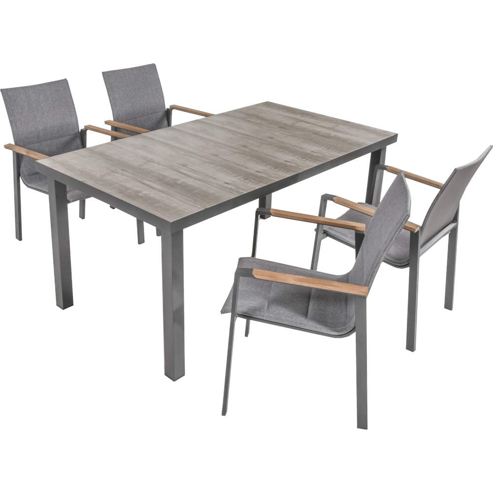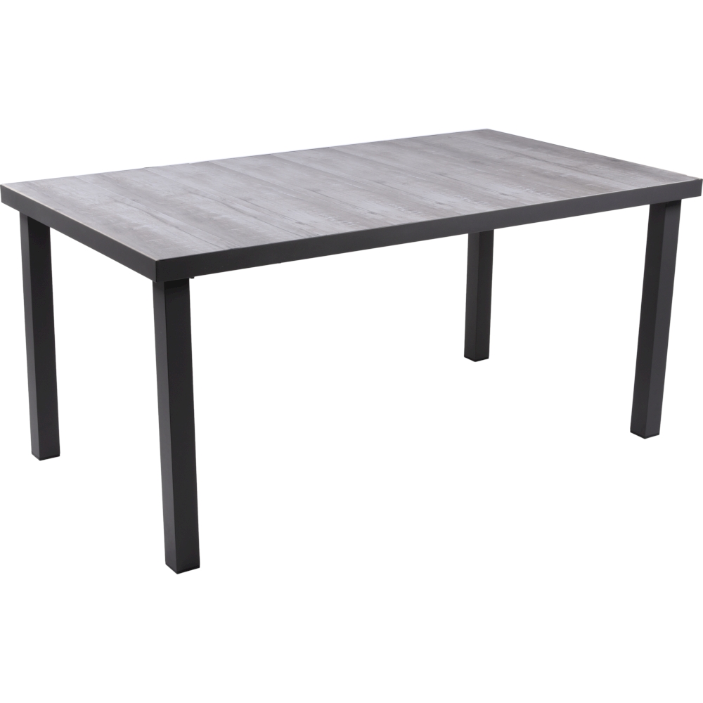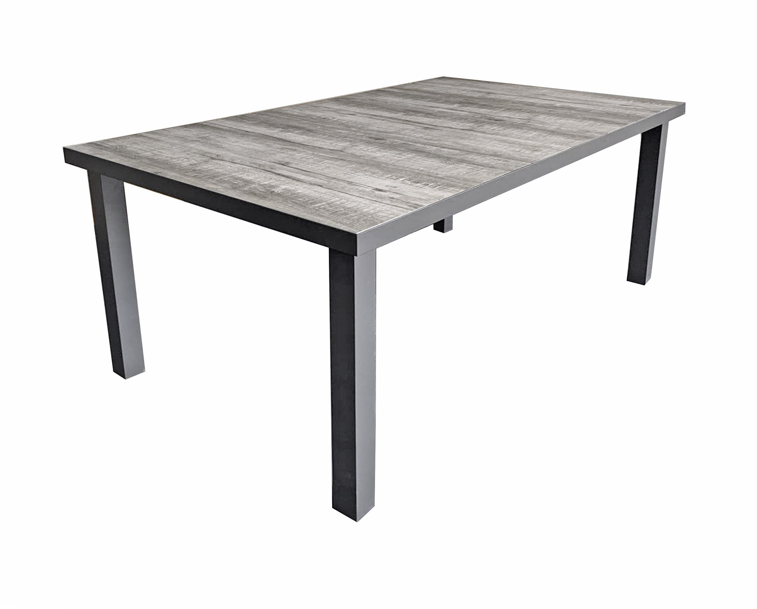 Der Tisch RANA verfügt über ein robustes Gestell aus pulverbeschichtetem Aluminium in dunkelgrau, was nicht nur für Stabilität, sondern auch für Wetterbeständigkeit sorgt. Die Tischplatte ist mit Keramik in Eiche-Optik belegt, was dem Tisch einen Hauch von Natürlichkeit und einen rustikalen Charme verleiht. Die Keramik-Tischplatte ist strapazierfähig und pflegeleicht.