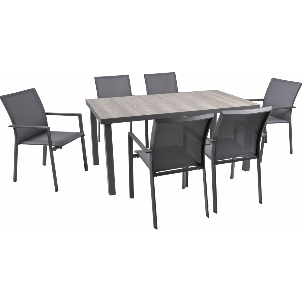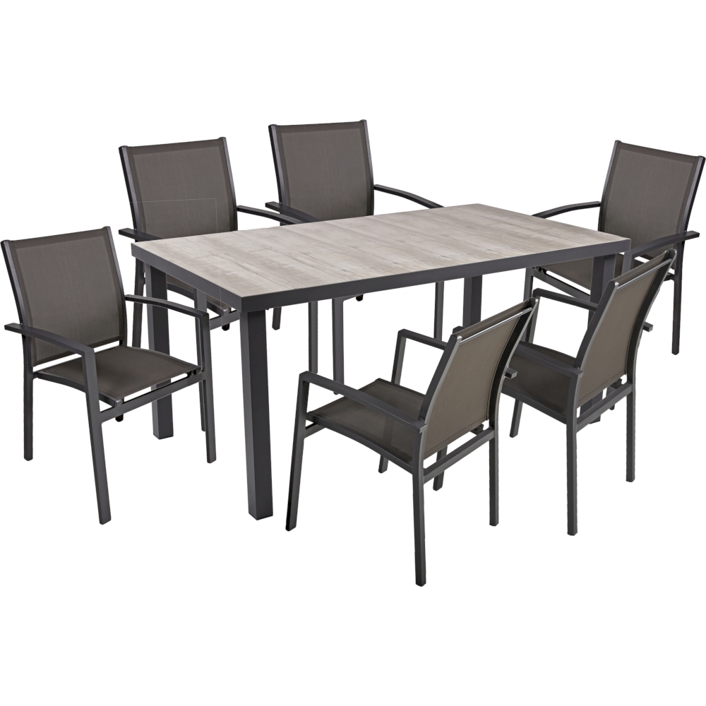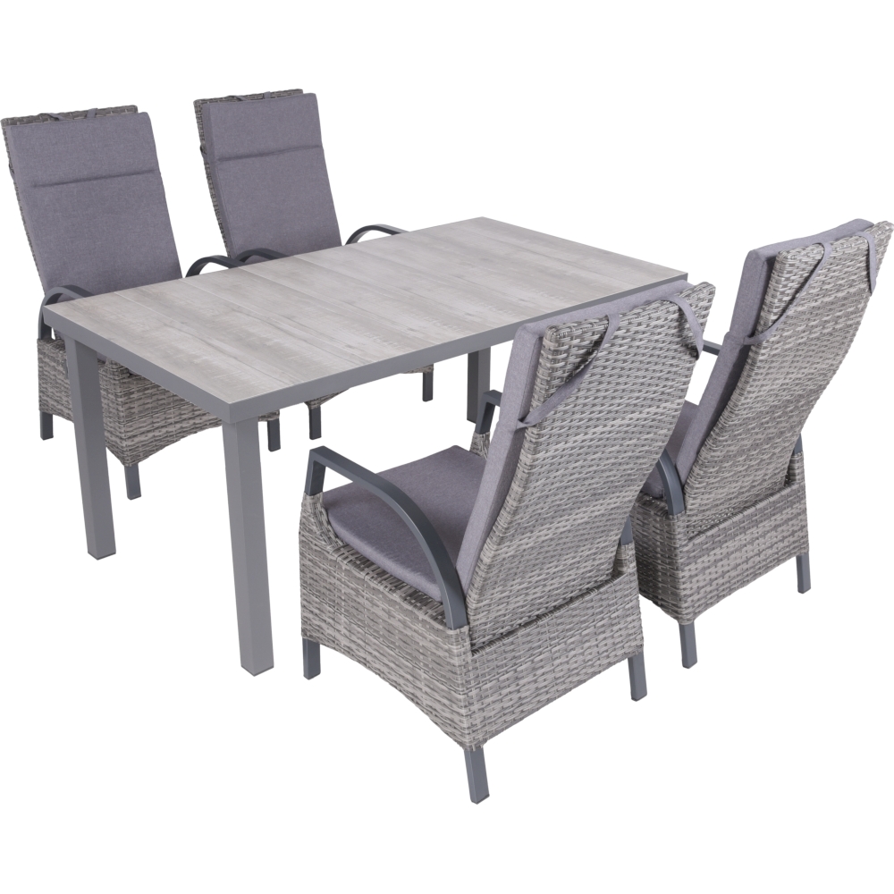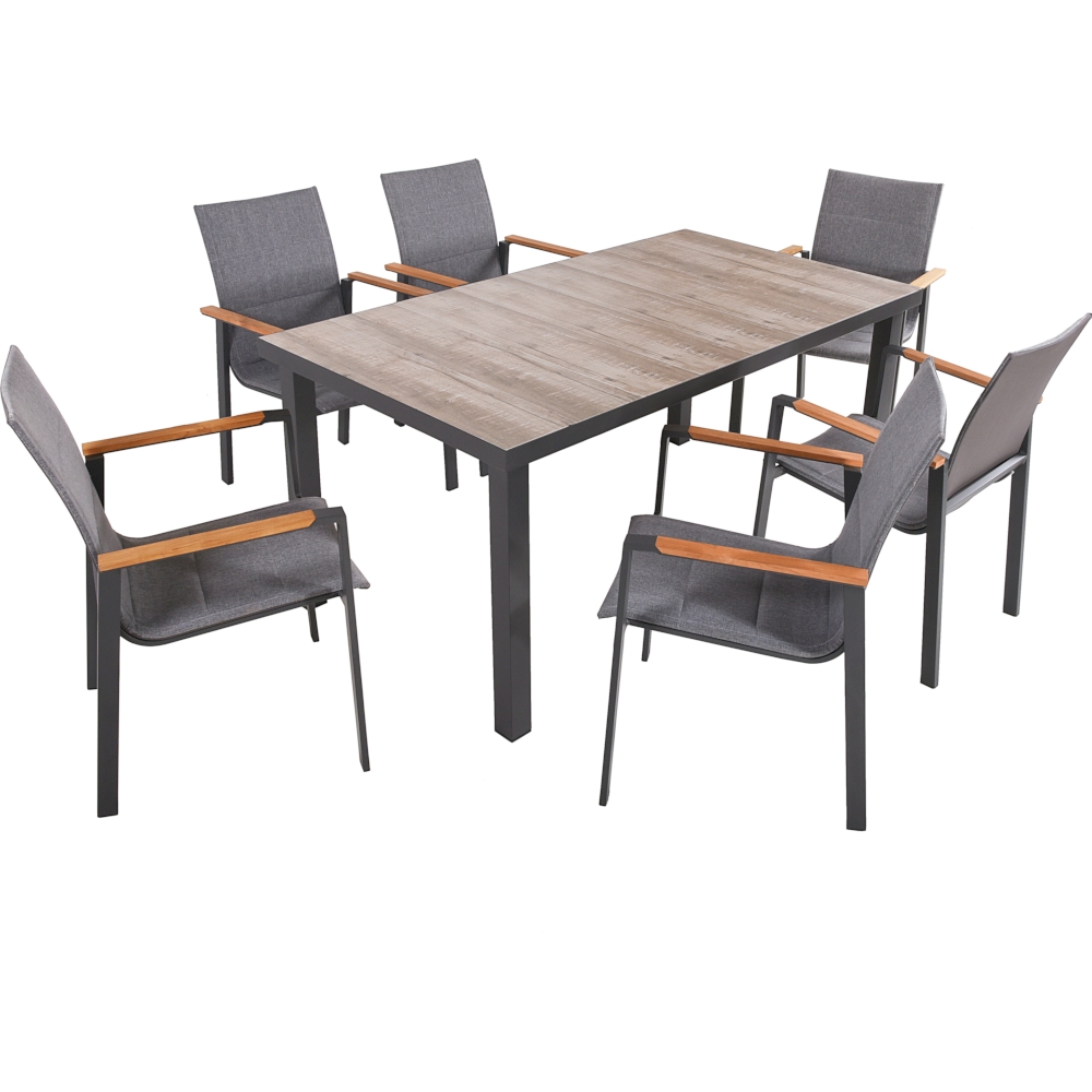 Der Tisch RANA verfügt über ein robustes Gestell aus pulverbeschichtetem Aluminium in dunkelgrau, was nicht nur für Stabilität, sondern auch für Wetterbeständigkeit sorgt. Die Tischplatte ist mit Keramik in Eiche-Optik belegt, was dem Tisch einen Hauch von Natürlichkeit und einen rustikalen Charme verleiht. Die Keramik-Tischplatte ist strapazierfähig und pflegeleicht.