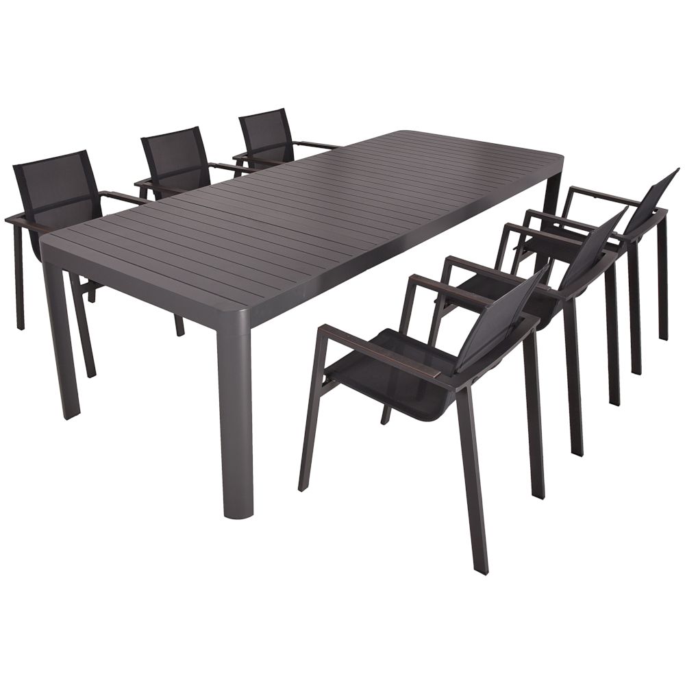 Die Tischgruppe AMIRA ist eine moderne und vielseitige Lösung, um Ihren Innen- oder Außenbereich stilvoll und komfortabel zu gestalten. Dieses Set besteht aus einem Ausziehtisch AMIRA aus pulverbeschichtetem Anthrazit-Aluminium und acht Stapelstühlen SOPHIA im pfefferschwarzen Industrial-Design.