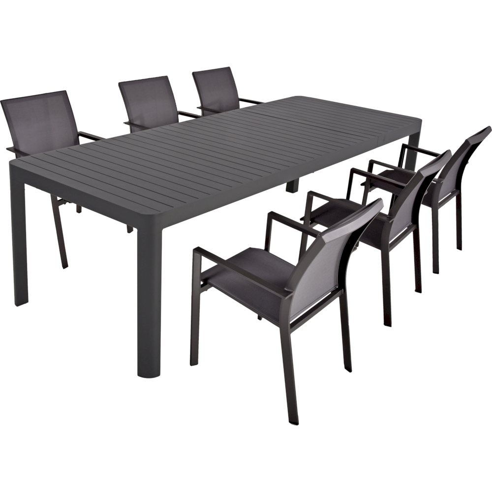 Die Tischgruppe AMIRA ist eine moderne und vielseitige Lösung, um Ihren Innen- oder Außenbereich stilvoll und komfortabel zu gestalten. Dieses Set besteht aus einem Ausziehtisch AMIRA aus pulverbeschichtetem Anthrazit-Aluminium und acht Stapelstühlen RANA.