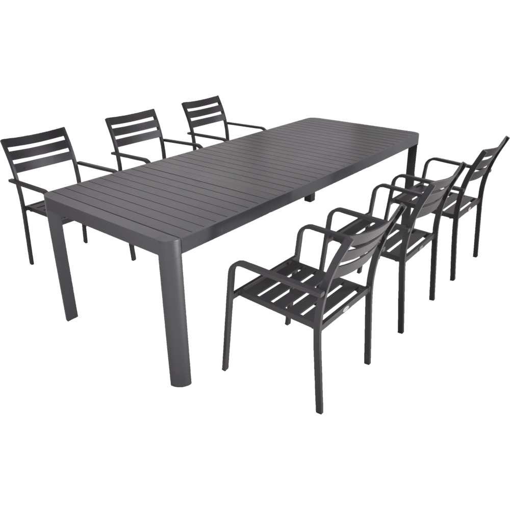 Die Tischgruppe AMIRA ist eine elegante und praktische Lösung, um Ihren Innen- oder Außenbereich stilvoll und komfortabel zu gestalten. Dieses Set besteht aus einem Ausziehtisch AMIRA aus pulverbeschichtetem Anthrazit-Aluminium und sechs Stühlen TREVISO.