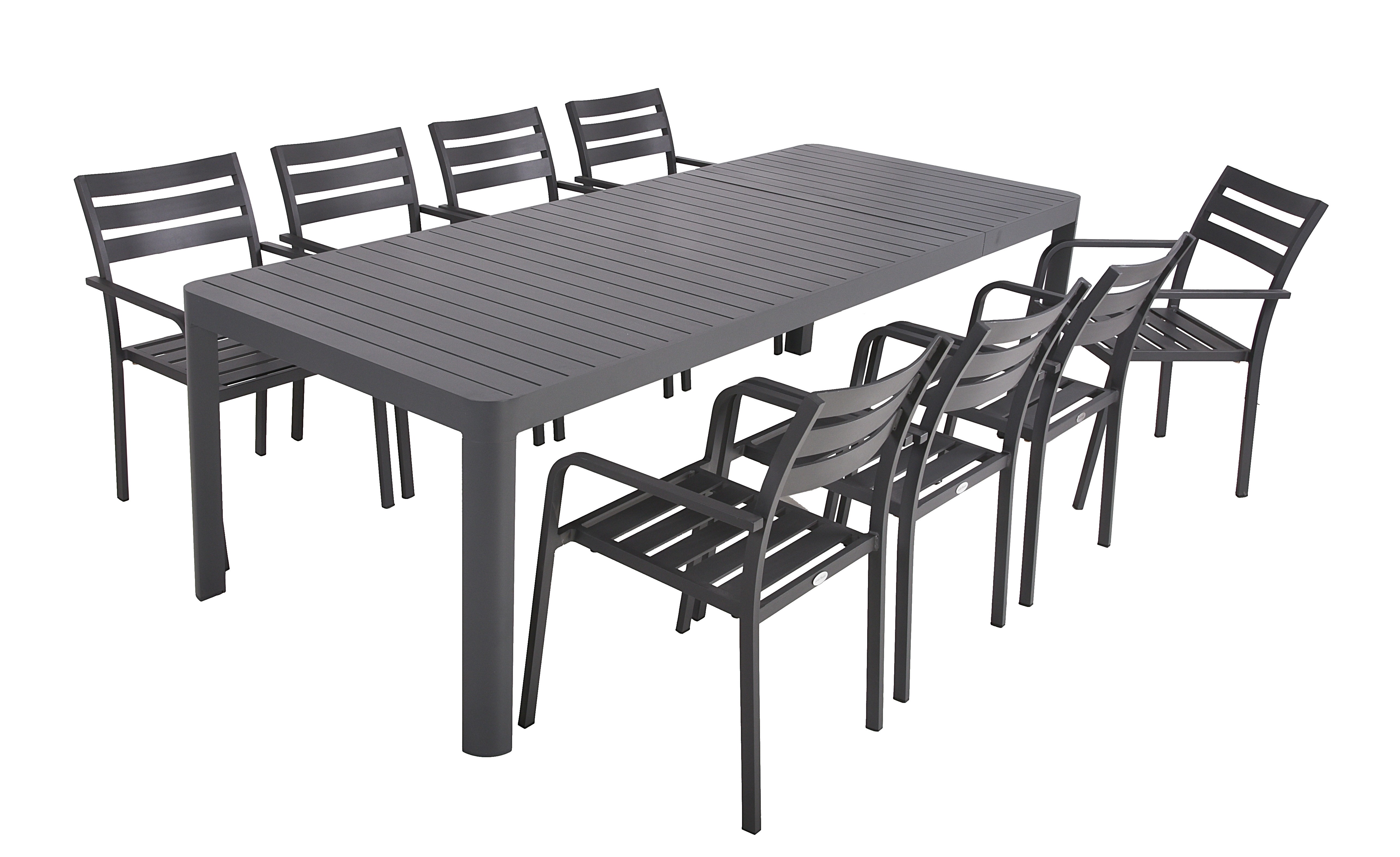 Die Tischgruppe AMIRA ist eine elegante und praktische Lösung, um Ihren Innen- oder Außenbereich stilvoll und komfortabel zu gestalten. Dieses Set besteht aus einem Ausziehtisch AMIRA aus pulverbeschichtetem Anthrazit-Aluminium und sechs Stühlen TREVISO.