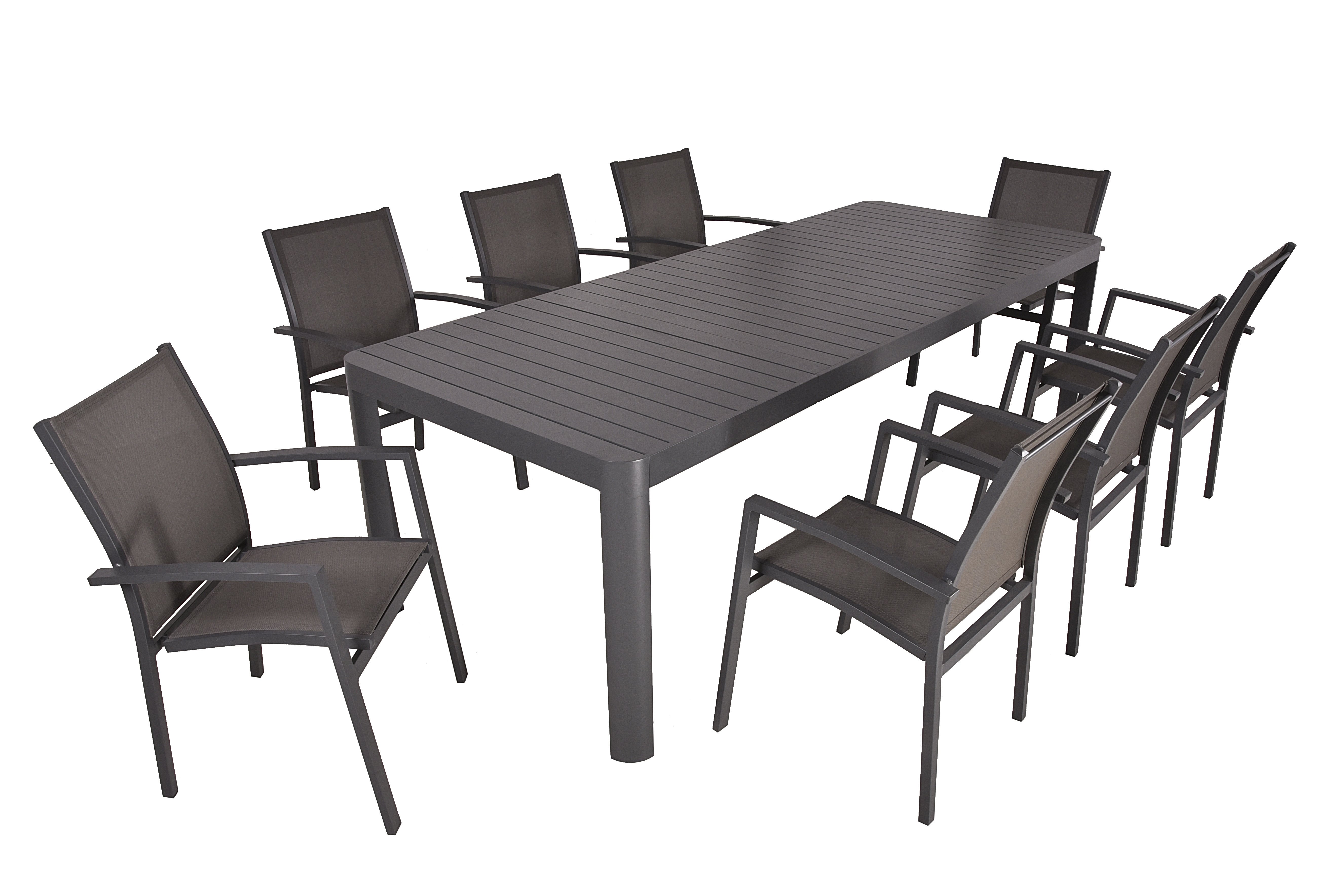 Die Tischgruppe AMIRA ist eine moderne und vielseitige Lösung, um Ihren Innen- oder Außenbereich stilvoll und komfortabel zu gestalten. Dieses Set besteht aus einem Ausziehtisch AMIRA aus pulverbeschichtetem Anthrazit-Aluminium und acht Stapelstühlen ELENA.
