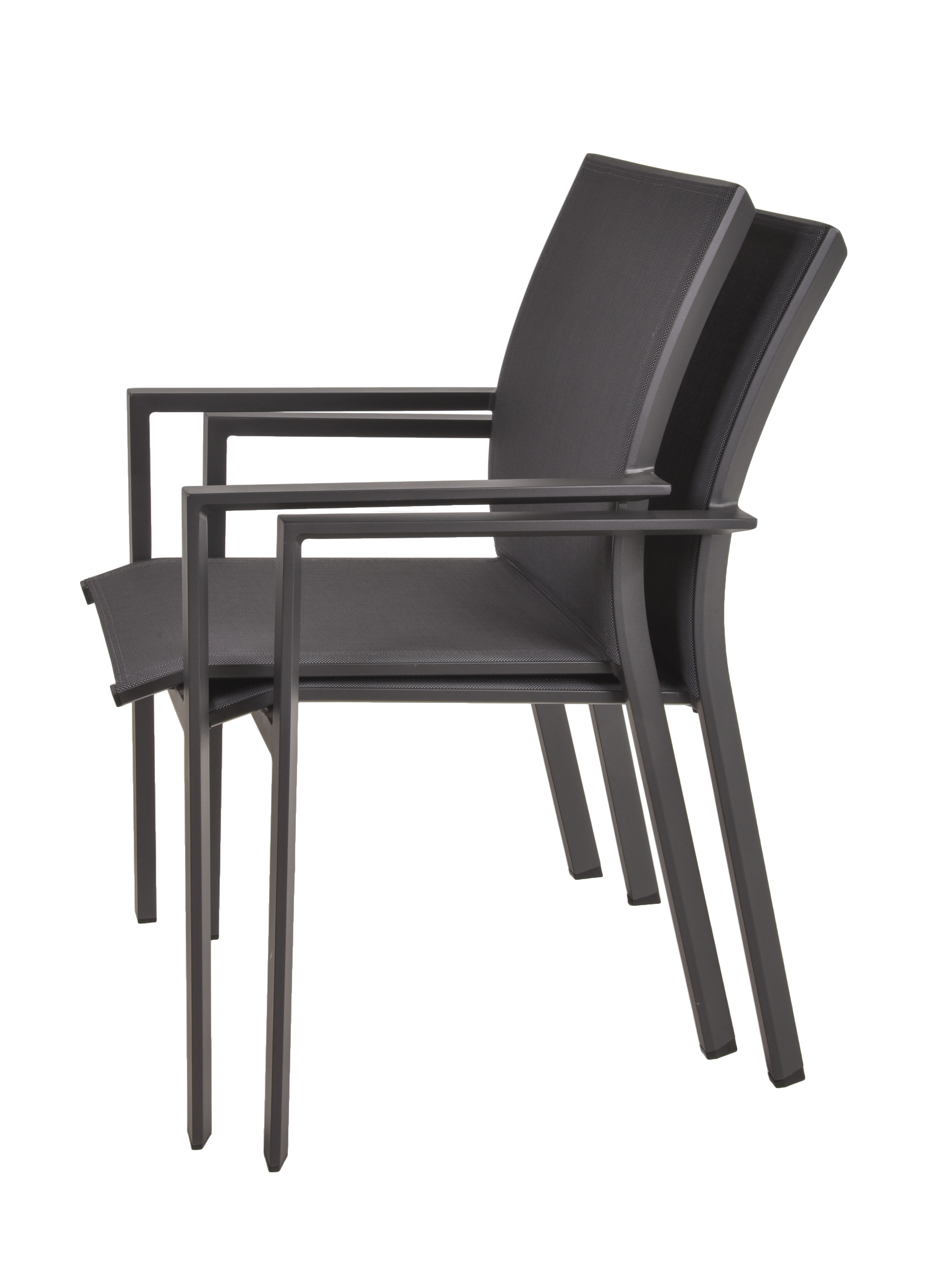 Die acht Stapelstühle ELENA sind aus Aluminium gefertigt und verfügen über Sitzflächen aus dunkelgrauem Kunststoffgewebe. Diese Stühle sind leicht und dennoch stabil, was für eine lange Lebensdauer sorgt. Die Stapelfunktion der Stühle erleichtert die Lagerung und Handhabung, insbesondere wenn sie nicht in Gebrauch sind.