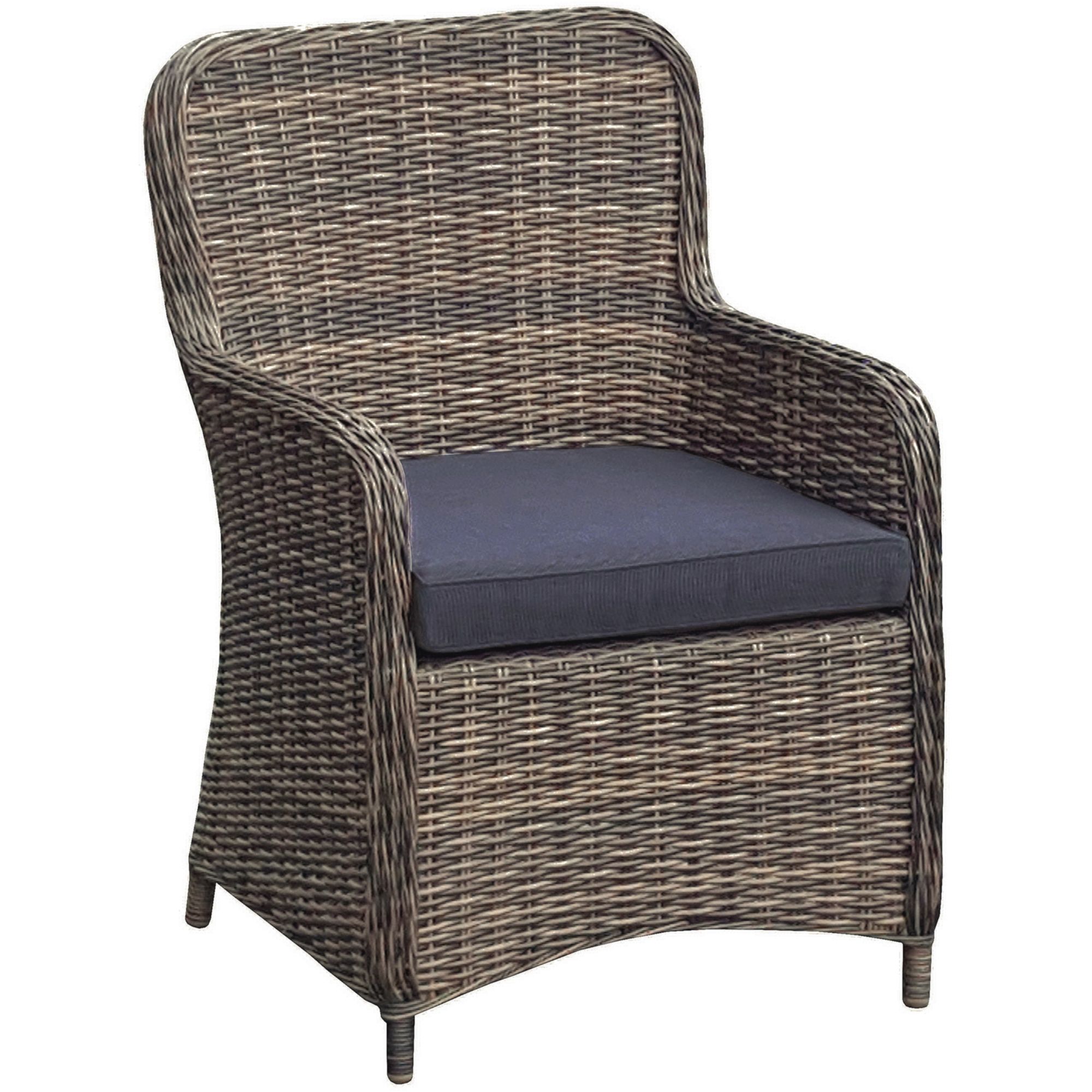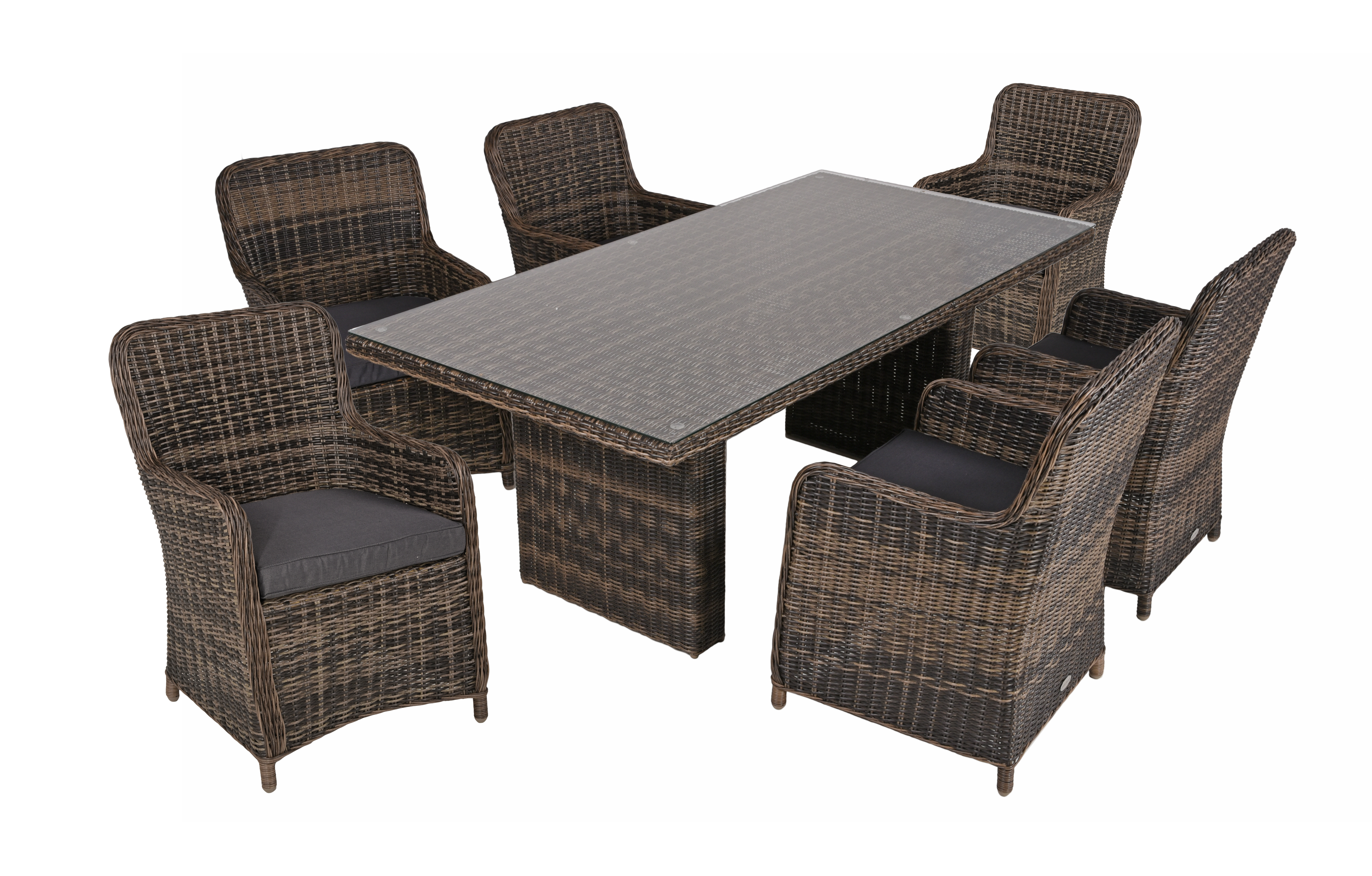 Die sechs Sessel BORDEAUX sind aus pulverbeschichtetem Stahl gefertigt und verfügen über ein kunstvoll gestaltetes nelkenbraunes Kunststoffgeflecht in halbrundem und rundem Design. Die Sessel sind mit Auflagen ausgestattet, die für zusätzlichen Sitzkomfort sorgen.